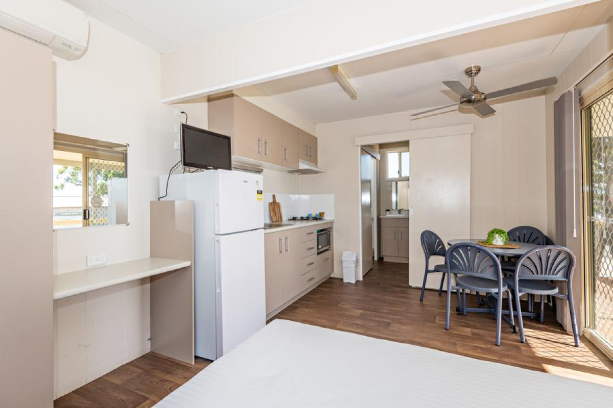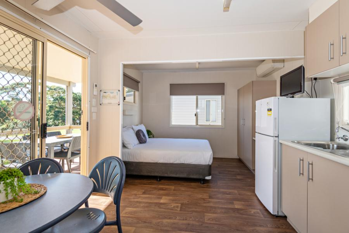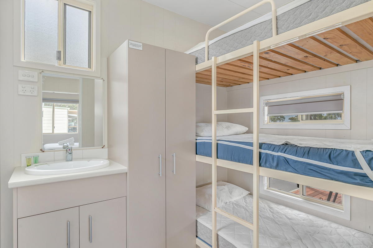 The cabin includes queen bed and a second room with triple bunks that are suitable for children only. The cabin includes a bathroom, reverse cycle air-conditioning, and all linen is provided.
