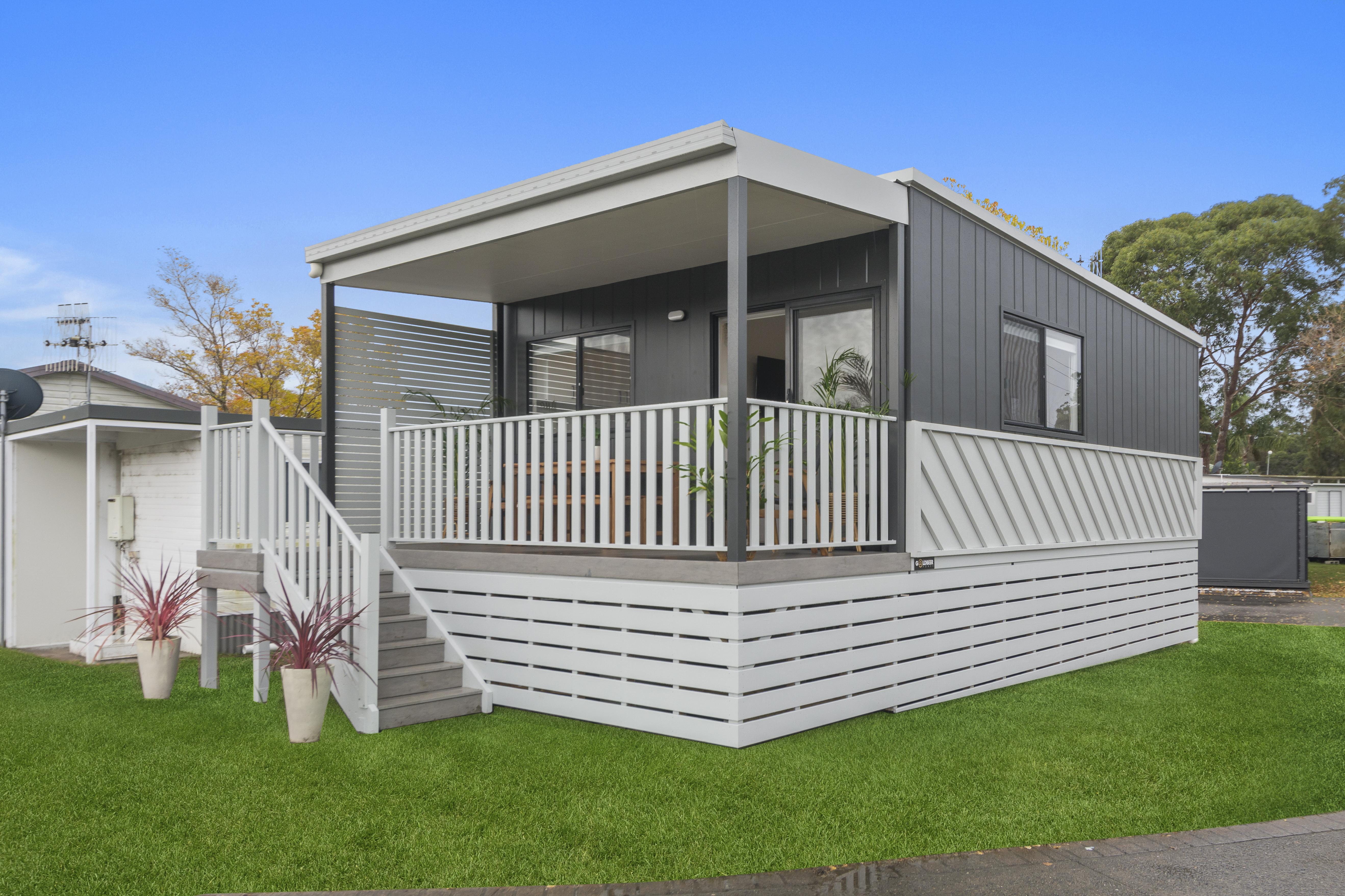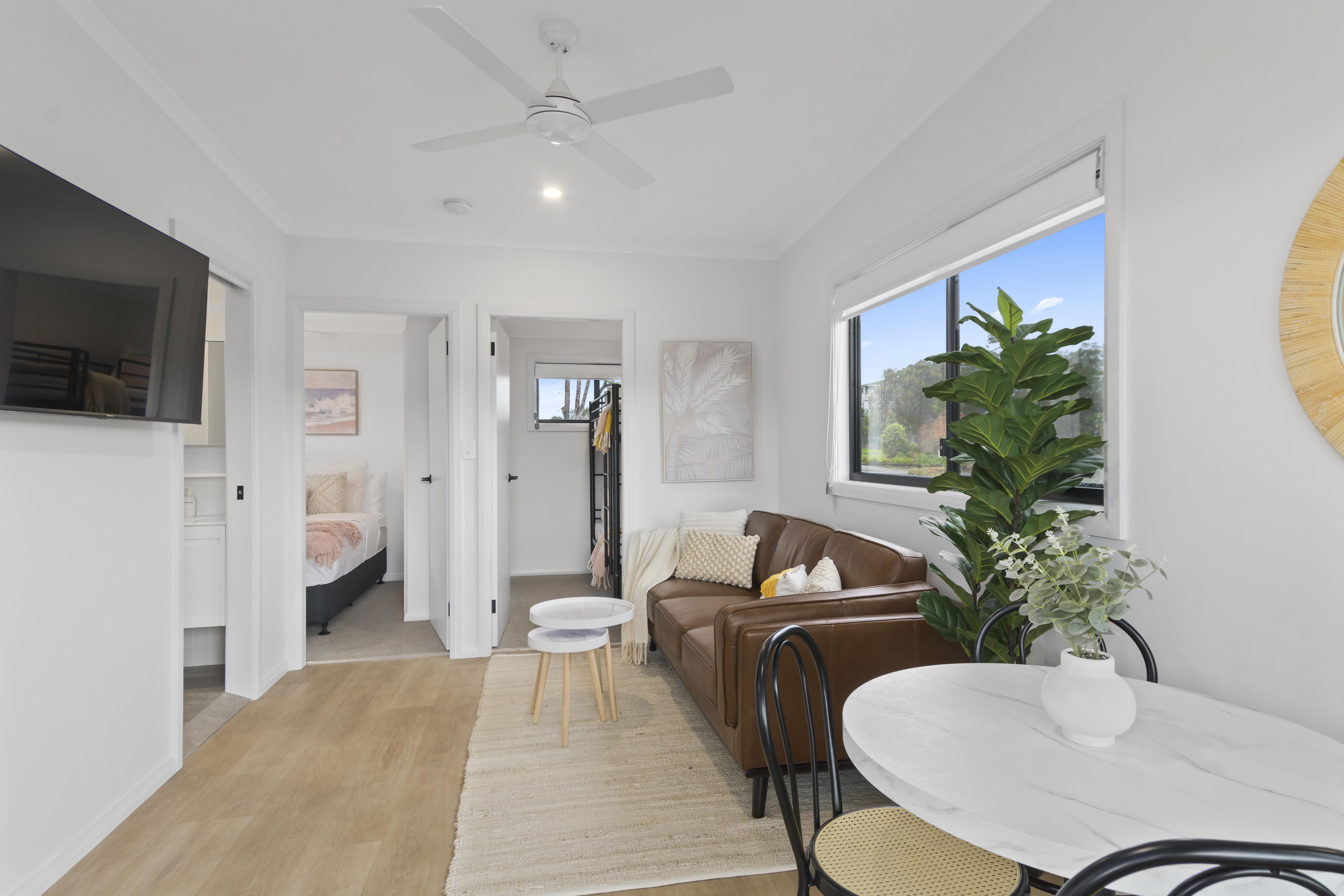 The 2 Bedroom Family Cabin sleeps up to 4 guests, with a queen bed in the main bedroom and a bunk in the second bedroom, as well as a bathroom, living area, kitchen, laundry facilities and a private deck with BBQ.