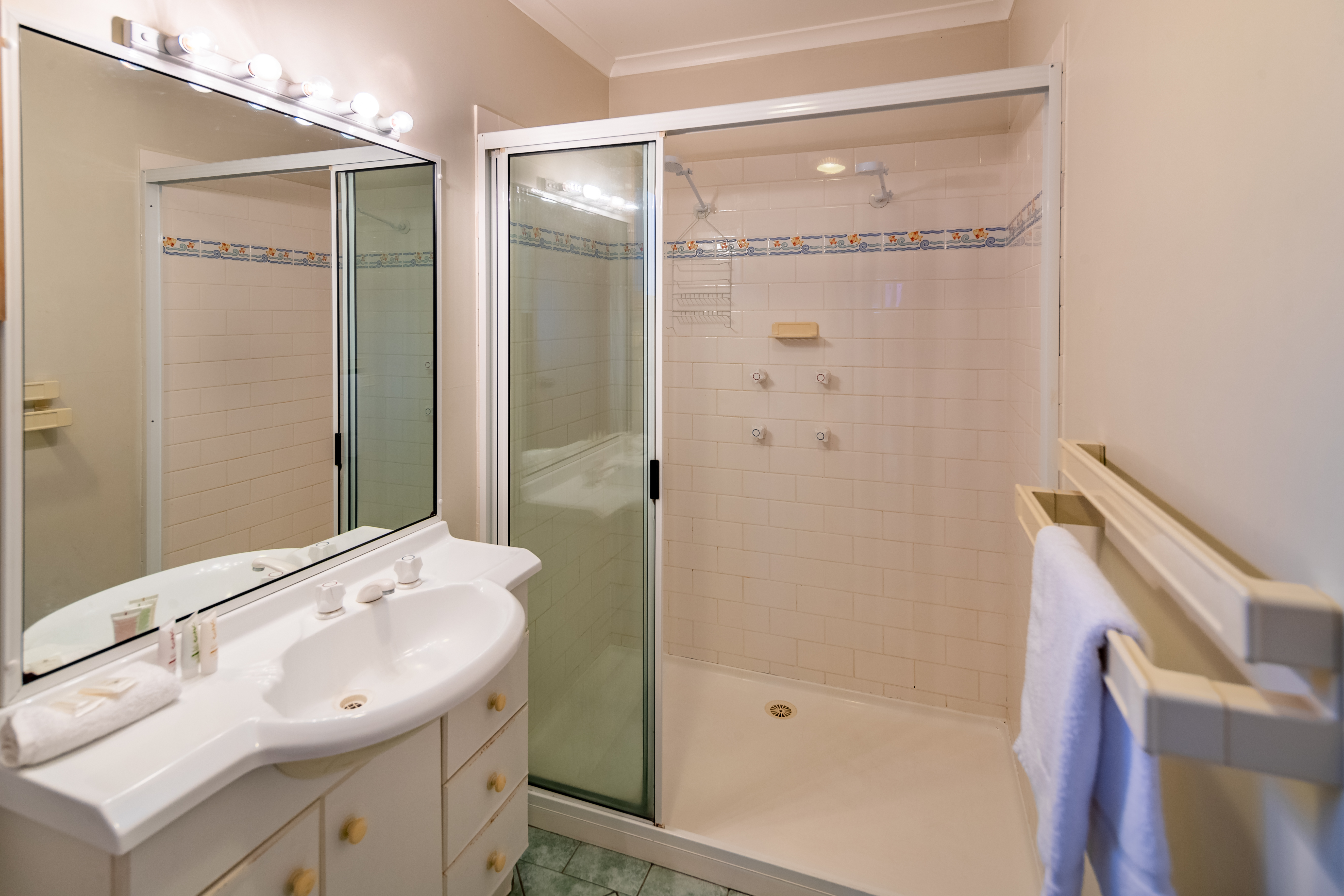 This two-bedroom villa is perfect for a comfortable stay with everything you need, with close beach access. Bedroom 1 has a queen bed, and bedroom 2 has one single bunk bed and a single bed, sleeping 5 people. This room features a large double shower with an open planned living area including a full kitchen, gas stove and dishwasher, dining and lounge area. The front veranda has garden views.