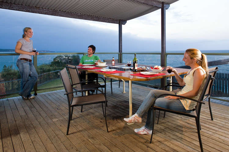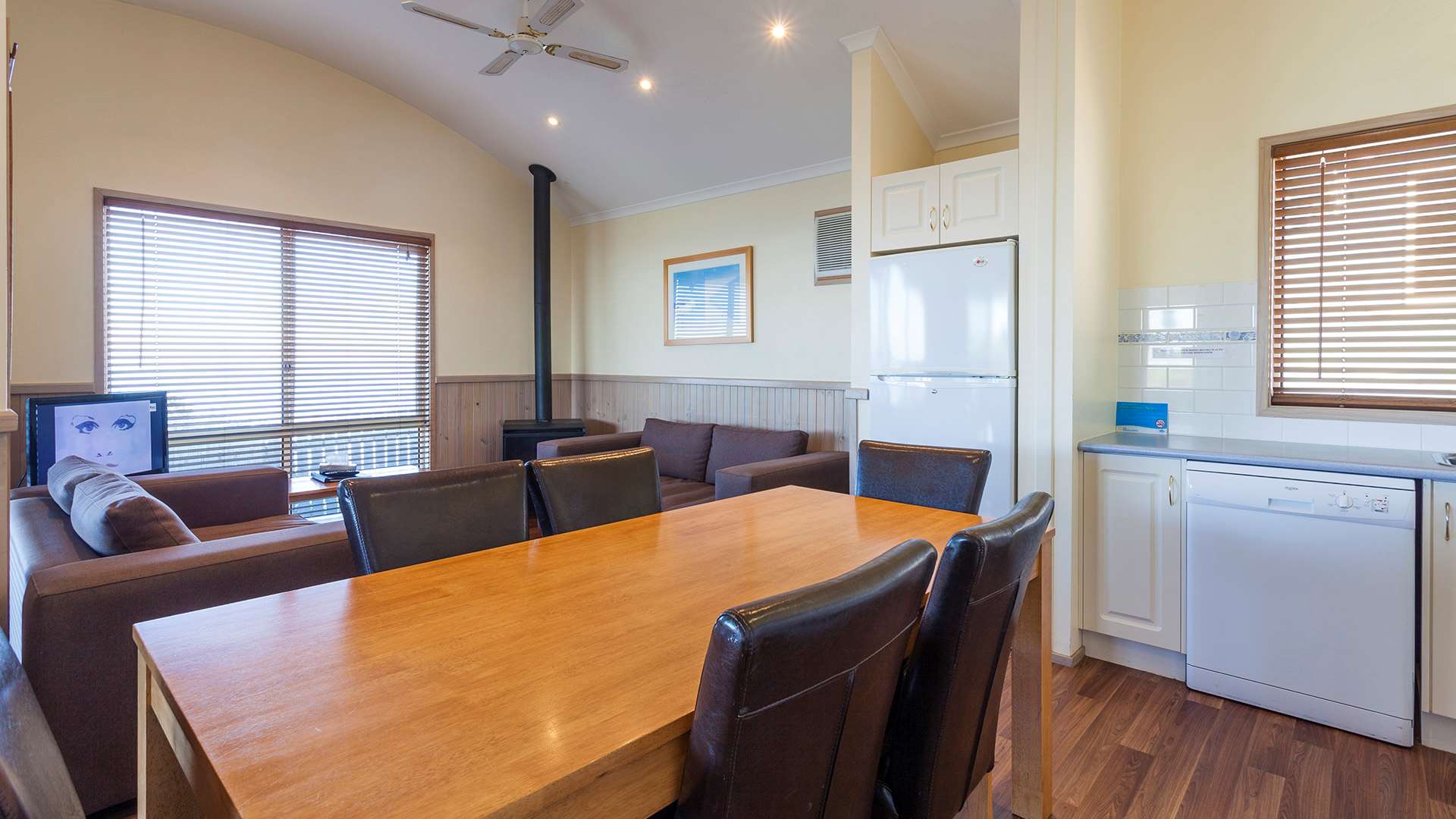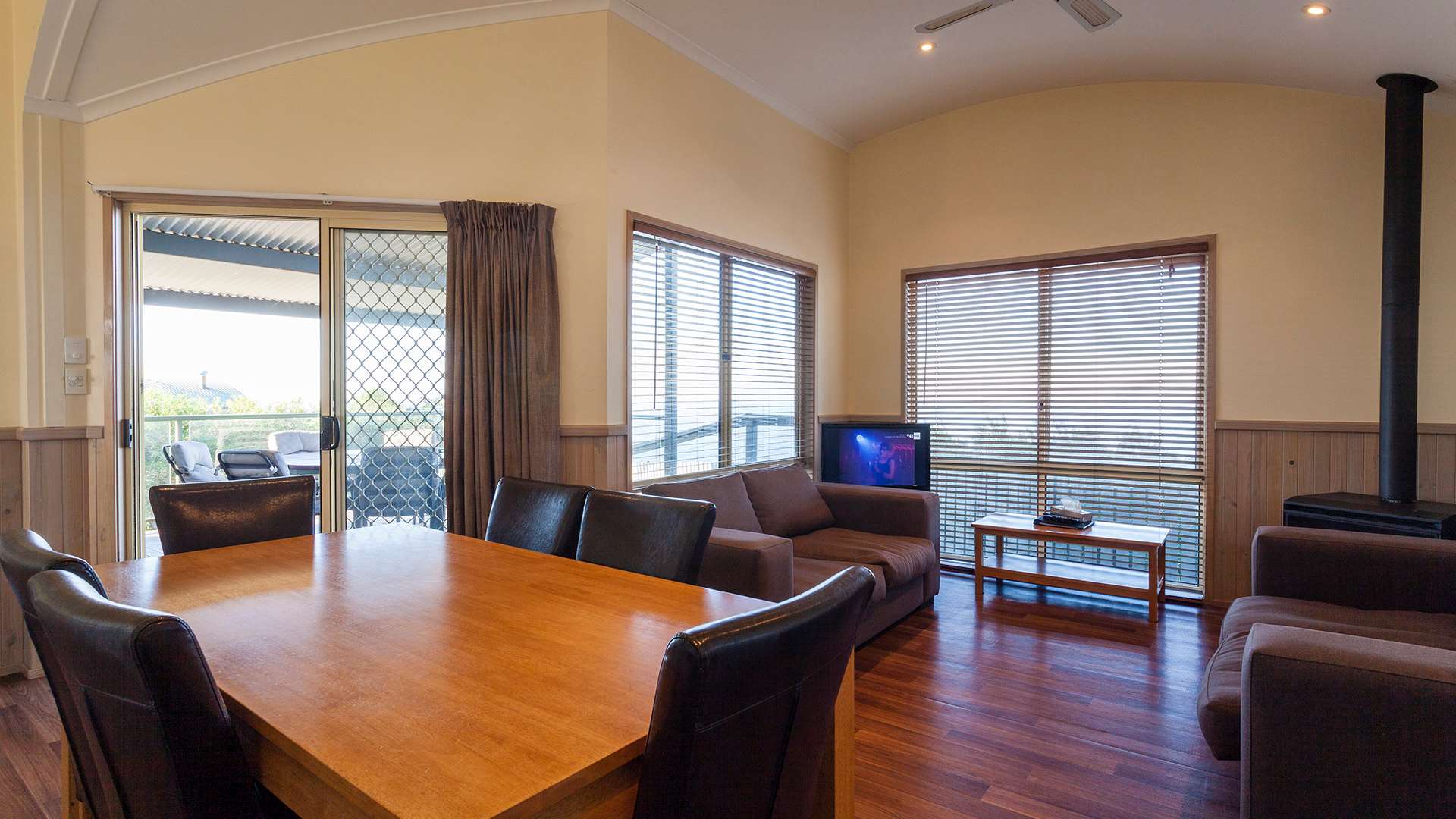 One queen, one double and one single bunk. Features full kitchen; dining and lounge with wood fireplace; bathroom with spa and separate toilet; 2 TVs; Veranda, BBQ and outdoor dining. One parking space with ramp access.Availability
