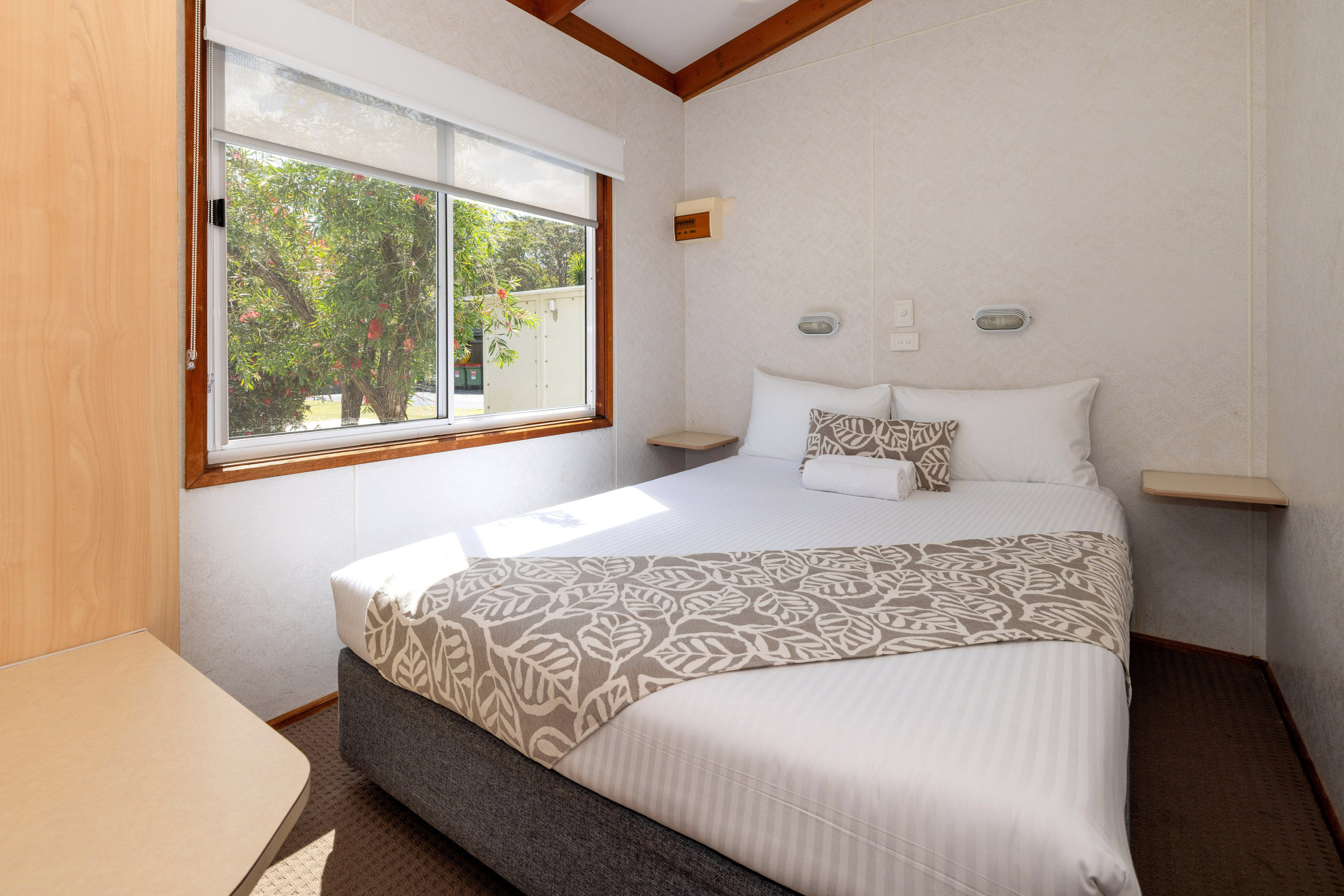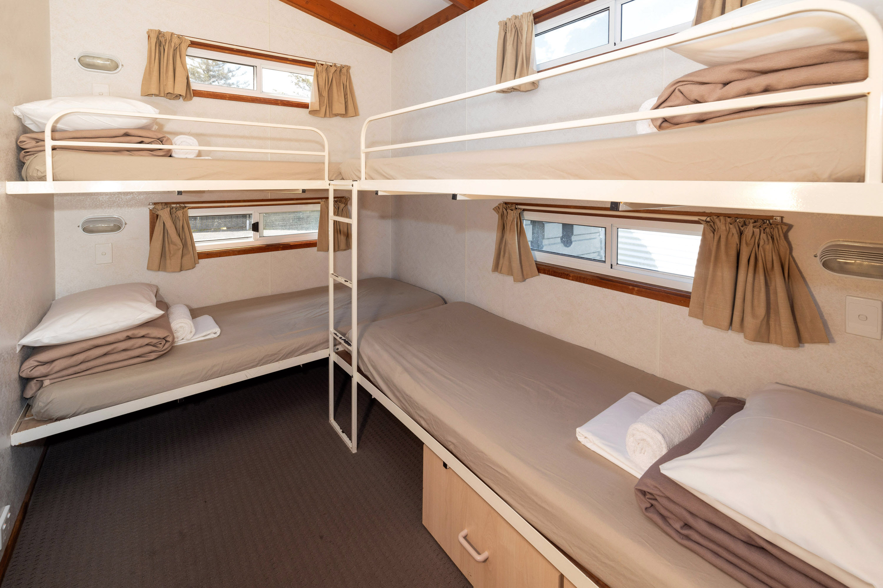 The main bedroom has a queen bed, built in wardrobe, overhead reading lamps and side tables. The second bedroom has two bunk beds with storage draws underneath.