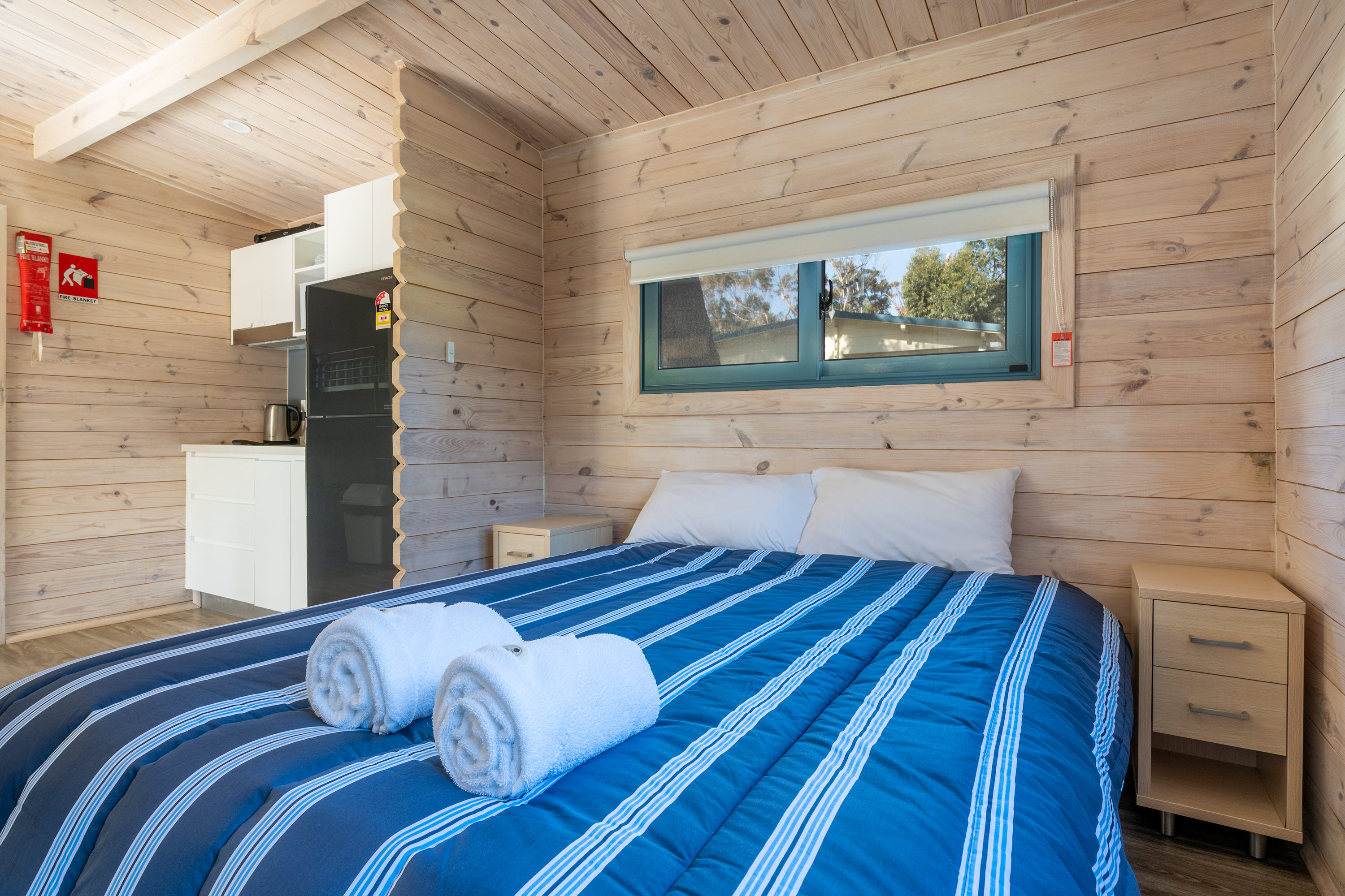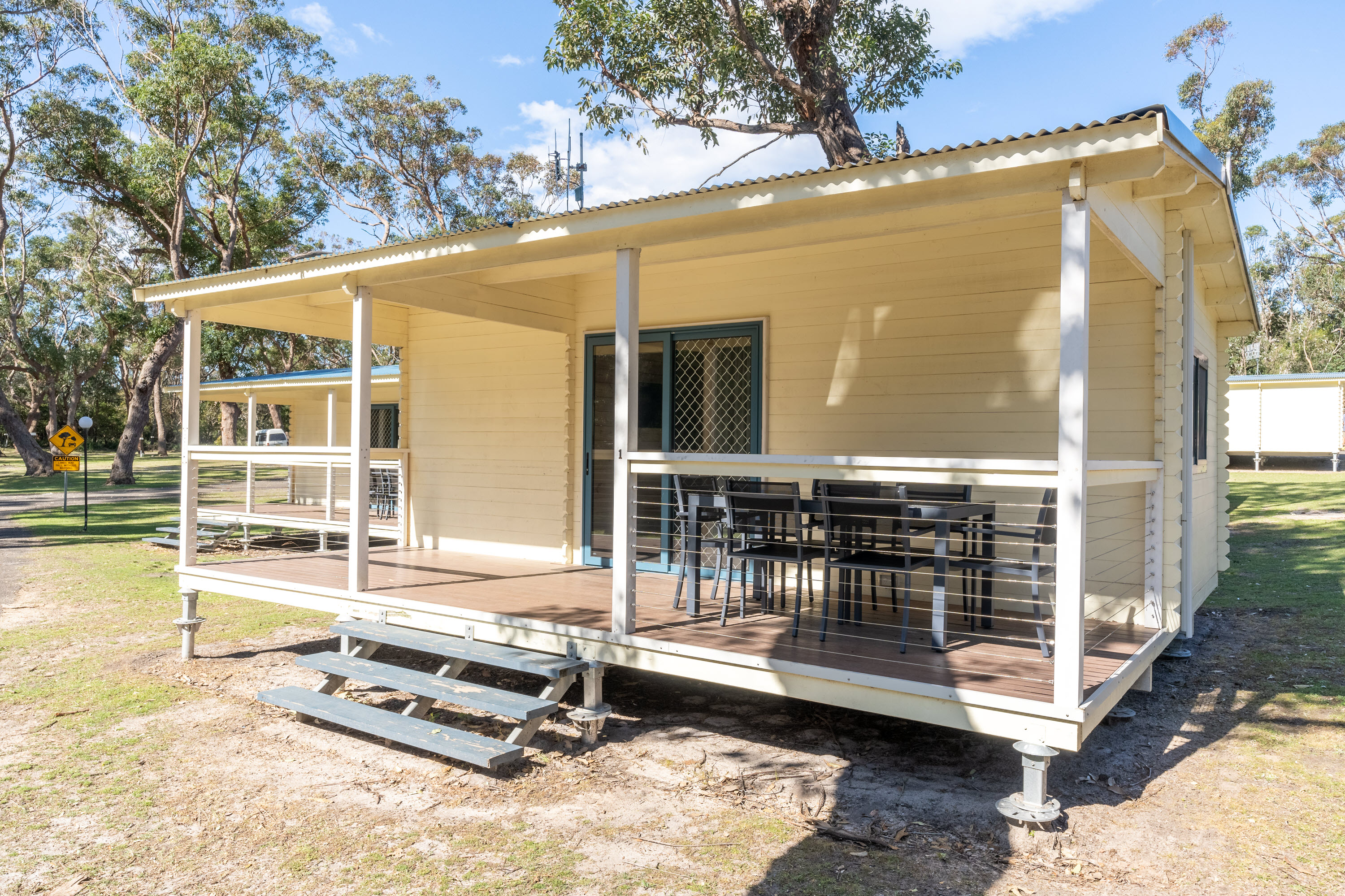 The Bunkhouse Cabins are a perfect budget option for groups or families looking for great value accommodation near the ocean. Compact but practical for 6 people, the queen size bed is in the main room, and the second room has 2 sets of bunks. The cabins are next to the main amenities building and do not have an internal shower or toilet.