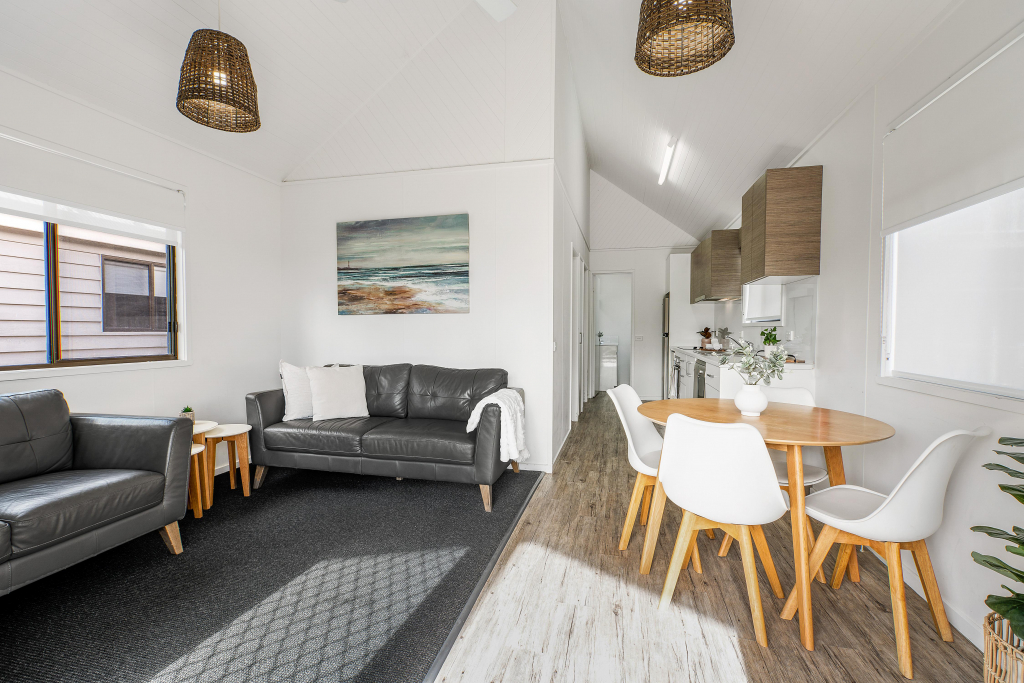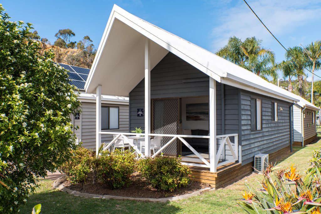 The Deluxe Cabin is one of our mid range accommodation options that still delivers on the quality and cleanliness expected. The accommodation boasts two bedrooms with a double bed in the first bedroom, and two singles in the second bedroom (all linen provided). This accommodation is fully self contained and air-conditioned with kitchen, lounge and dining. The deck and outdoor setting overlooks the tropical hibiscus gardens giving you that space to kick back and soak up the Tathra Beach experience. This range of accommodation sleeps up to four persons.