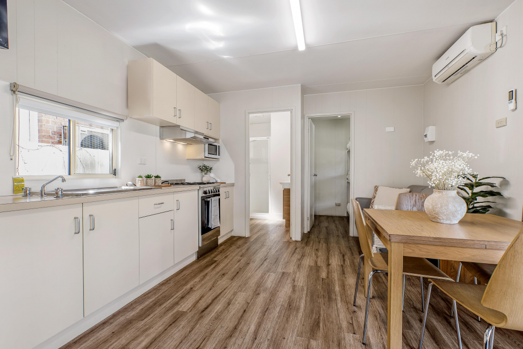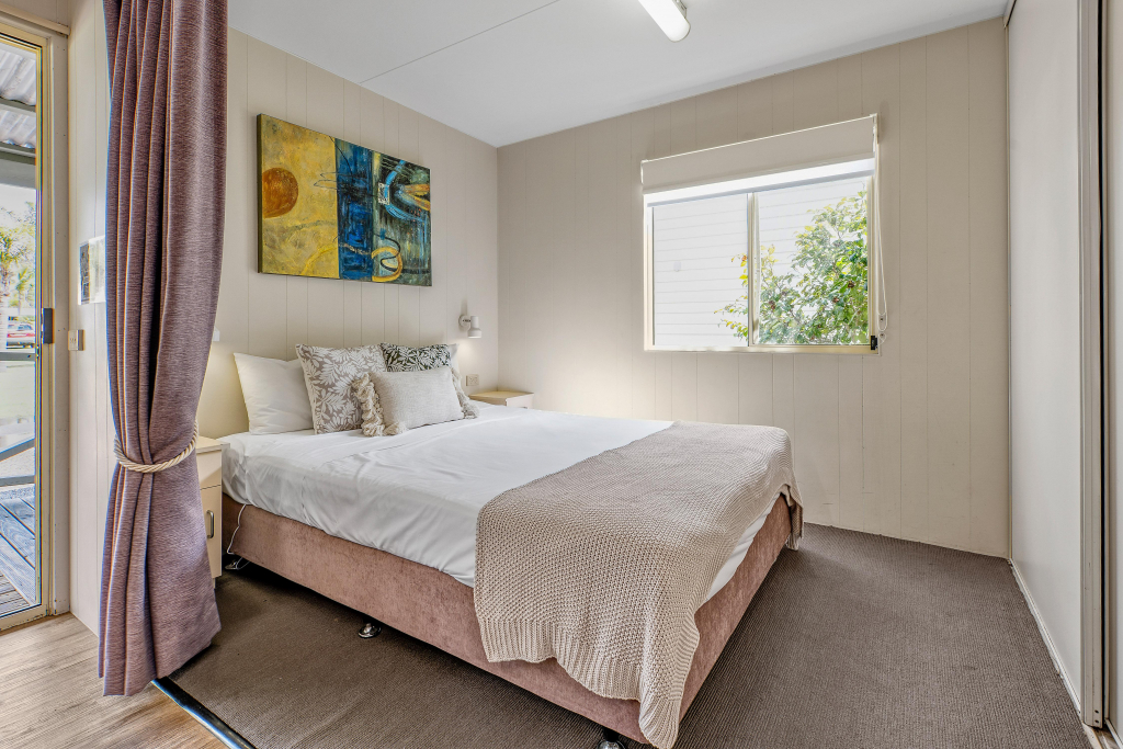 The two Bedroom Ensuite Cabin is another of the mid range accommodation options at BIG4 Tasman Holiday Parks - Tathra Beach. The main bedroom has a queen bed with linen which is divided from the lounge/dinning/kitchen area by a curtain. The second bedroom has a triple bunk (linen pack provided). The accommodation has reverse cycle air conditioning, is self contained and has an outdoor setting on a covered verandah, which runs the length of the cabin. This is a fantastic value for money and accommodates up to five persons.