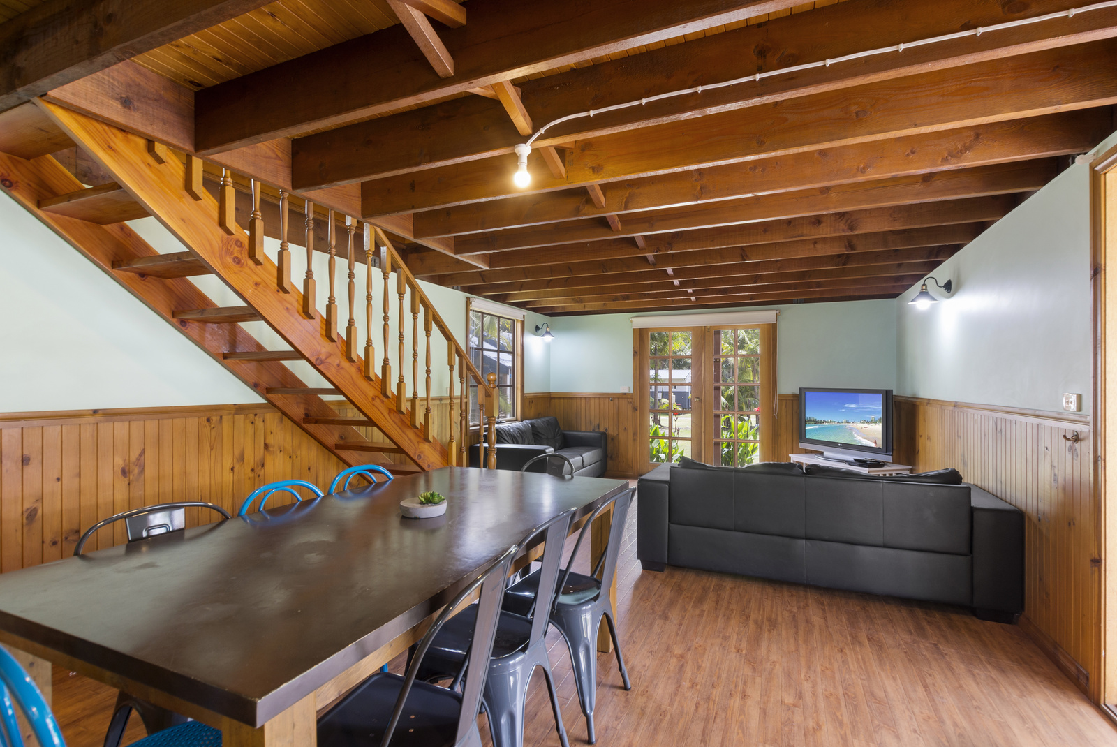 This spacious cabin sleeps up to eight guests across three bedrooms with two queen beds and two bunk beds. Cook up family favourites in the full kitchen, then unwind on the private deck. Air conditioning ensures year-round comfort, all just a short stroll from the beach.