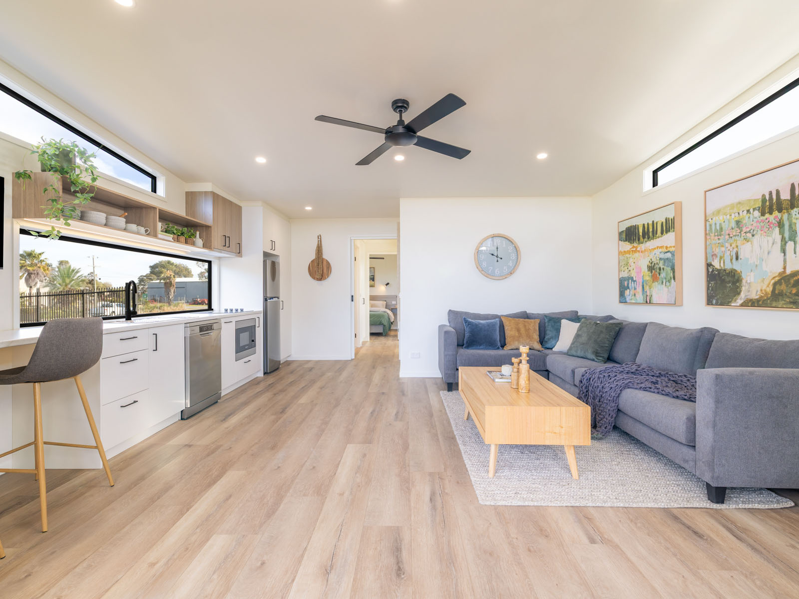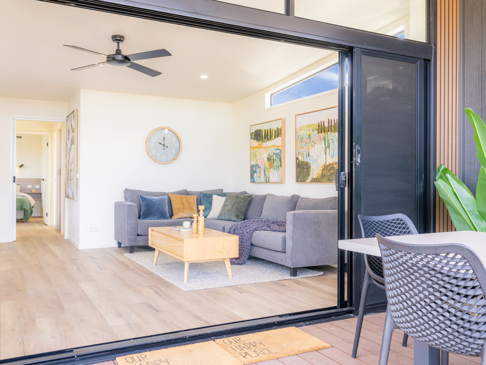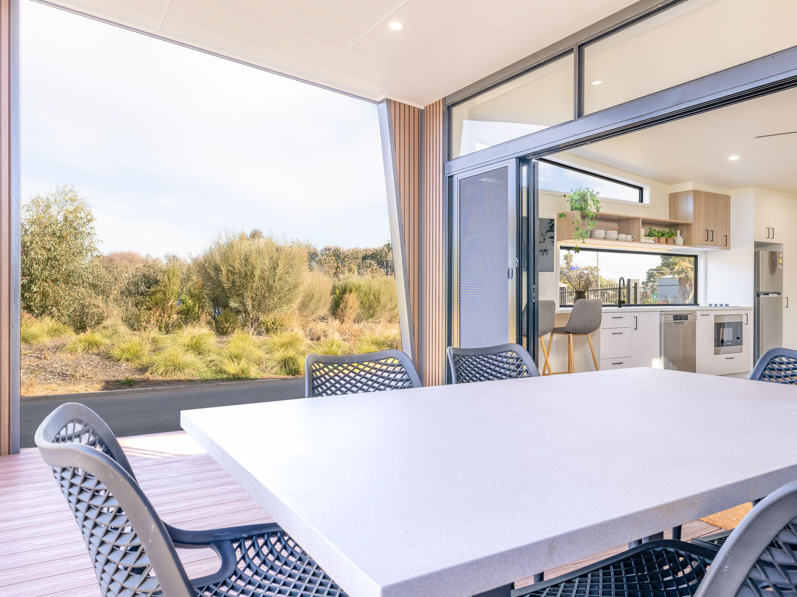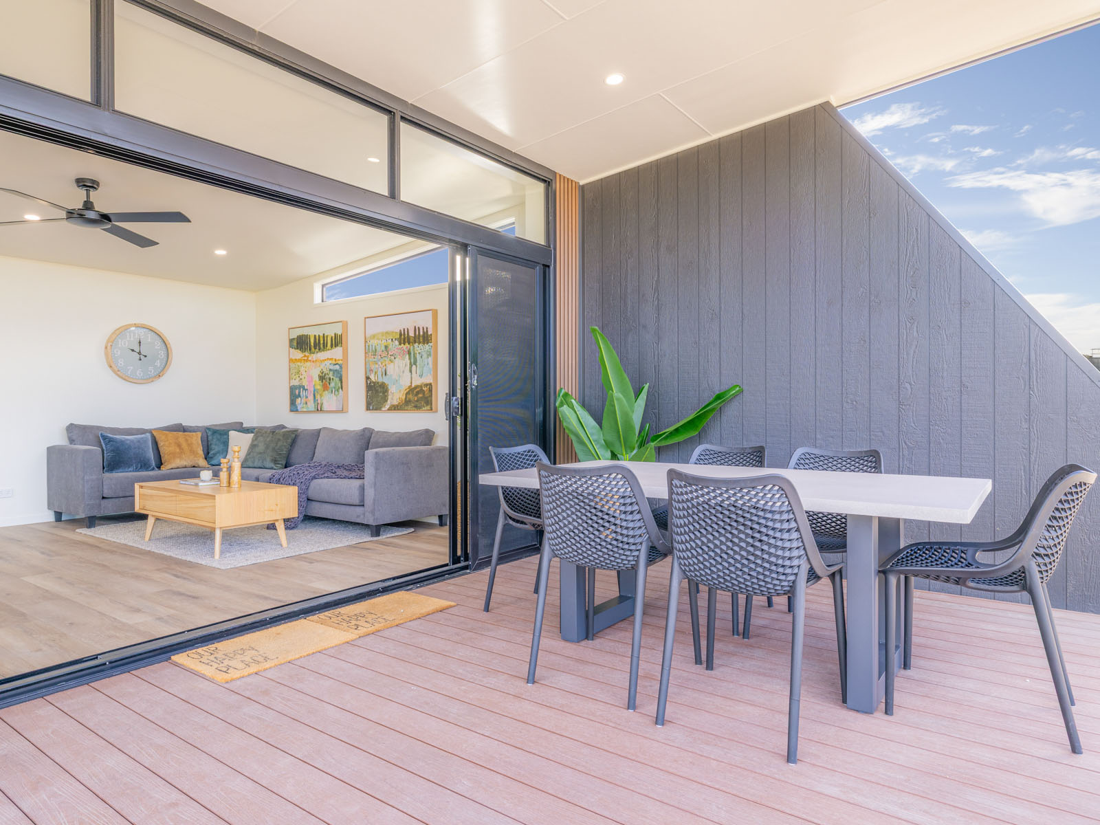 Sleeping up to six, it features two queen beds and a bunk—perfect for families or friends. The full kitchen includes a stovetop, microwave, dishwasher and full-size fridge. Enjoy the open-plan living area with lounge, TV and reverse-cycle air-conditioning for year-round comfort. Step out to your private patio with outdoor dining—ideal for alfresco breakfasts or evening relaxation.
