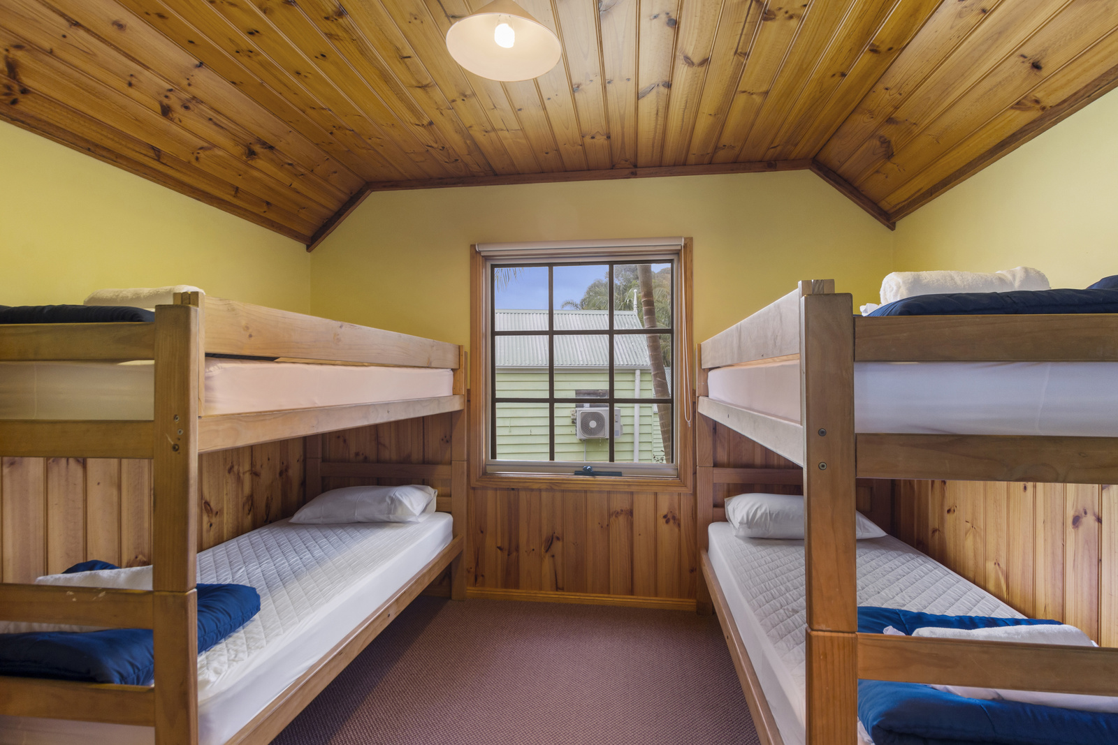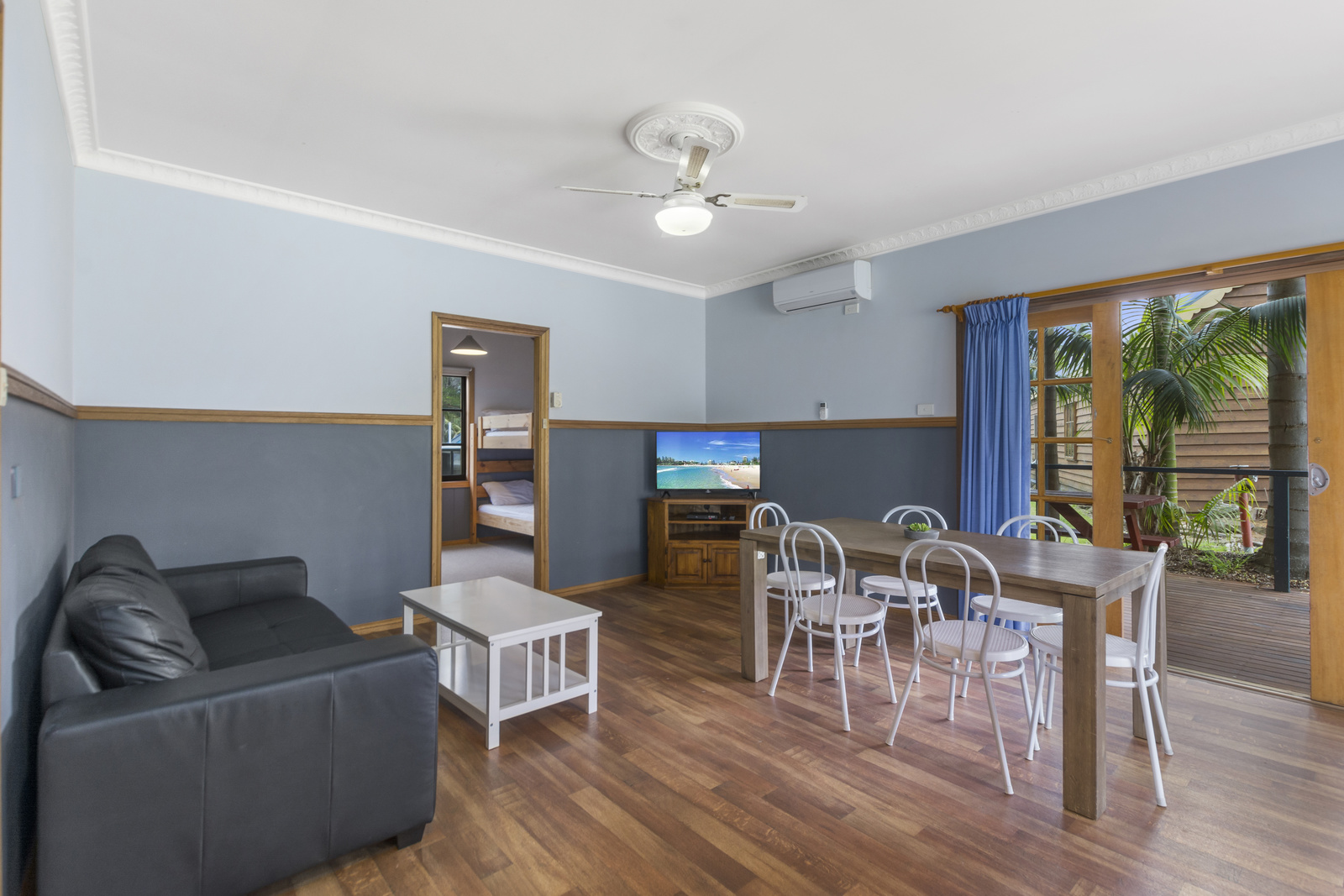 It features one queen bed and two single bunks, along with a practical kitchenette complete with microwave, fridge, and stovetop. The air-conditioned interior opens onto a private patio with outdoor dining, offering a peaceful space to relax. Enjoy self-contained comfort just a short stroll from the beach.