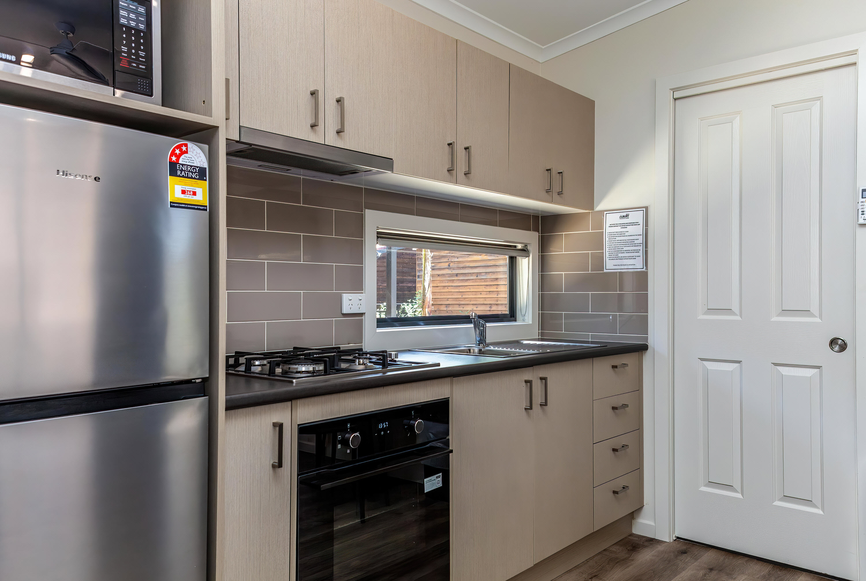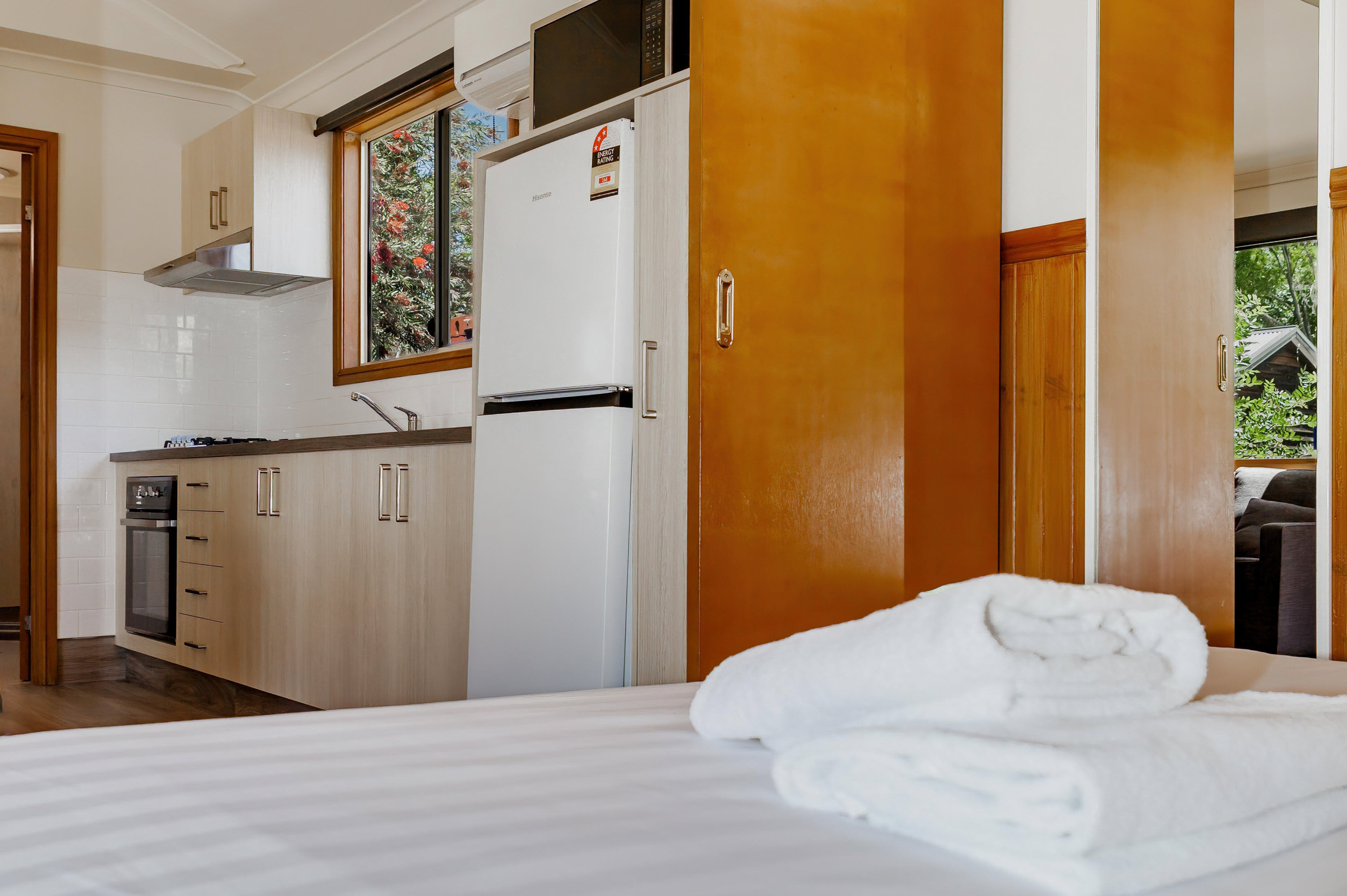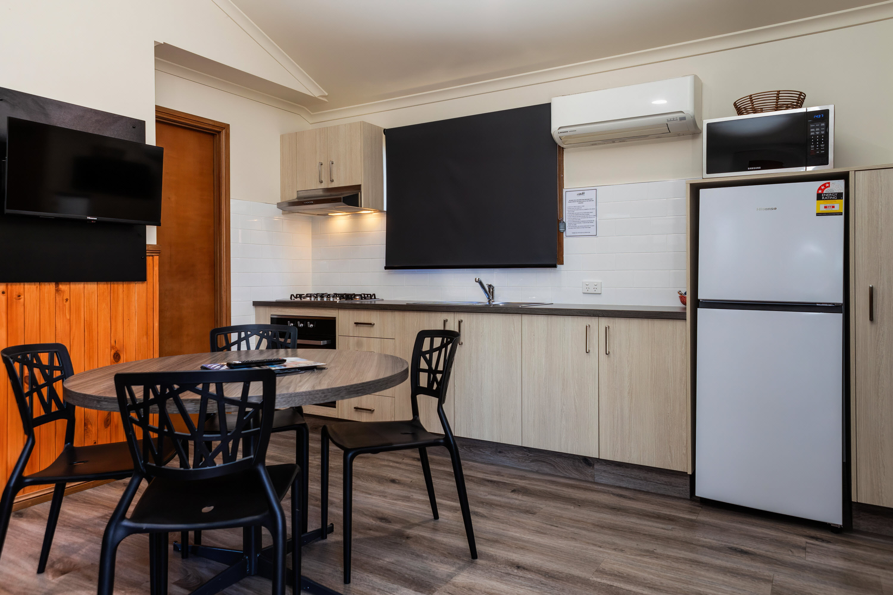 Our two bedroom standard cabins are perfect for families and overnight travellers. There is a queen bed in the main bedroom and in the second bedroom a choice of one set of bunks, or two single beds and a fold down bunk. They have a bathroom, full kitchen with lounge/dining, flatscreen TV, A/C and car parking alongside.