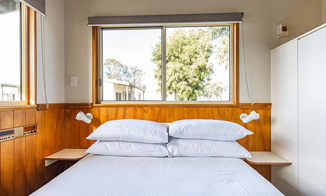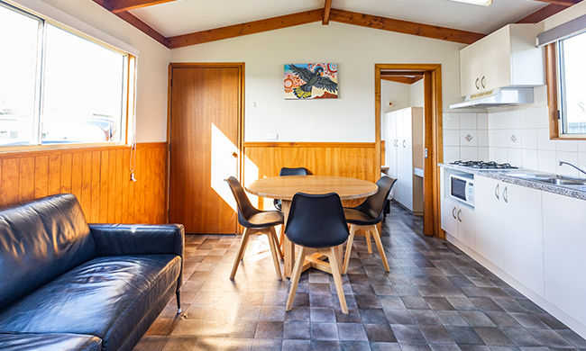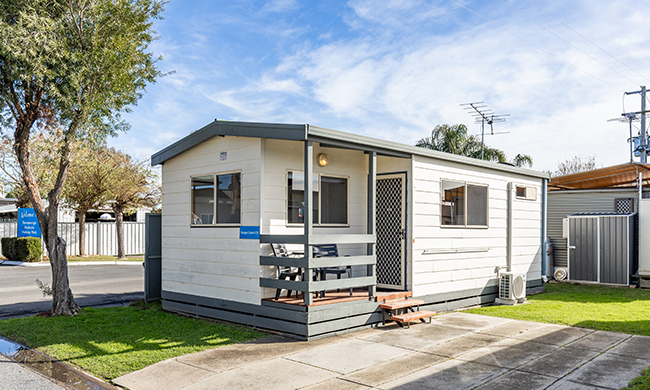 Self-contained basic cabin located close to park facilities. Two bedrooms featuring one queen and one single bunk. Features air-conditioning; kitchen including fridge, microwave and stove top; bathroom; lounge and dining area; TV; covered entrance with small dining setting on outside grass area.