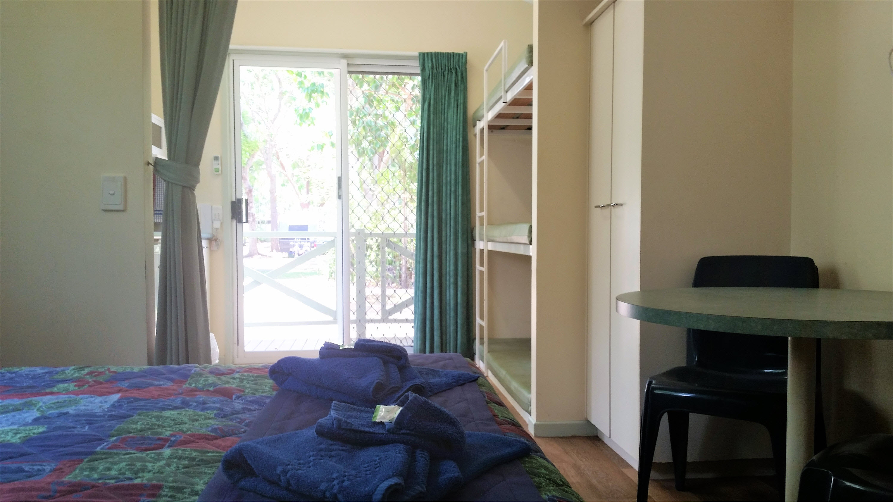 This cabin boasts an open-plan layout includes a double bed and a set of single bunk beds suited for children. A compact kitchenette with cooktop, microwave, and bar fridge provides the essentials for easy meals. With air conditioning and a TV, plus a shaded veranda, you’ll enjoy both comfort and value.