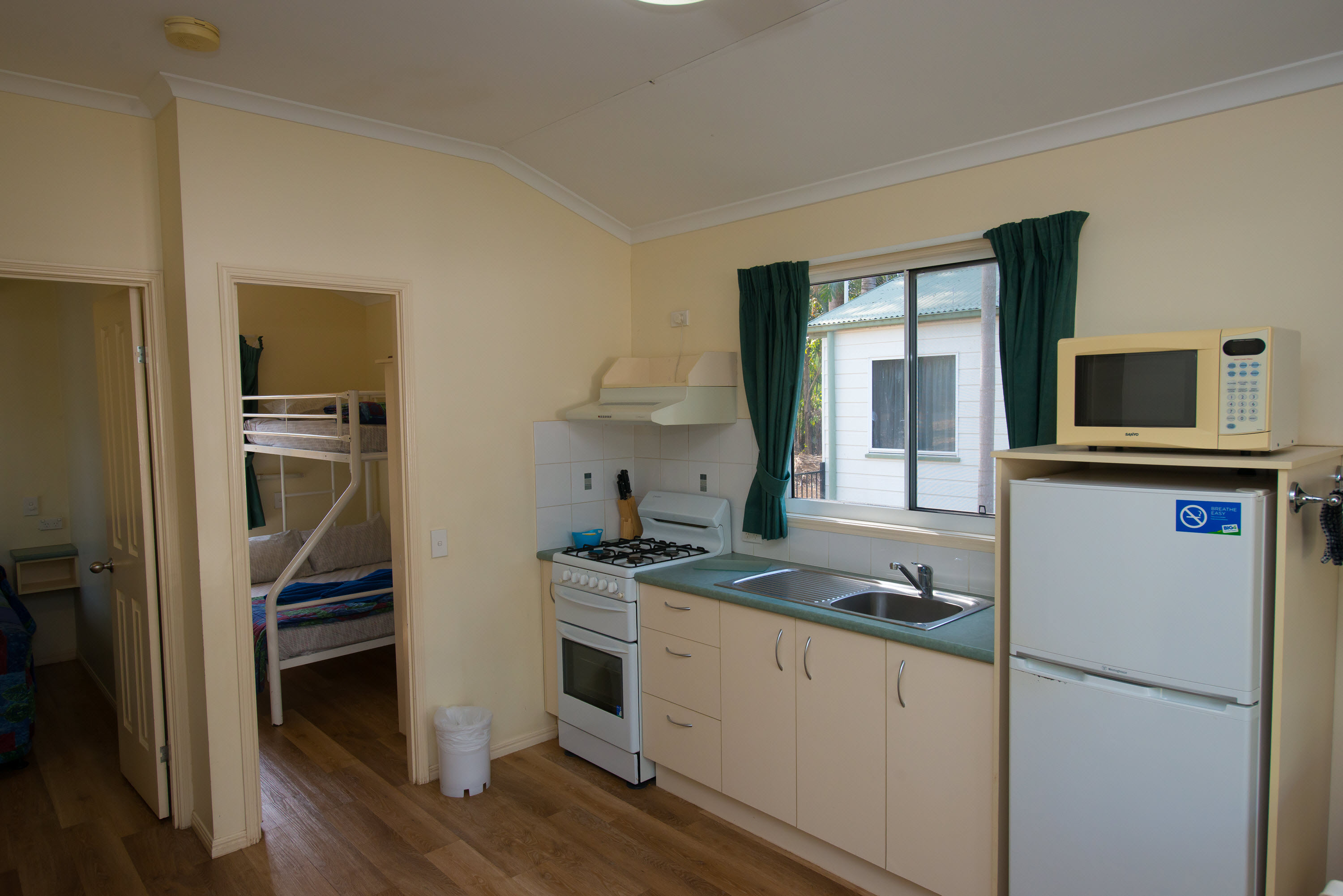 Unwind in this self-contained retreat perfect for small families or couples. Sleeping up to five guests, it offers a double bed in one room and a tri-bunk in the second. A fully equipped kitchen with gas oven and full-size fridge makes mealtimes a breeze, while the private bathroom and shaded veranda offer added comfort. With air conditioning and a TV, you’ll feel right at home. Conveniently located near the jumping pillow and main pool.