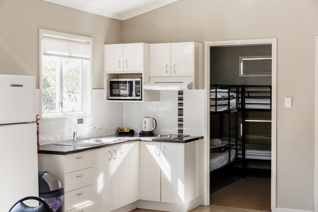 The cabin has a self-contained kitchen including a fridge, microwave, stovetop and plenty of crockery and cutlery with a separate outdoor dining area, and a TV in the living area. The bathroom in the cabin includes a shower, toilet and vanity. The cabin is air-conditioned for your comfort.