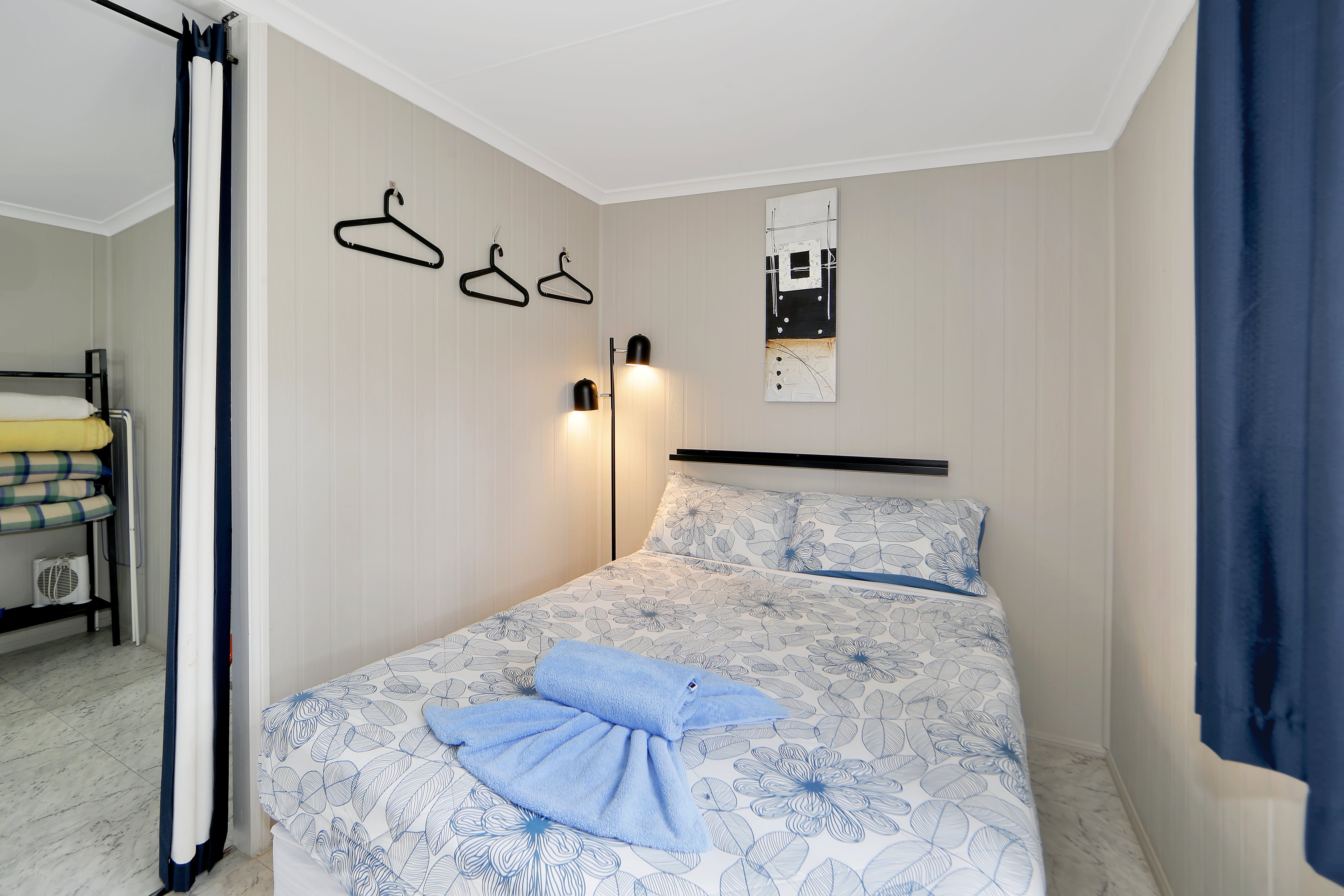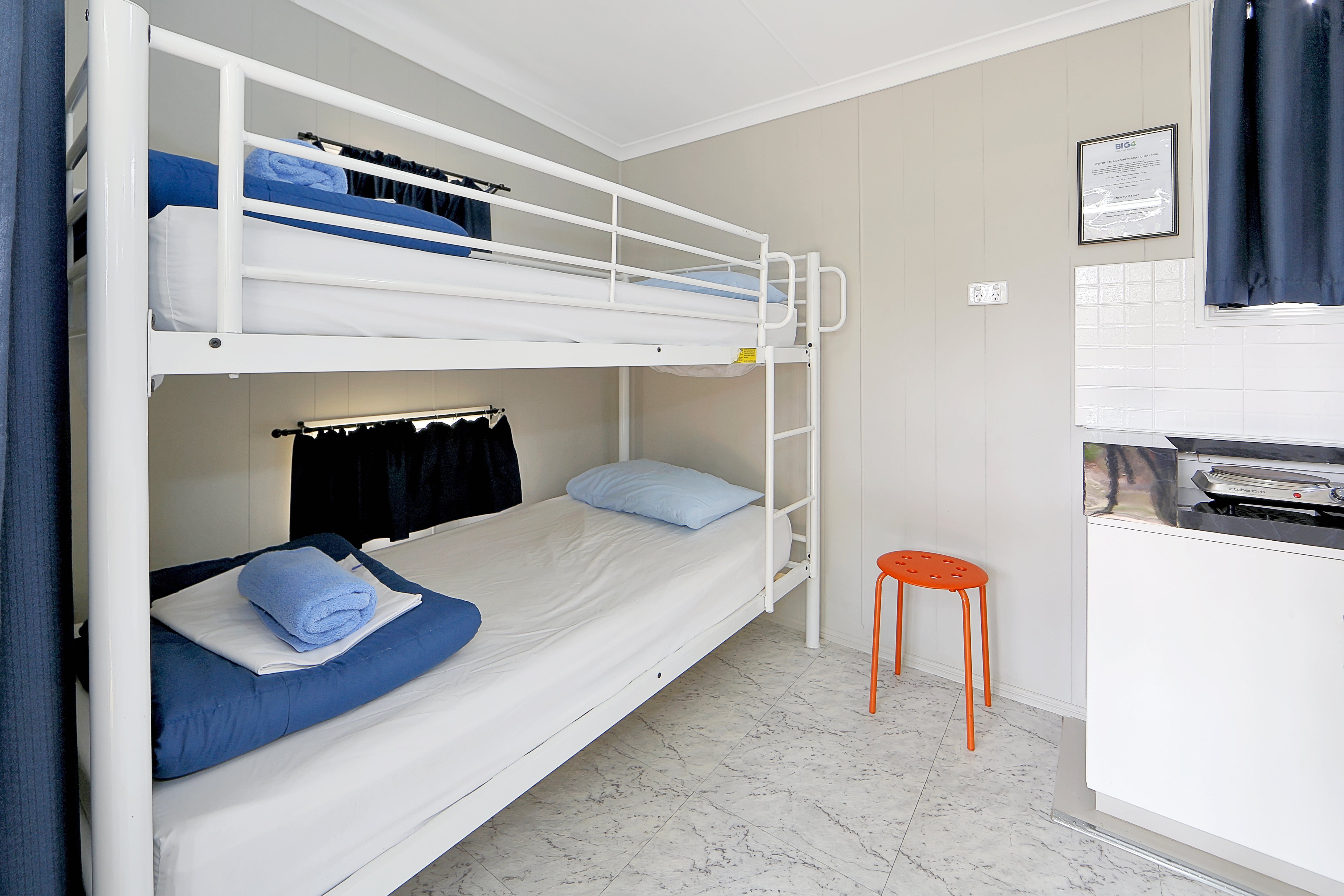 These all-in-one cabins are great for the family or group travelling on a budget. Sleeps up to 6. The cabin has a double bed plus 2 sets of bunks. All linen provided. Fully self-contained with, reverse cycle air conditioner, TV, fridge/freezer, microwave, 2 burner hot plate, electric fry pan, saucepans, cooking utensils, crockery & cutlery. Complimentary tea & coffee.
