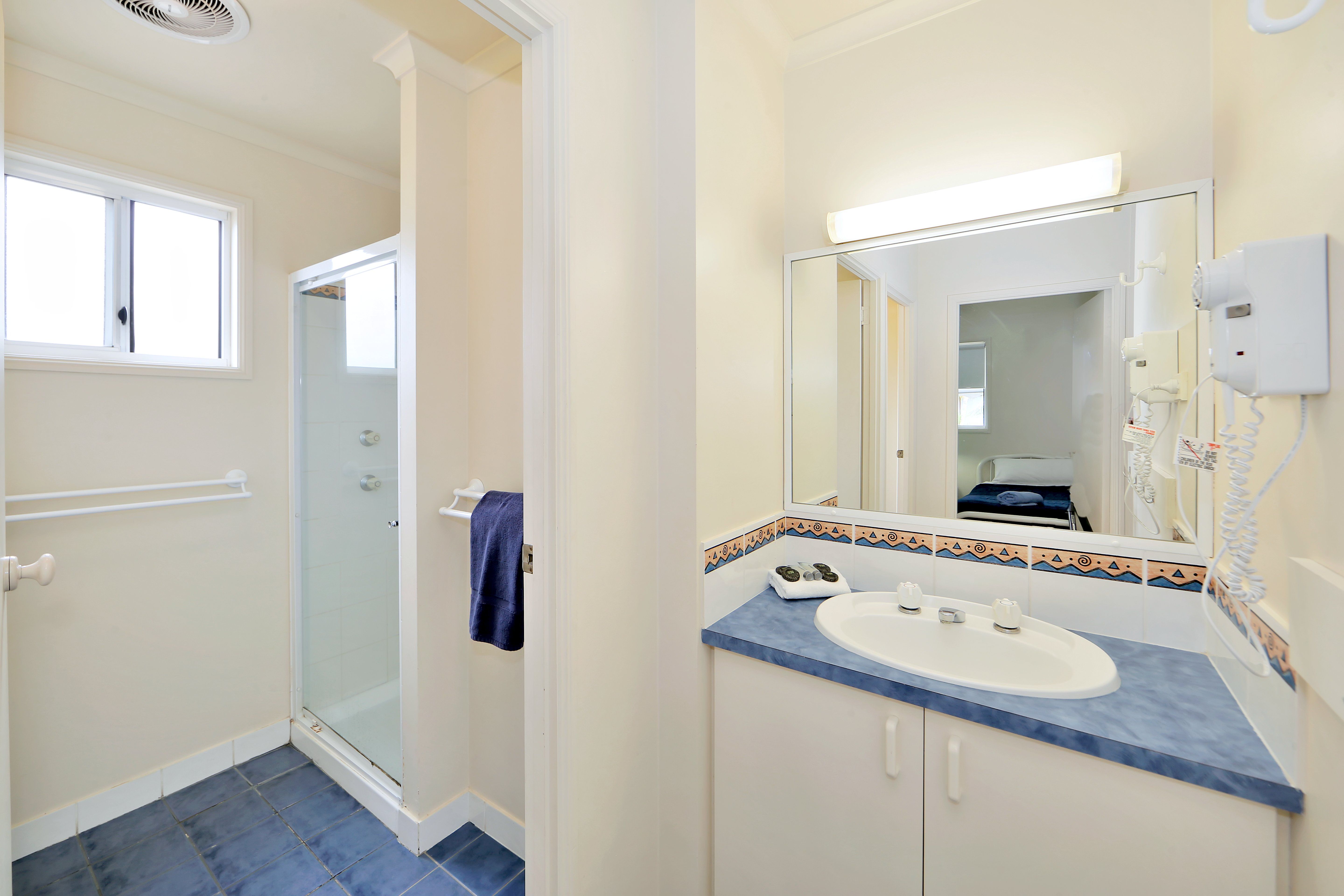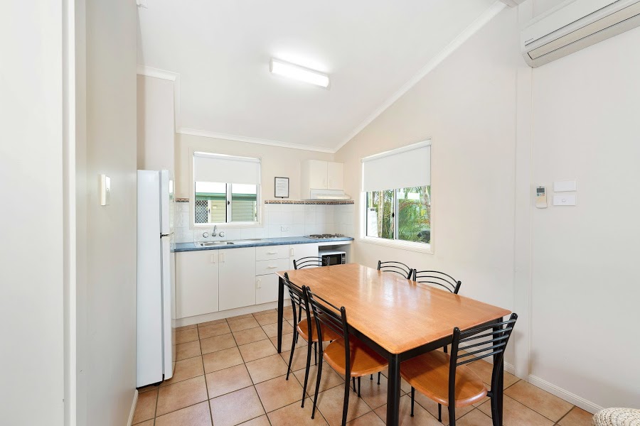 This two-bedroom villa is ideal for those people that prefer single beds to bunk beds. Sleeps up to four people. First bedroom has a queen bed, and the second bedroom has two single beds. All linen is supplied. Separate shower and toilet. Lounge setting in comfortable living area with television, Foxtel and reverse cycle air conditioner. Kitchen facilities include fridge/freezer, four burner stove top, microwave, electric fry pan, saucepans, cooking utensils, crockery and cutlery, and complimentary tea and coffee. Large undercover outdoor area with plenty of seating.