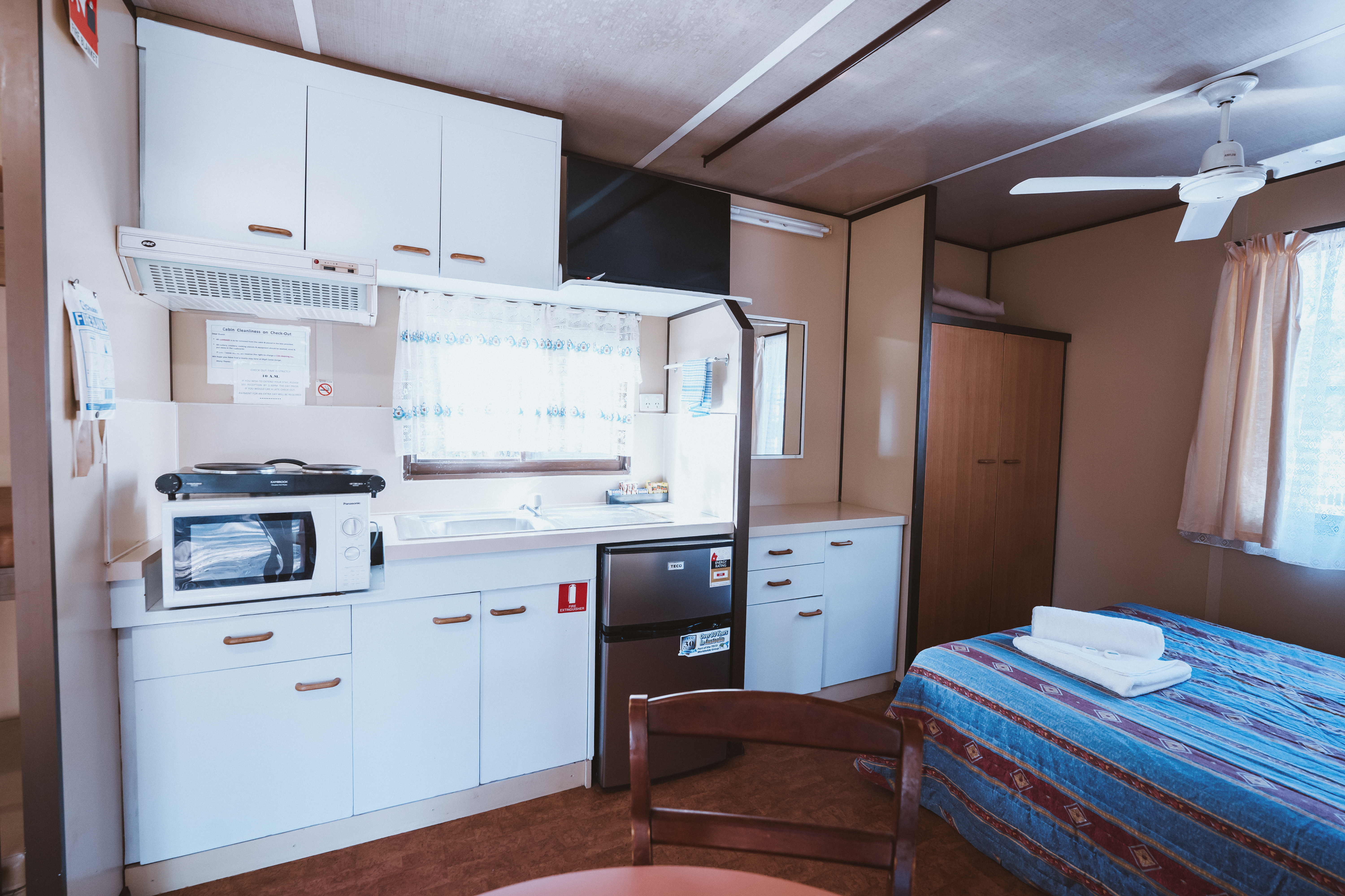 This budget-friendly, older-style cabin offers a double bed separated by a curtain for privacy and a set of bunk beds in the living area. The open-plan cabin has a self-contained kitchen including a fridge, microwave, stovetop and plenty of crockery and cutlery, with a dining area and a TV. The cabin is air-conditioned for your comfort.