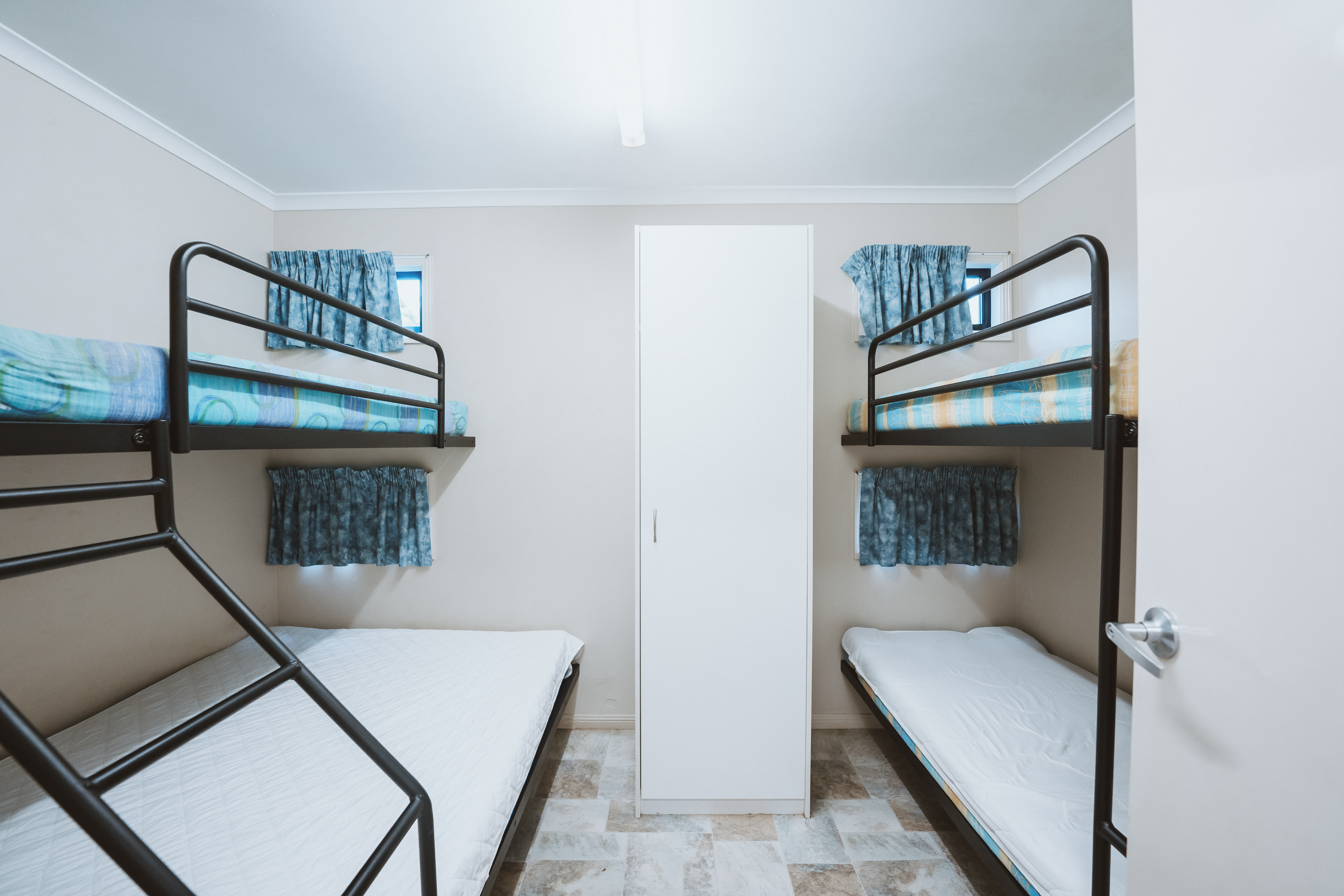 This villa offers a queen bed in the main bedroom, a tri-bunk, and a set of bunk beds in the second bedroom.