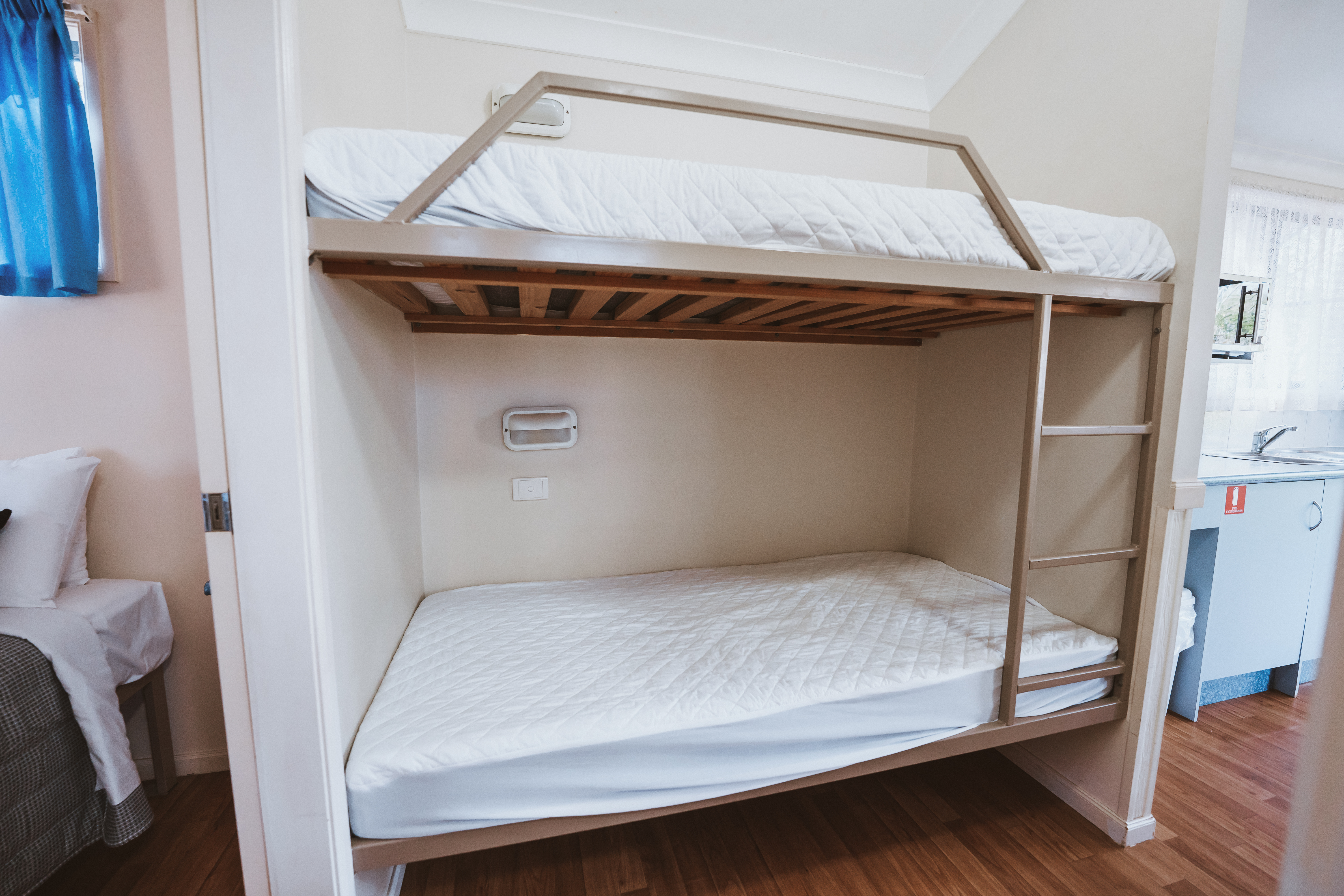 The cabin offers a queen bed in the main bedroom and a set of bunk beds in the living area. This open-plan cabin has a self-contained kitchen including a fridge, microwave, stovetop and plenty of crockery and cutlery with a dining table, lounge, and a TV in the living area. The bathroom in the cabin includes a shower, toilet, and vanity. The cabin is air-conditioned for your comfort.