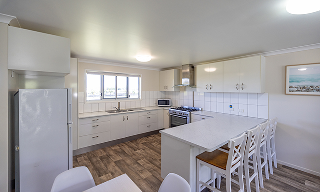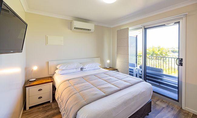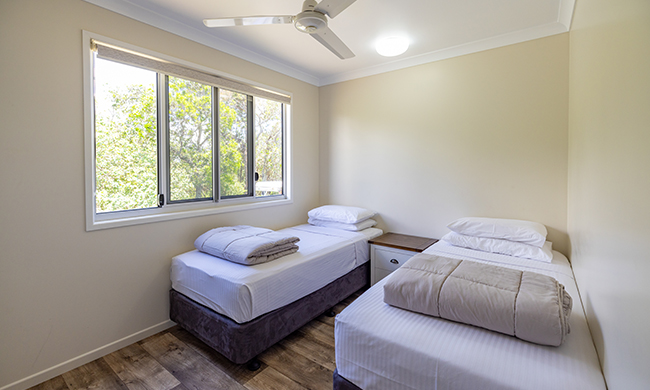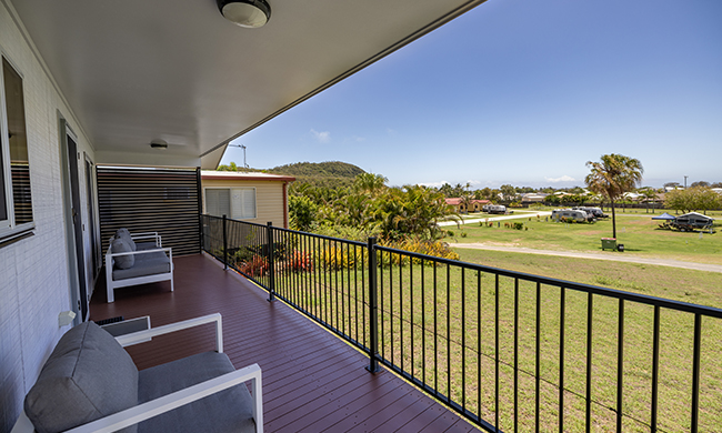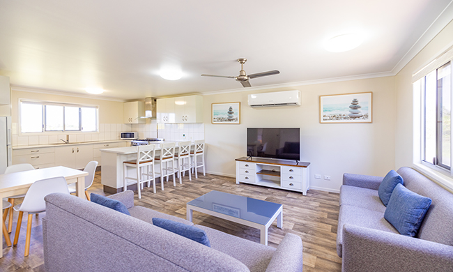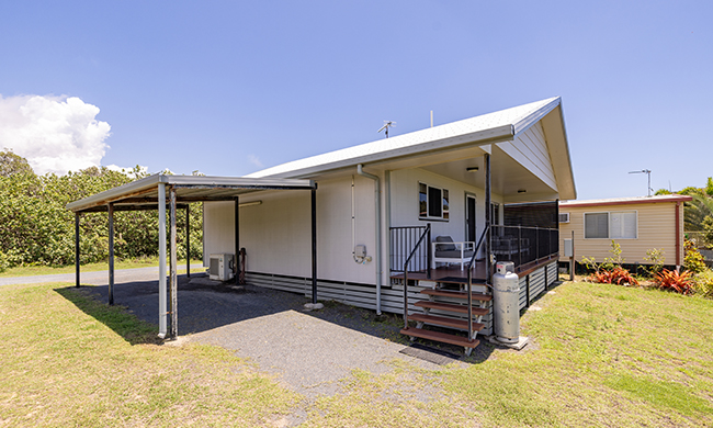 Located in a secluded part of the park, 2 bedroom villa sleeps four. One queen bed and two single beds. Featuring air conditioning; full kitchen with microwave, oven and fridge; bathroom; dining area; lounge with TV and DVD; small shaded veranda; undercover parking for one vehicle.