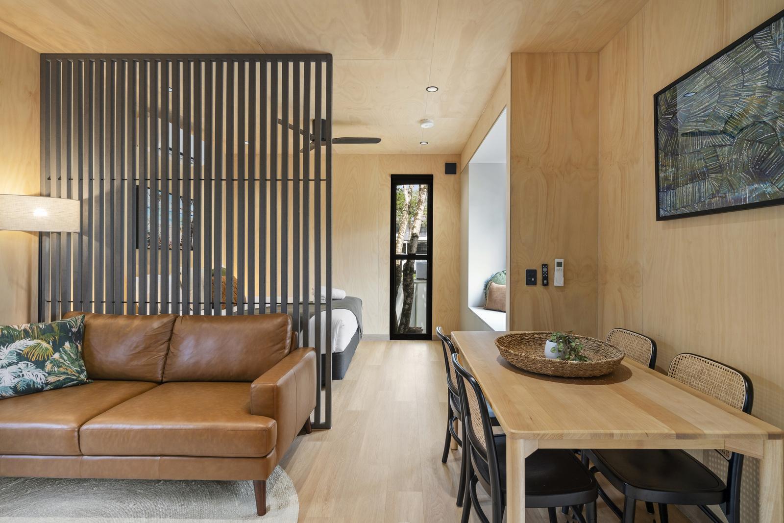 Enjoy a unique and modern duplex cabin stay. Our Duplex Studio Pod sleeps up to two guests with a king bed in the main bedroom, as well as a bathroom, living area, kitchen and deck with BBQ.