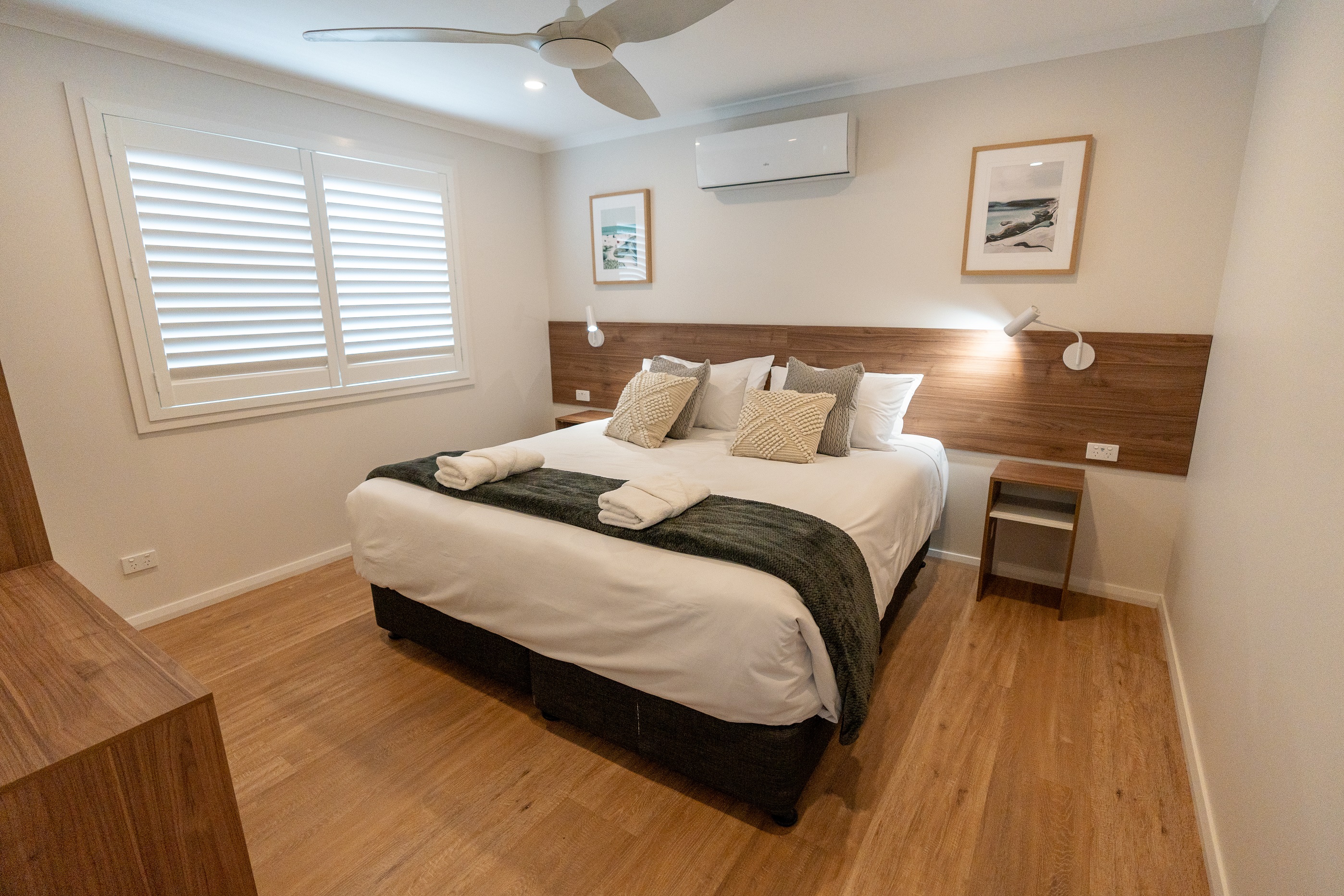 Comfort is paramount in our Family Deluxe cabins. The master bedroom and lounge are each outfitted with air-conditioners to ensure a pleasant environment regardless of the weather, while the bunk room includes a fan for added comfort. Conveniently located near our resort-style pool, these cabins provide both accessibility and a tranquil getaway. With the Oasis 2 Bedroom Family Deluxe cabins, you're set for a memorable and comfortable stay, enhanced by the luxury of modern amenities.