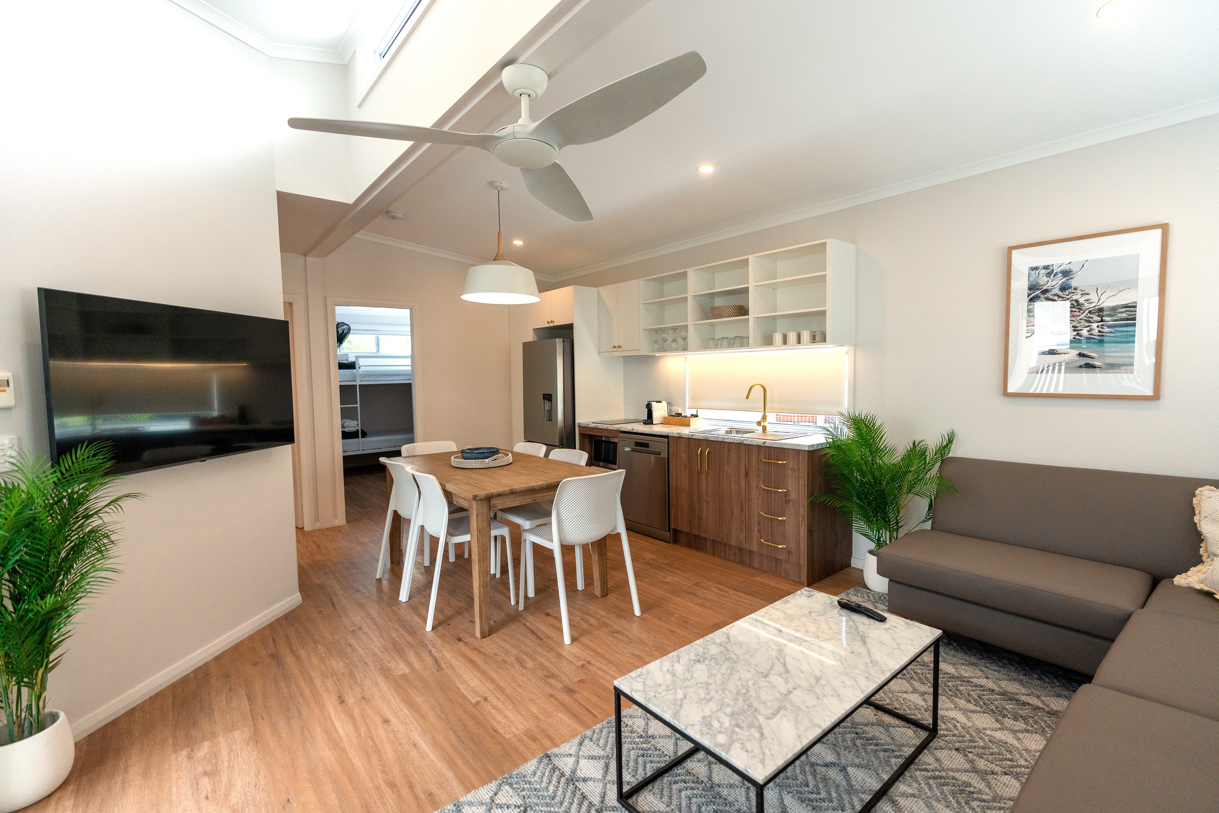 Beyond just a place to sleep, these cabins offer a complete luxury retreat. Each is equipped with a modern, open-plan kitchen and a spacious dining and lounge area, making it perfect for family or group gatherings. Entertainment is at your fingertips with high-speed internet access in every cabin, allowing you to stream your favourite movies and shows seamlessly.