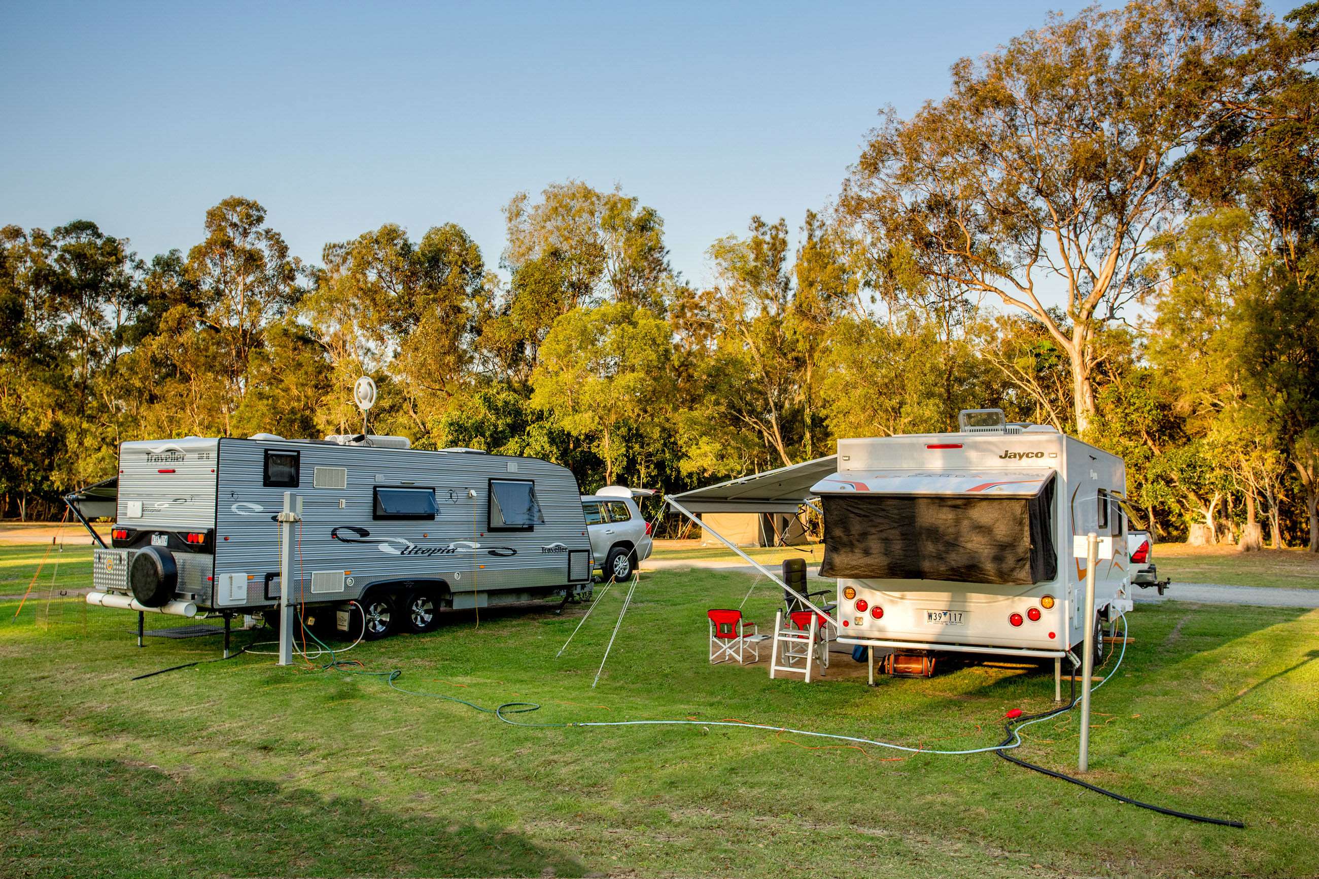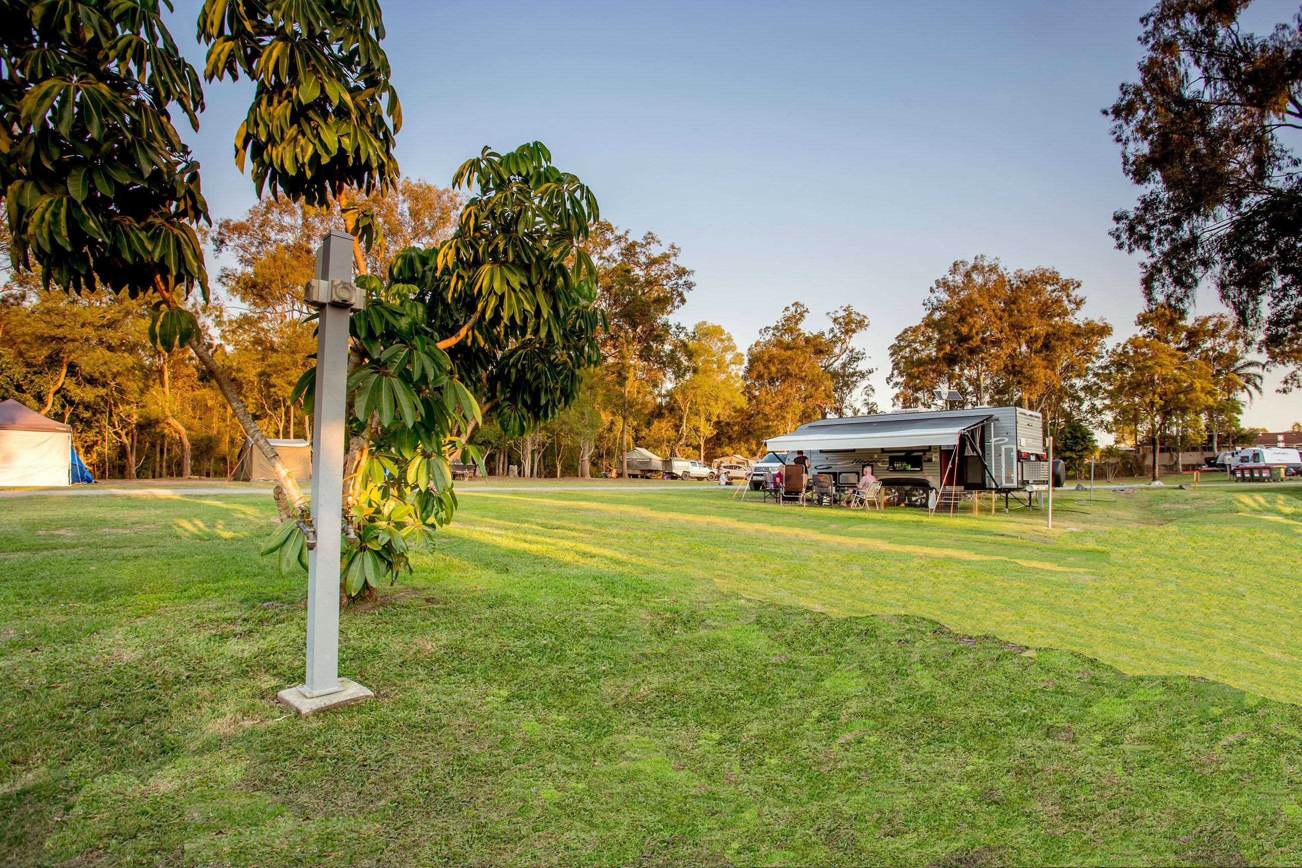 A medium sized grass site located in the Riverwalk section of the park and sleeps up to 6. The following equipment type is welcome on these sites: under 26ft including tow all Caravan and Annex, Motorhome, Campervan or Tents including ONE car space are welcome. Our Powered Riverwalk Sites are near to our Riverwalk BBQ area and right next to the beautiful Saltwater Creek so you can set up and then throw in a line! The Riverwalk area is also adjacent to our famous Roo paddock. Most mornings as the sun rises we have the pleasure of our resident family of kangaroos who happily graze on our acres of grassy paddock. There is often a little troupe of Koalas who live with us and can be spotted when the mood takes them. All in all it’s a wonderful spot to pull up and relax. In the Riverwalk area we welcome small fires in above the ground braziers (subject to fire bans).