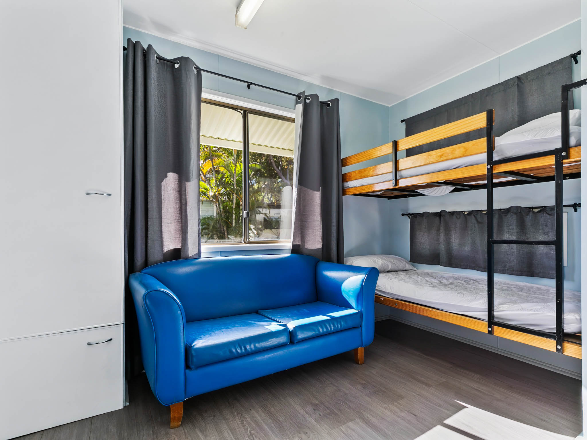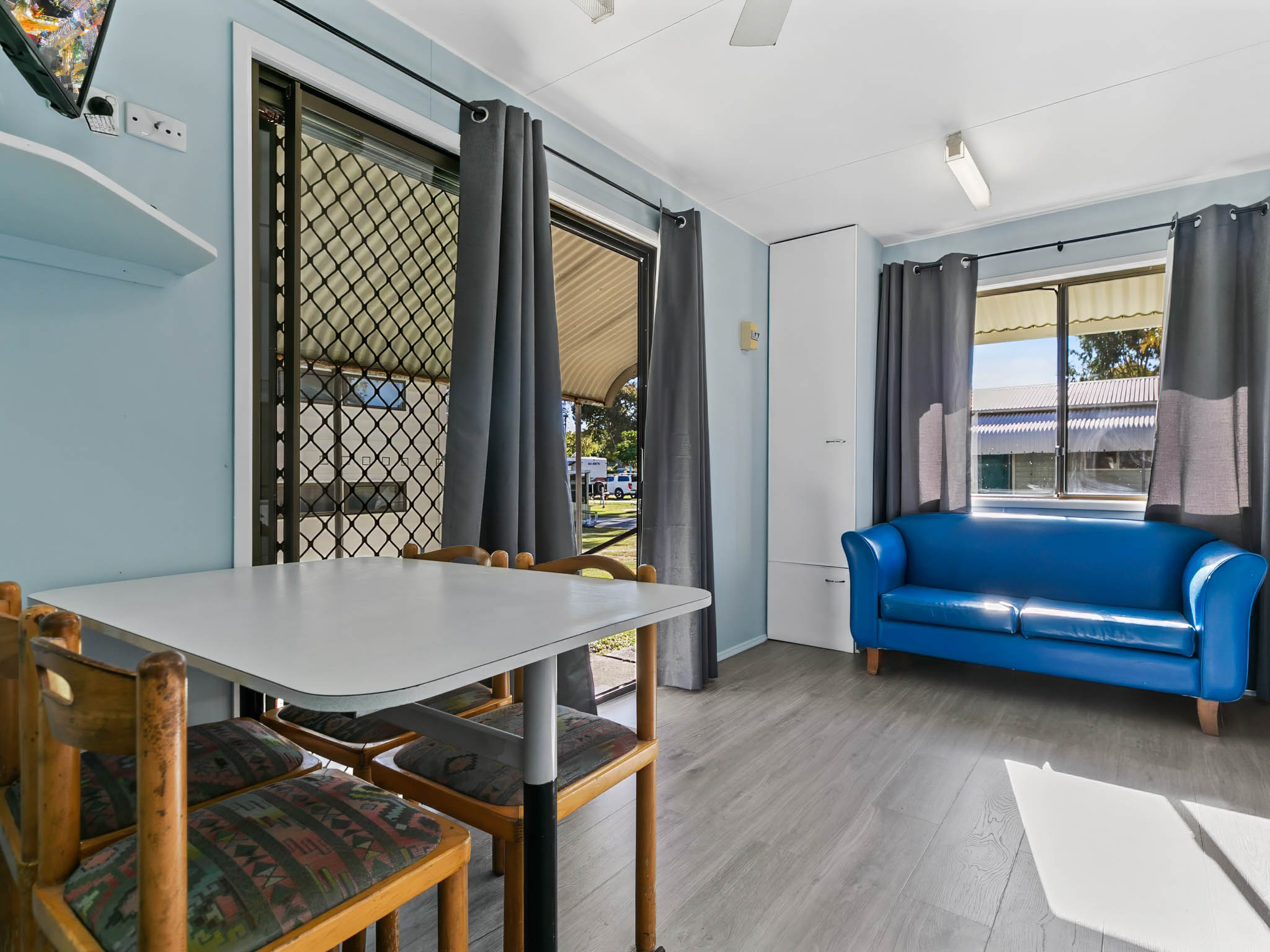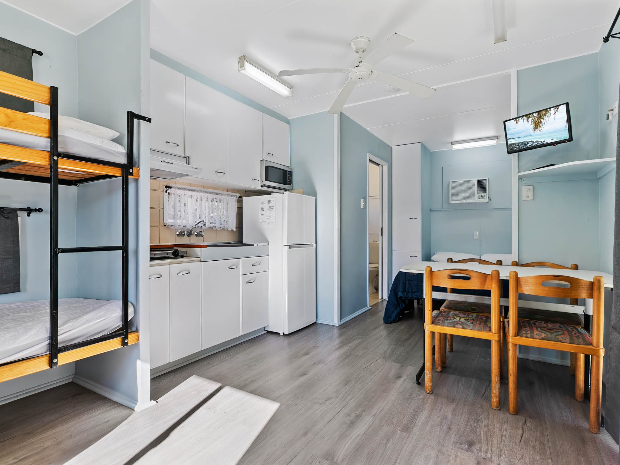 The open-plan layout includes a kitchenette with cooktop, microwave, and fridge, plus a dining table, TV, and private bathroom. Reverse-cycle air conditioning and fans ensure comfort, and the covered patio with outdoor setting is perfect for relaxed moments. With linen provided, it’s a simple and practical coastal base. Note: Bunk beds are best suited to children and may not comfortably accommodate adults.