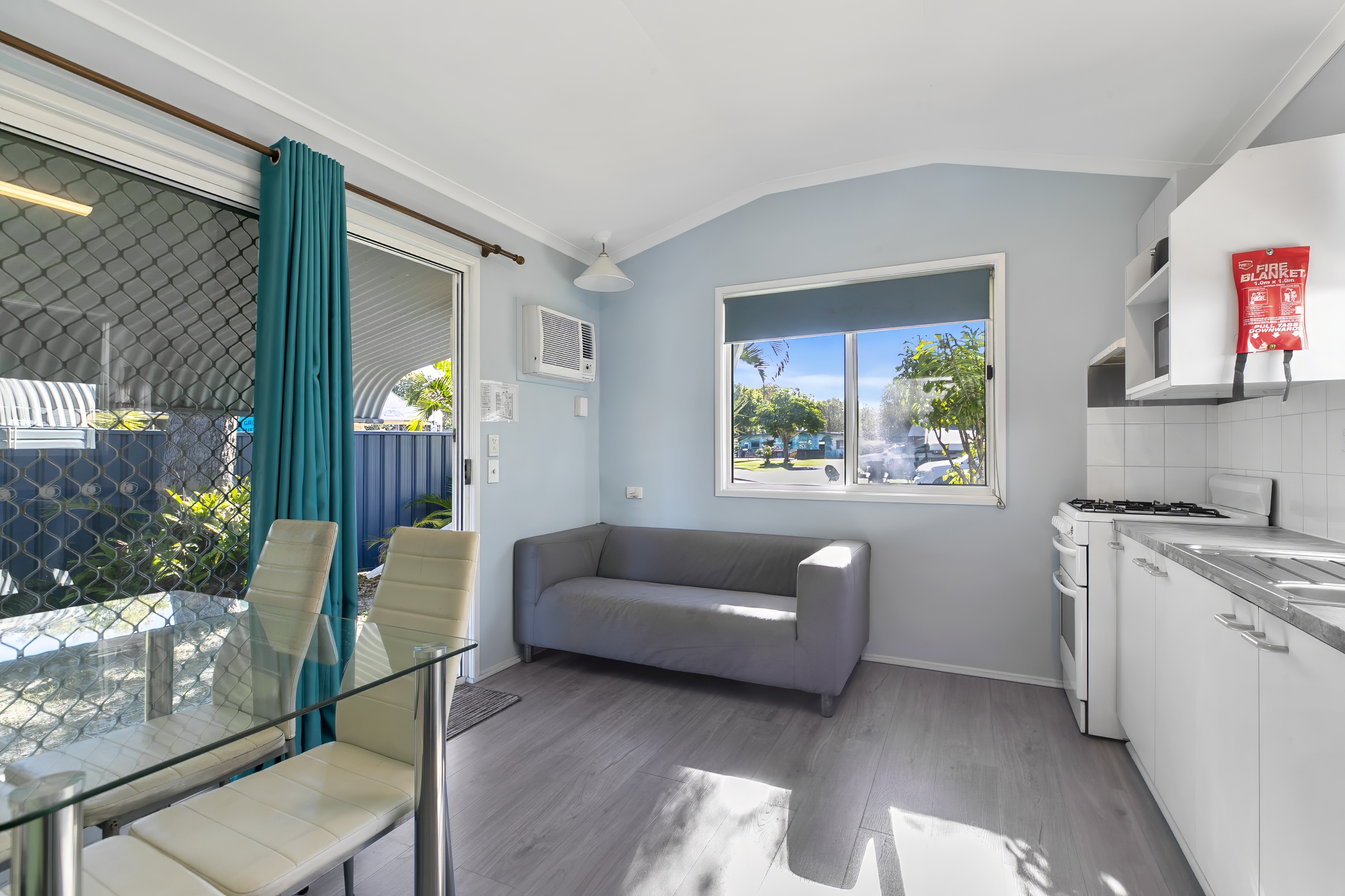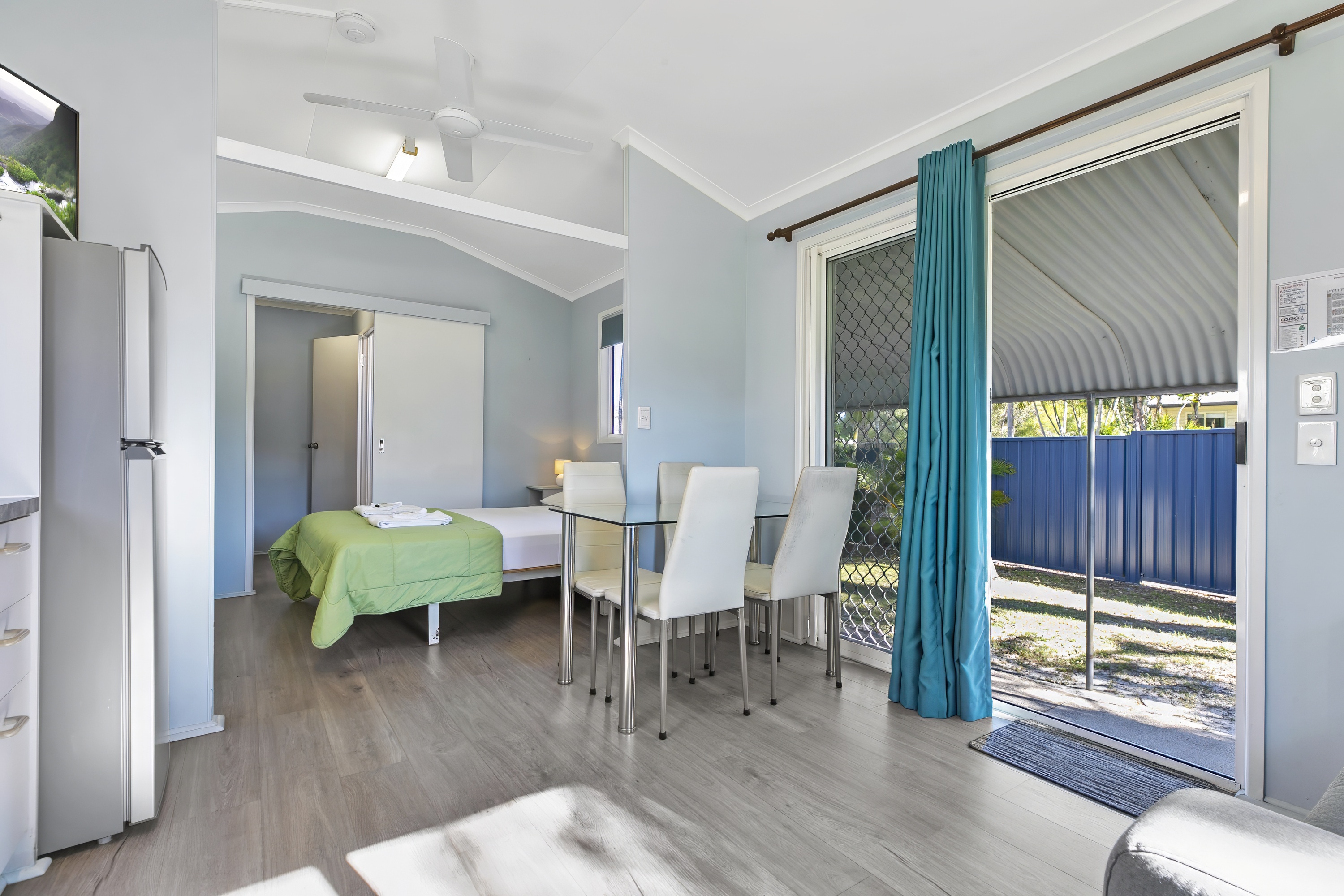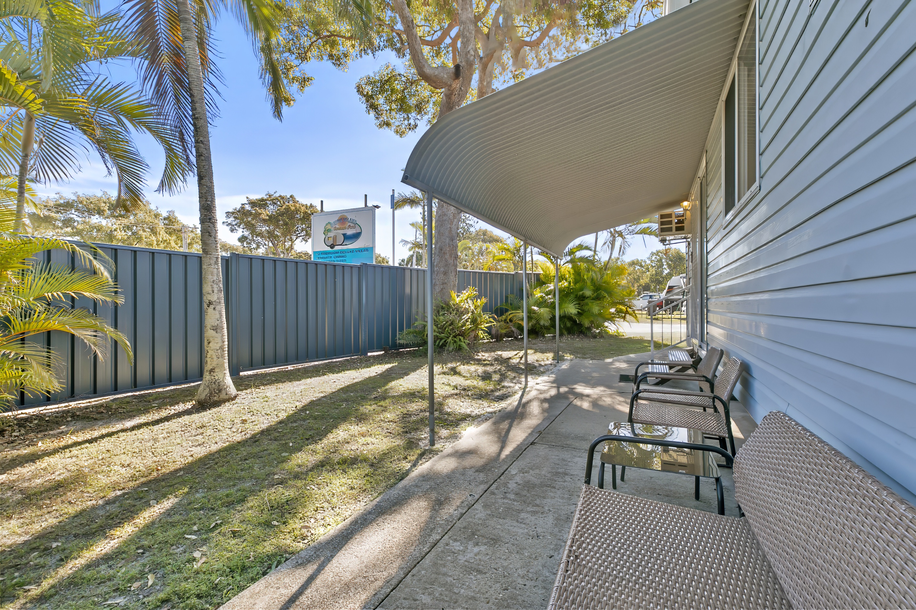 The open-plan layout includes a full kitchen, dining space, TV, and private bathroom. Reverse-cycle air conditioning and ceiling fans offer year-round comfort. Step outside to a covered patio with outdoor setting—perfect for relaxed mornings or sunset wind-downs. With linen supplied, it’s a peaceful and affordable beachside retreat.