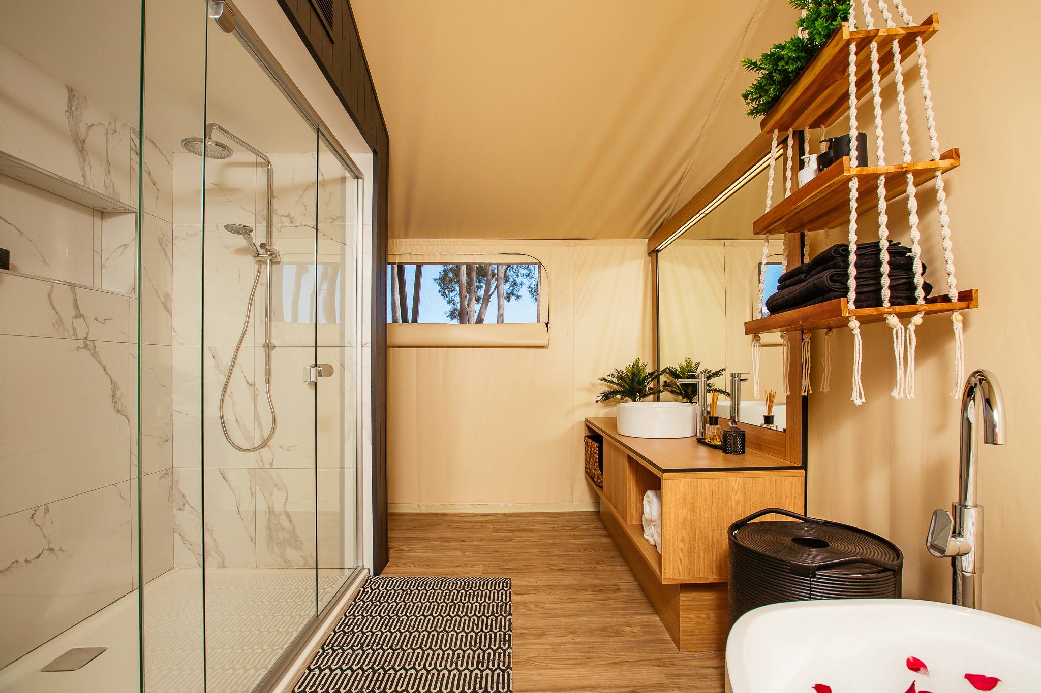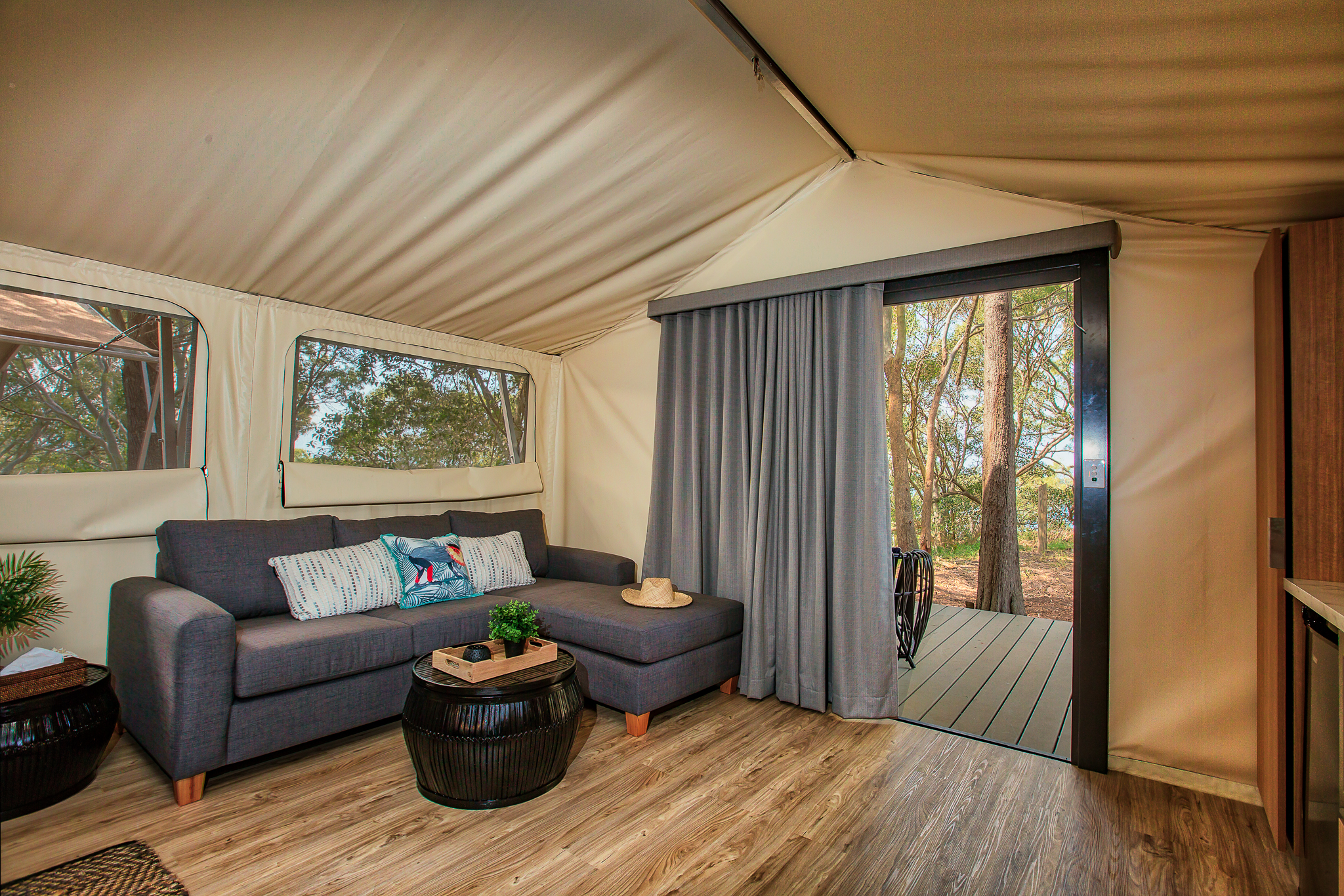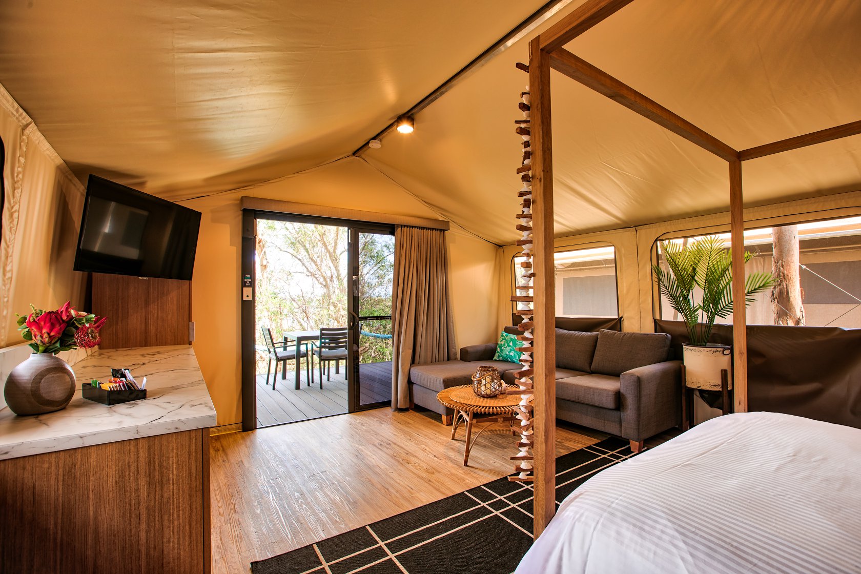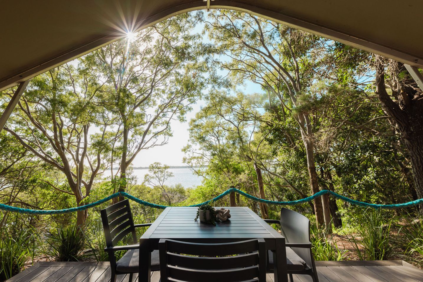 The Luxury Safari Tent is a unique way to camp in style with your significant other. Sleeping 2, this stunningly appointed "tent" features a queen bed and its own ensuite bathroom with double sinks, a bath, large shower and separate toilet. The luxurious space has an open plan living area with a TV and fridge opening out to a private alfresco dining area with a kitchenette and outdoor BBQ, perfect for outdoor dining with water views. The Safari Tents are Air-conditioned to stay cool in the Summer and Warm in the Winter!