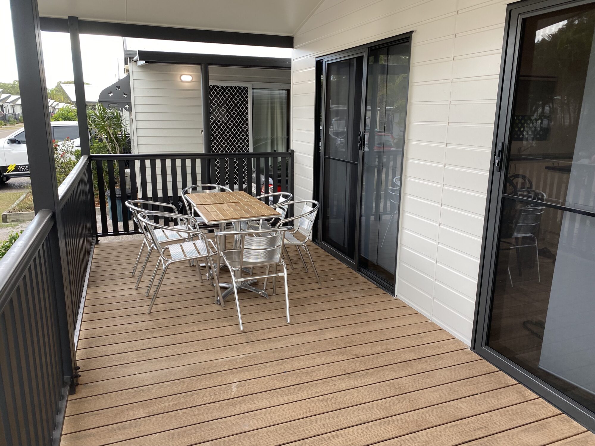 The cabin features a fully self-contained kitchen including an oven, fridge, microwave, stovetop, and plenty of crockery and cutlery, along with a separate dining area and a TV in the living space. Step outside to enjoy a meal in the outdoor setting or fire up the Weber BBQ for a relaxed cook-up surrounded by nature.