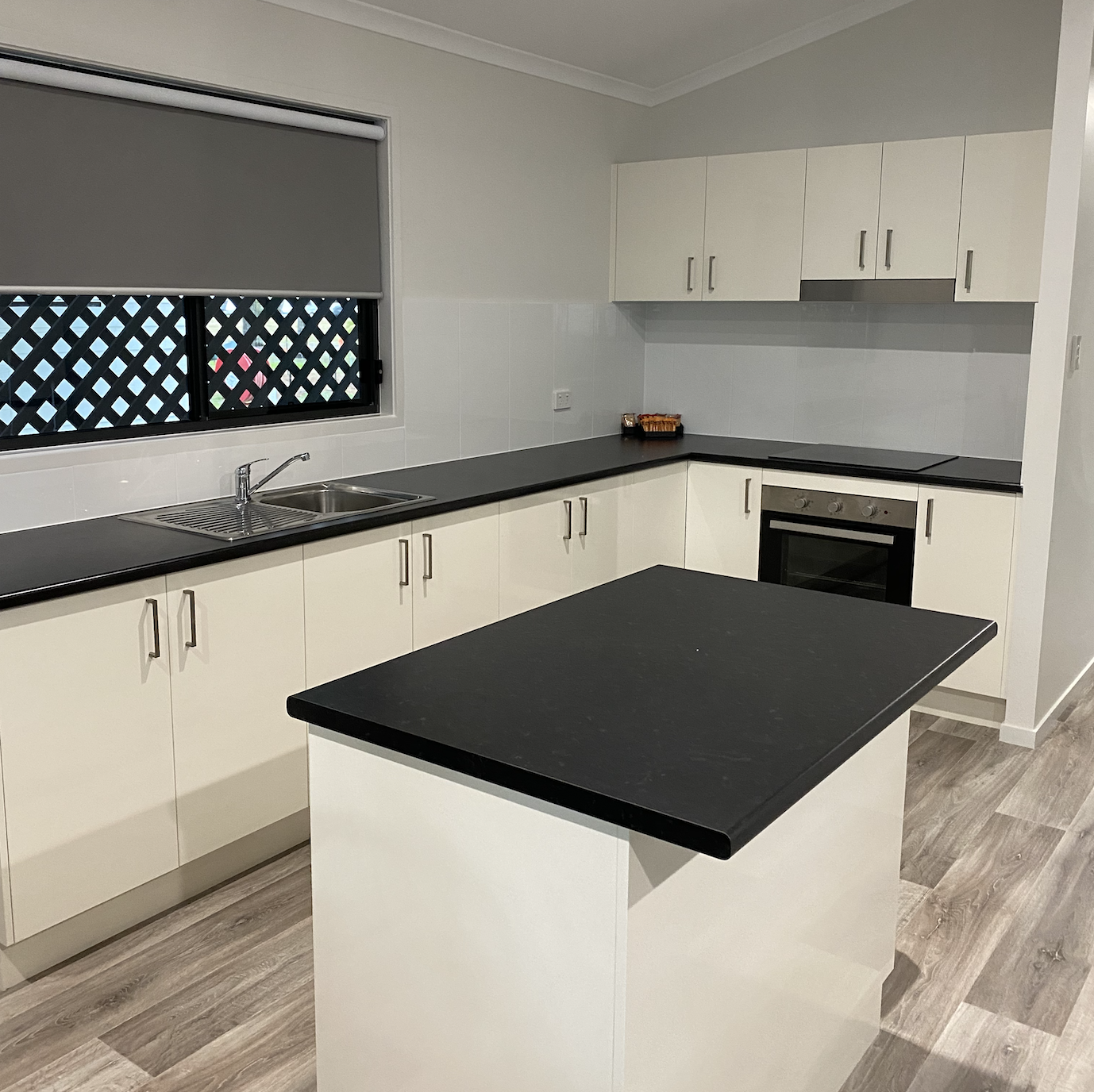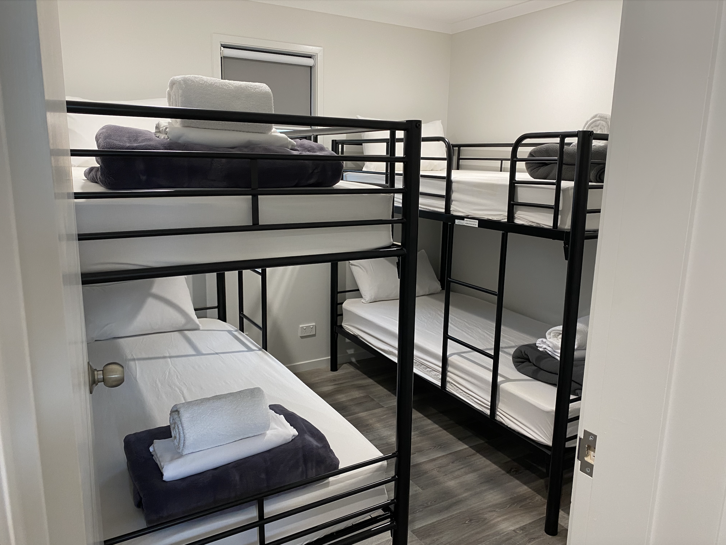 This open-plan cabin offers a queen bed in the main and second bedrooms and two sets of bunk beds in the third bedroom.