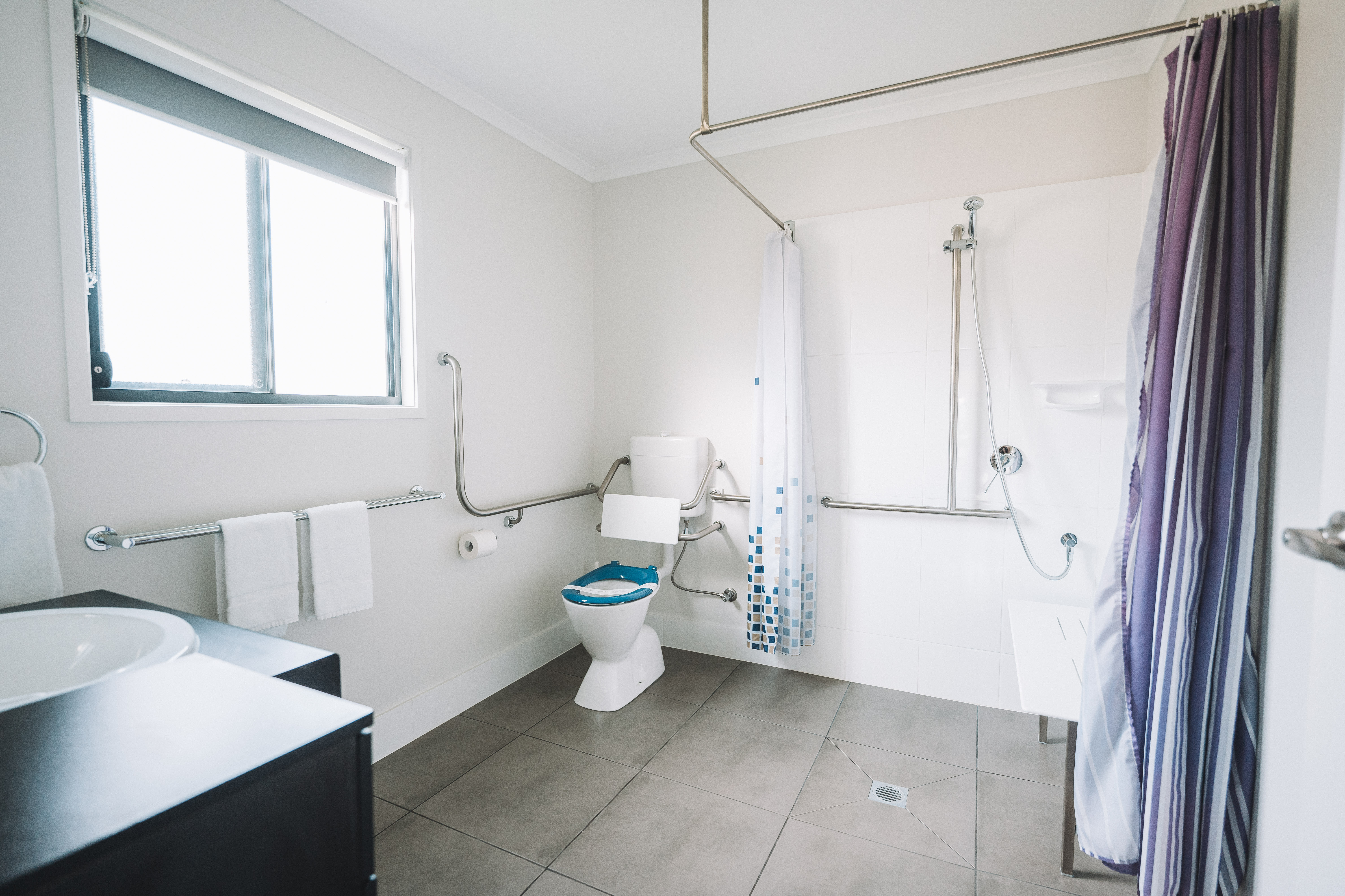 This cabin also has easy ramp access and an easy access bathroom, with a walk-in shower, toilet and vanity with grab rails.
