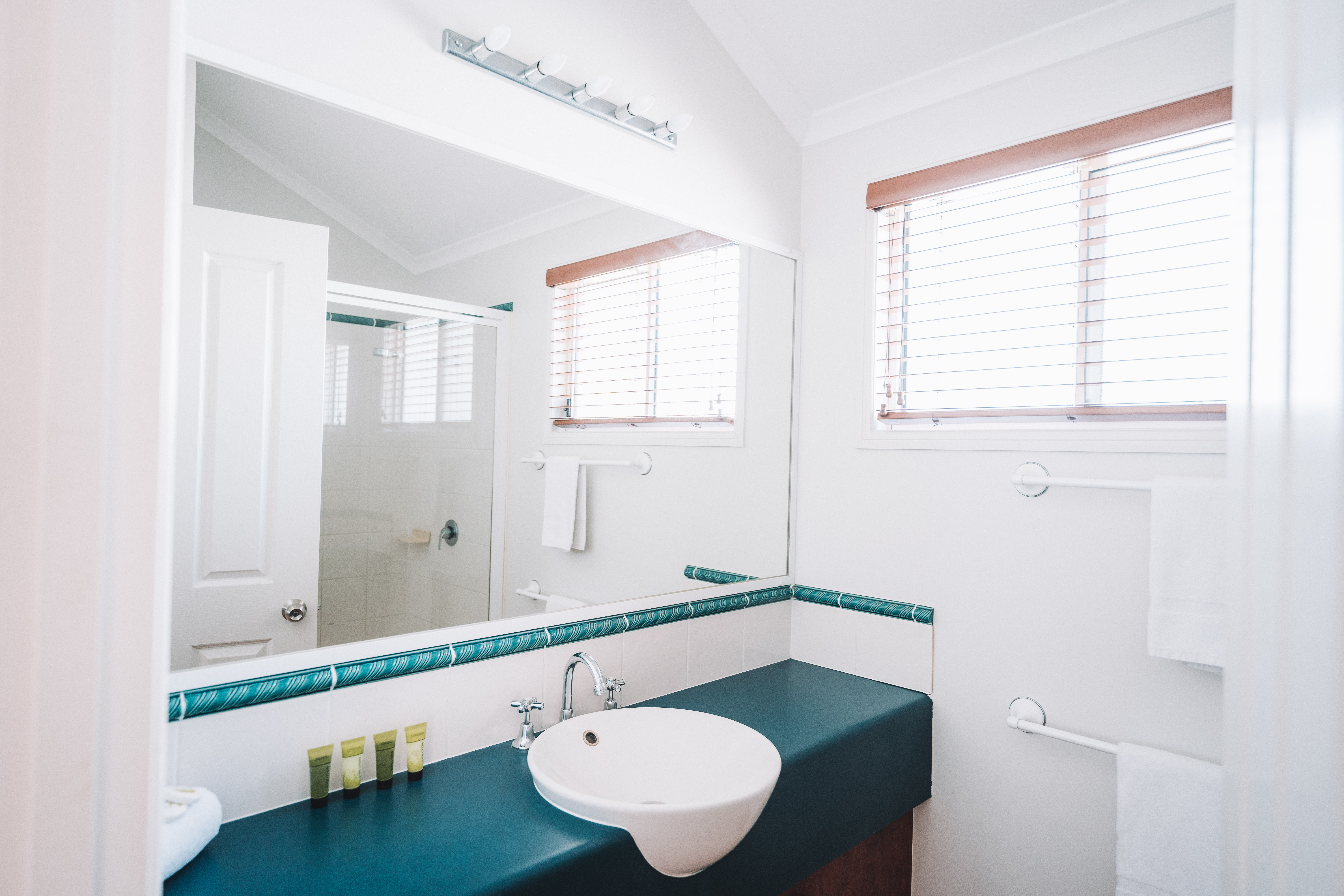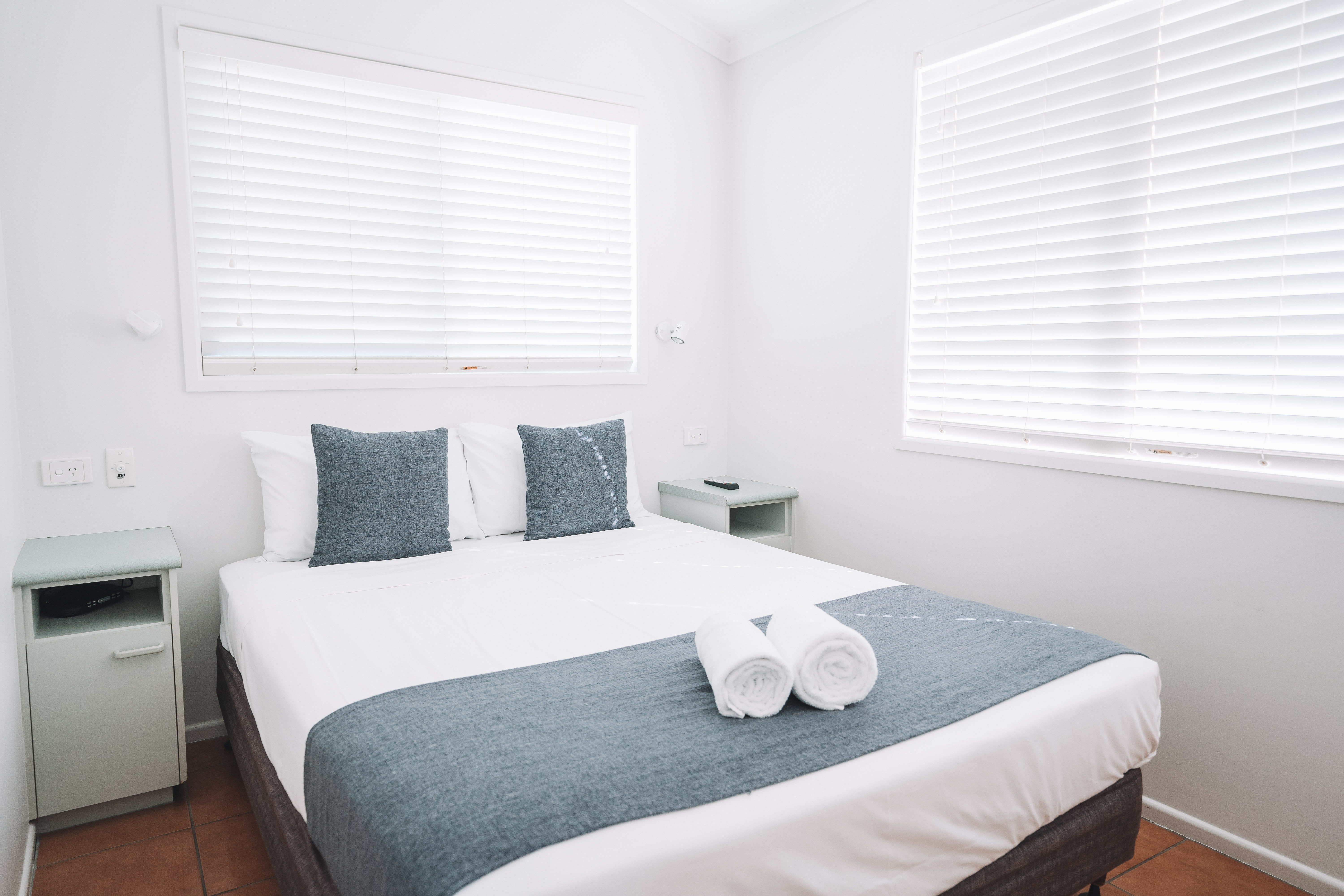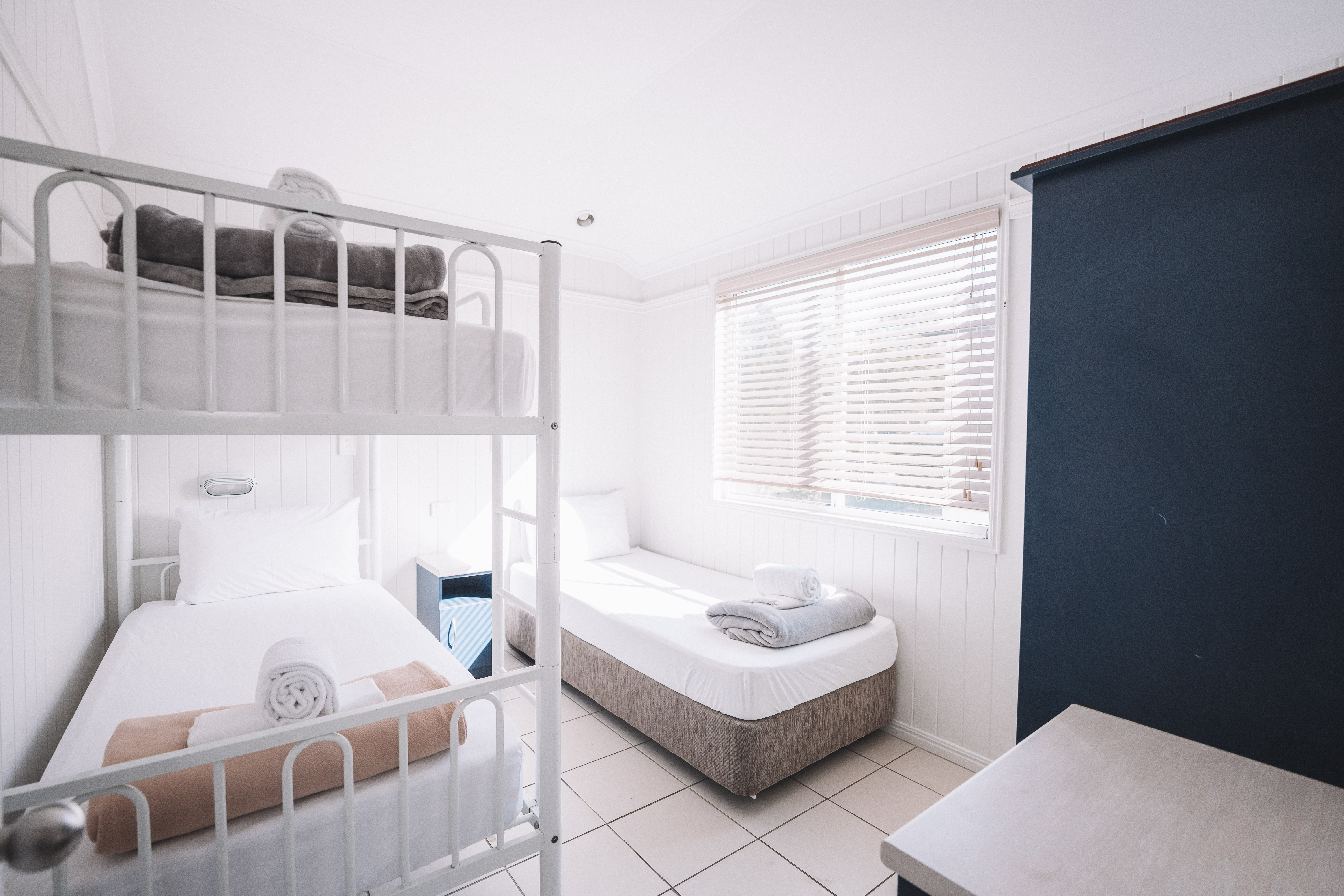 These cabins comfortably sleep up to 5 persons, with a queen bed in the main bedroom and a tri-bunk in the second bedroom. The villa has a self-contained kitchen including a fridge, microwave, oven, stovetop and plenty of crockery and cutlery with a separate dining area, and a TV in the living area. The bathroom includes a shower, toilet, and vanity. The villa is air-conditioned for your comfort.