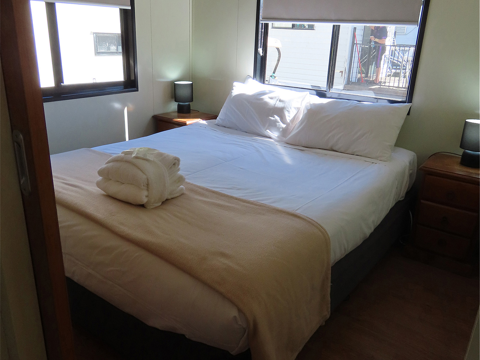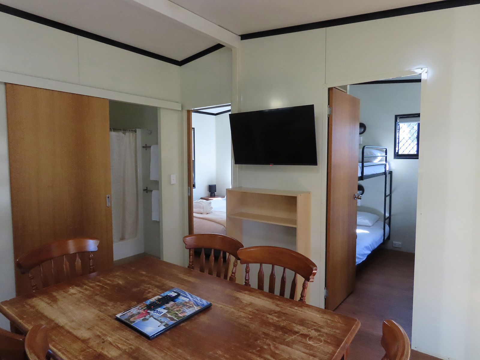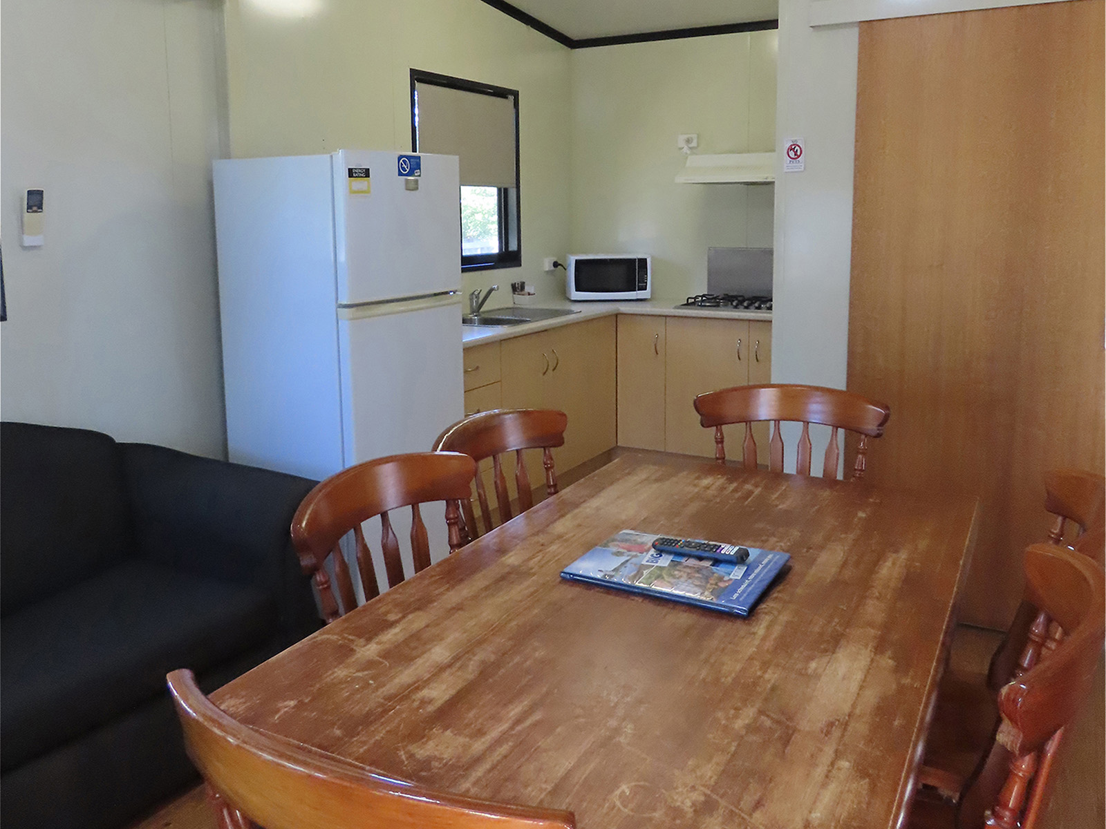 These beautiful 2 bedroom self contained cabins feature a queen bed in the main bedroom and bunks in the second bedroom. Perfect for families. The kitchen is fully equipped with utensils, crockery and cutlery. The living area also features a dining table, a lounge and a TV. There is also a verandah with a small outdoor setting for a nice breakfast out in the open.