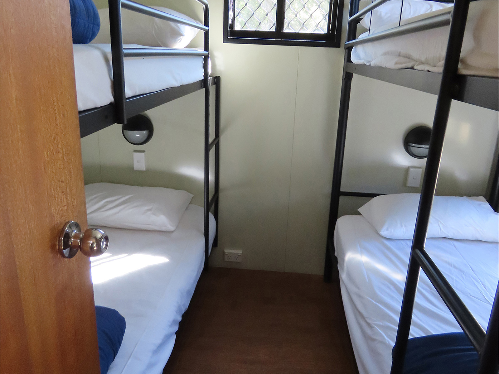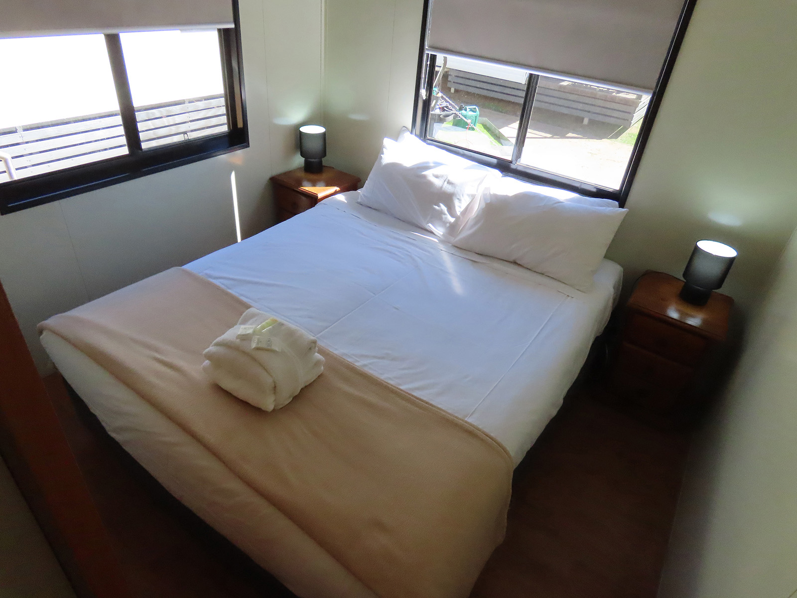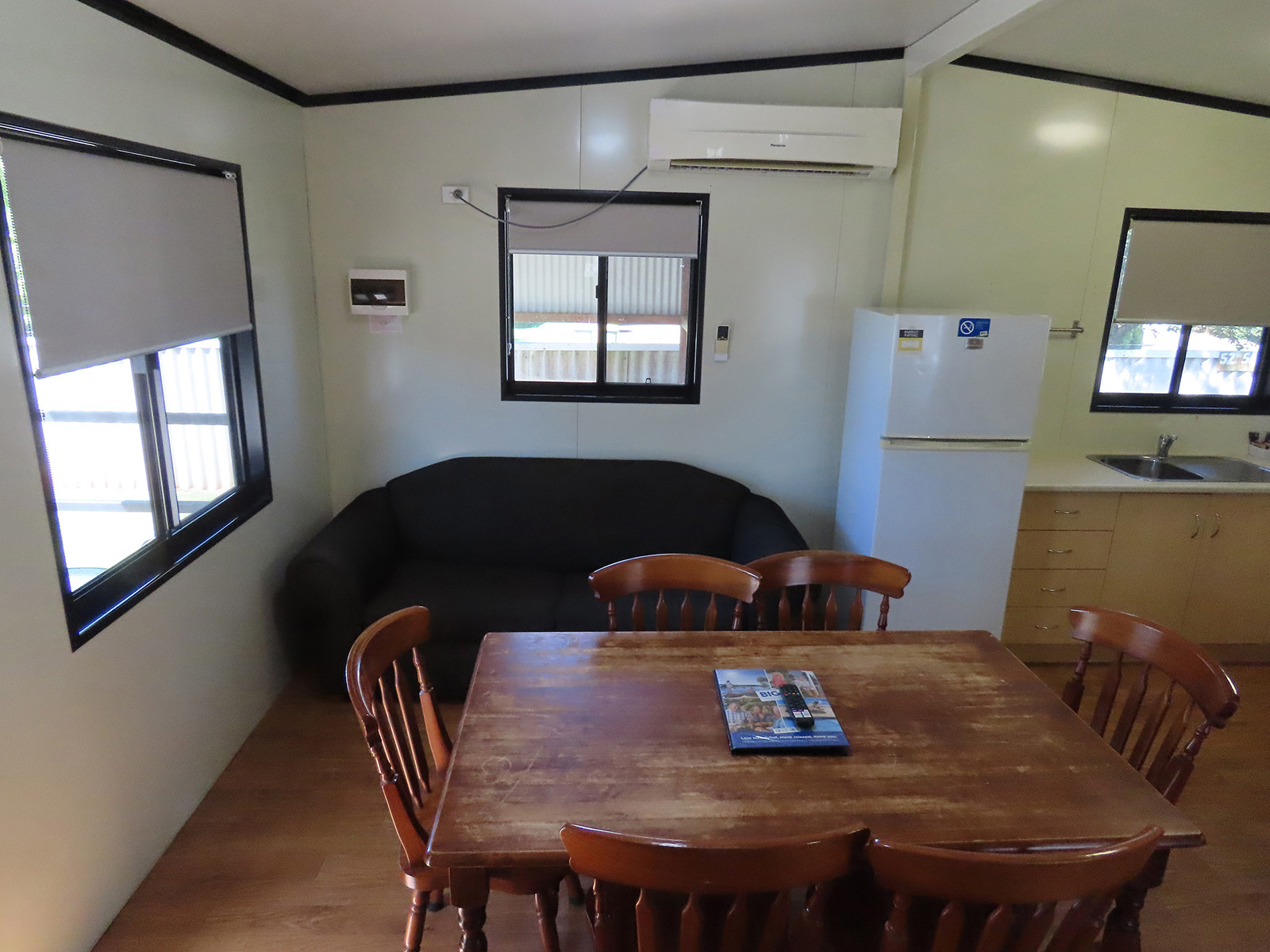 These beautiful 2 bedroom self contained cabins feature a queen bed in the main bedroom and bunks in the second bedroom. Perfect for families. The kitchen is fully equipped with utensils, crockery and cutlery. The living area also features a dining table, a lounge and a TV. There is also a verandah with a small outdoor setting for a nice breakfast out in the open.
