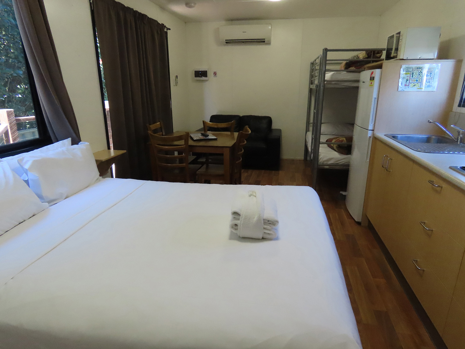 This fully self-contained modern open-plan style cabin is simple but has all the necessities. Featuring 1 x queen bed & 1 x set of bunks. Sleeps 4. Cabin has ensuite, cooking facilities, and split system/reverse cycle air conditioning for you to enjoy. These Cottage Cabins are close to all of the park facilities, BBQs, laundry, and pool.