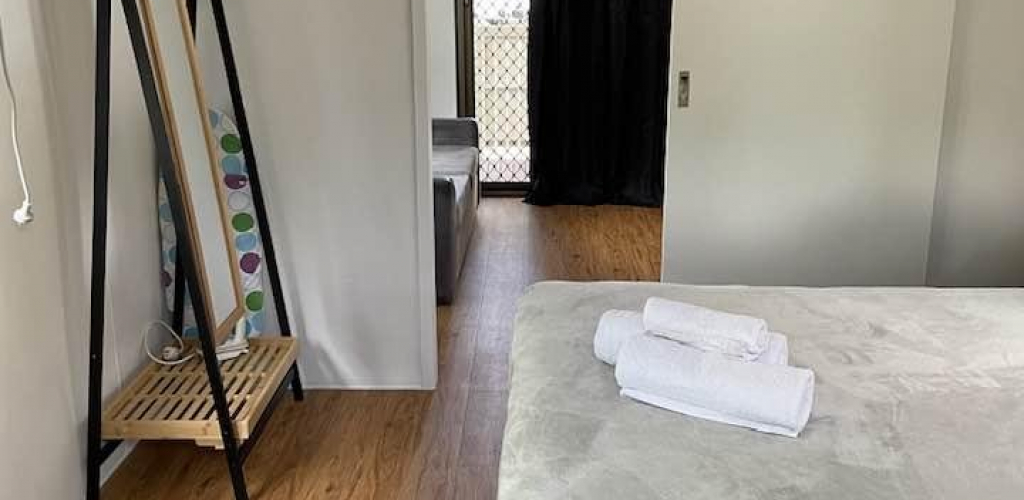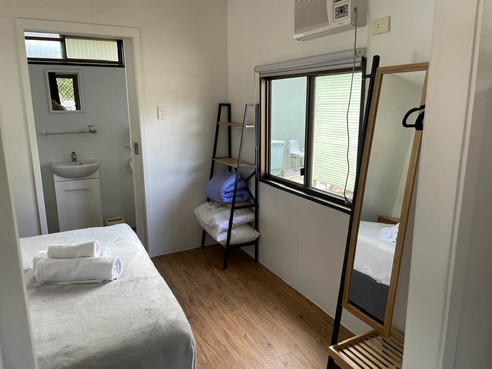 Our older style elevated bungalows have a great view of the campgrounds. Each Bungalow is fully self-contained and includes a kitchenette, living area with sofa bed, bedroom with queen bed, ensuite bathroom and private verandah area. This cabin comes with 1 vehicle parking space only.