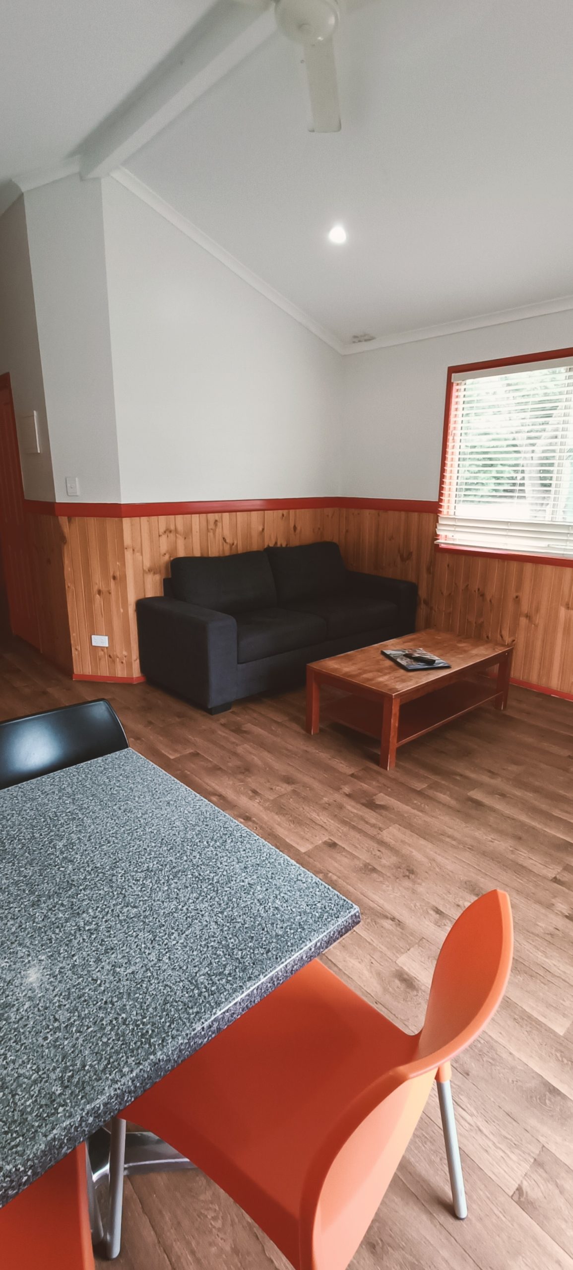 Our 2 bedroom Family Cabins are perfect for families, with a good sized living area, dining table, full kitchenette, and bathroom with separate toilet. There are two bedrooms, the main featuring a queen bed, and the other bedroom featuring either two single beds or two double bunk beds. There is also a sofa bed in the living area. These sleep up to six people. An outdoor setting is included on your private balcony.