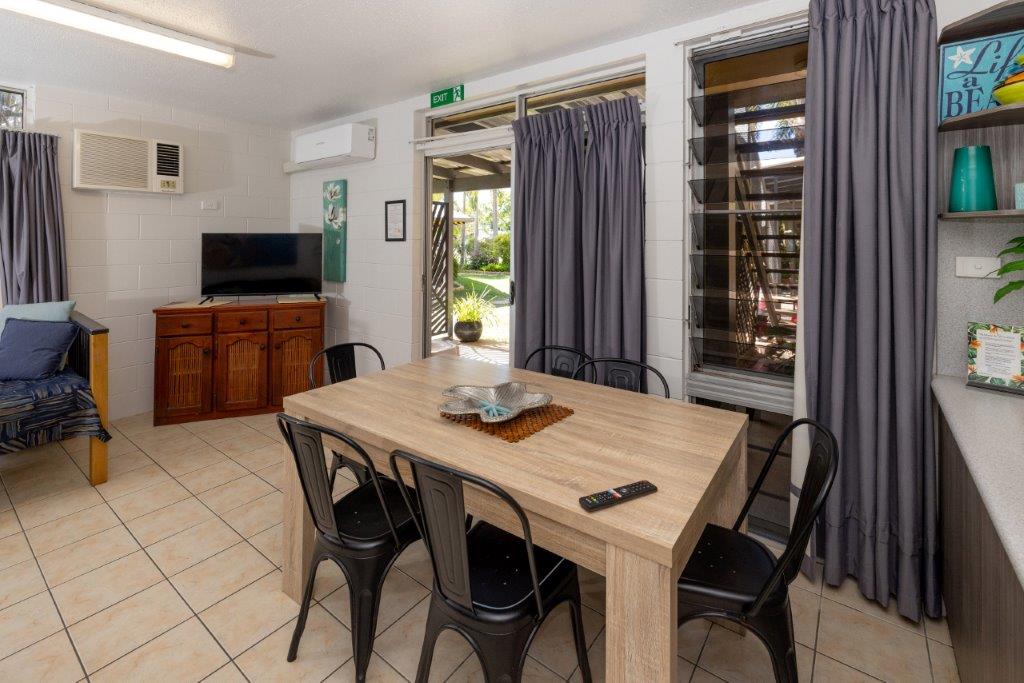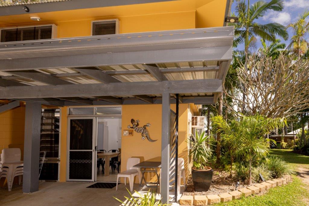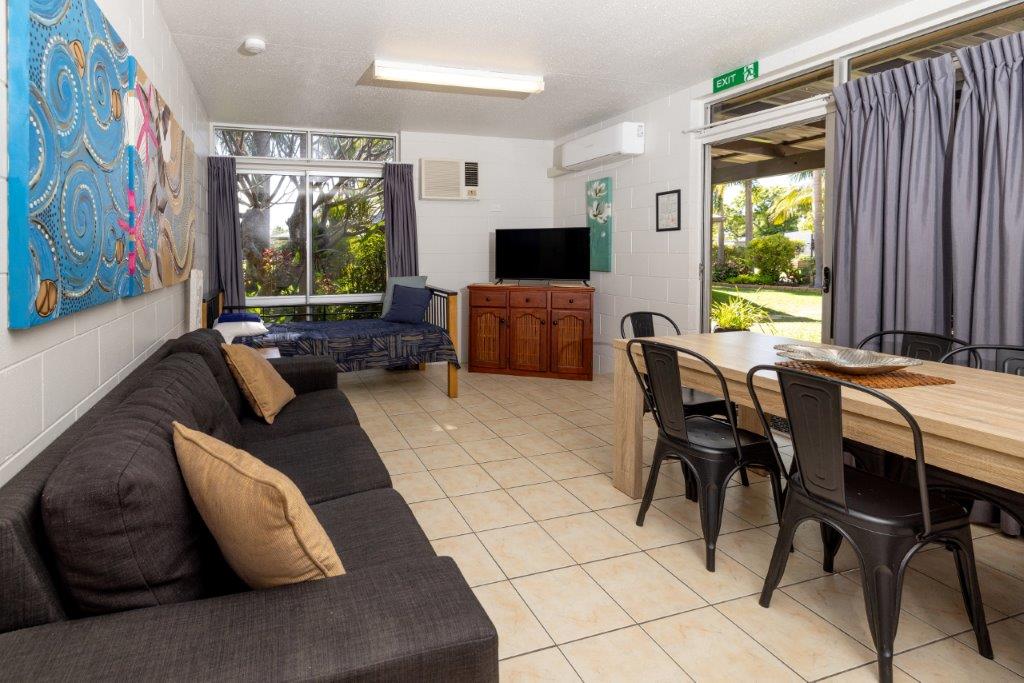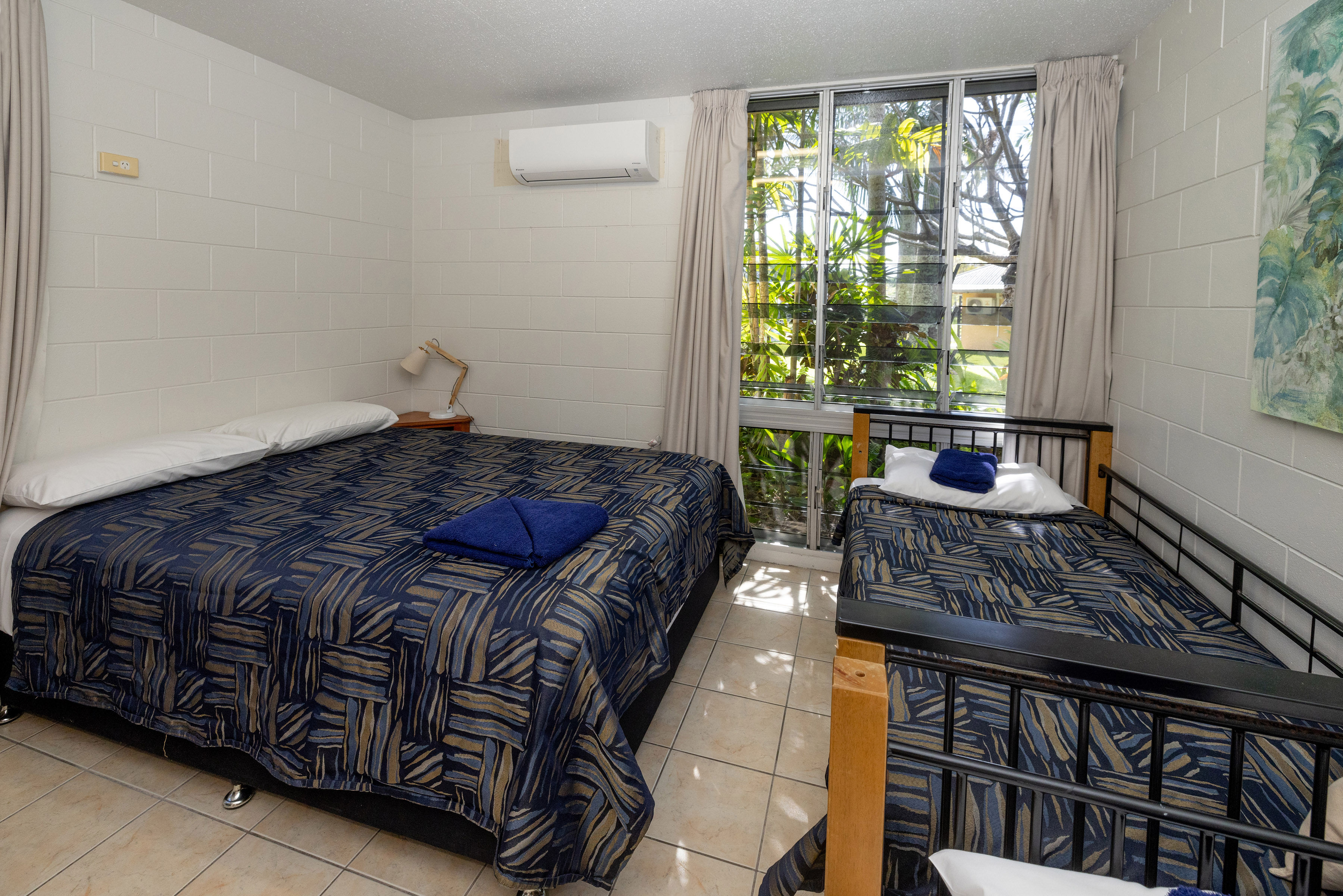 Escape to a spacious one-bedroom unit that sleeps up to six guests. With one queen bed and four singles, it's ideal for families or small groups. Enjoy a full kitchen with fridge, microwave and stovetop, air conditioning, and a patio with outdoor dining. Cooling fans, TV, and on-site parking complete the setup. BBQs are just steps away for easy outdoor meals.
