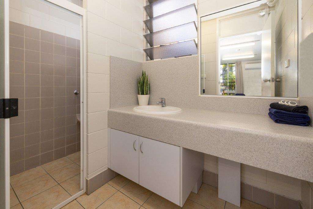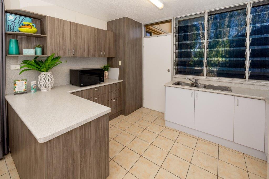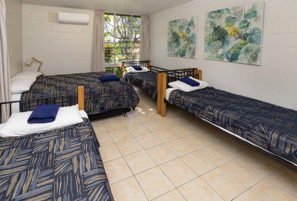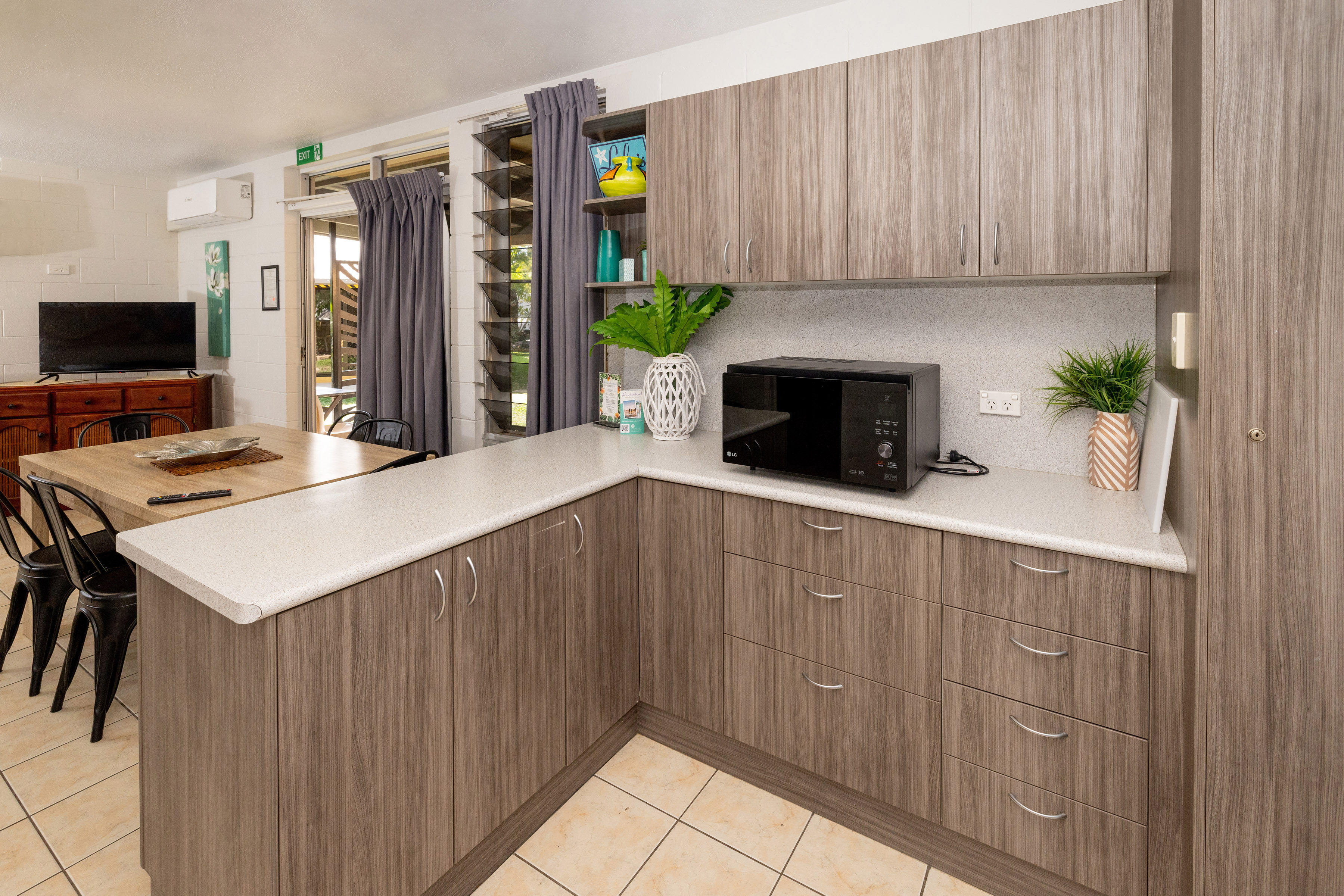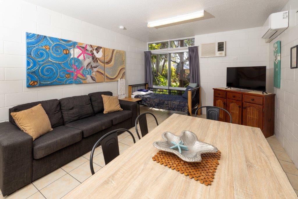 Escape to a spacious one-bedroom unit that sleeps up to six guests. With one queen bed and four singles, it's ideal for families or small groups. Enjoy a full kitchen with fridge, microwave and stovetop, air conditioning, and a patio with outdoor dining. Cooling fans, TV, and on-site parking complete the setup. BBQs are just steps away for easy outdoor meals.