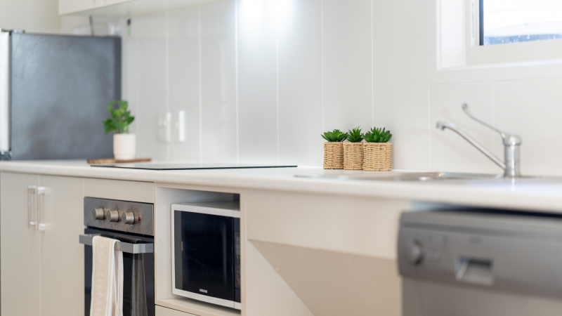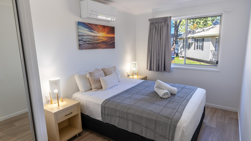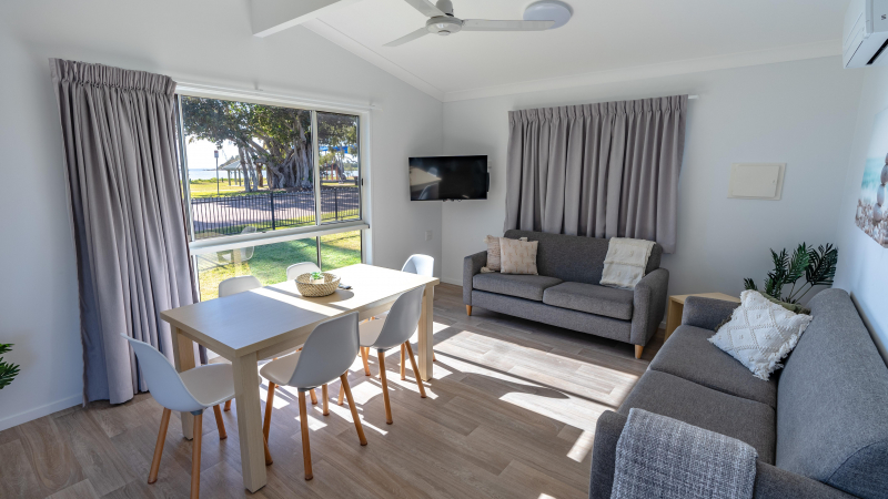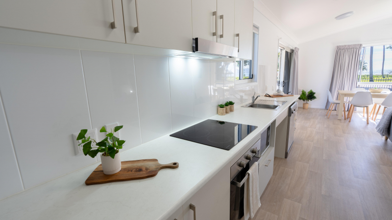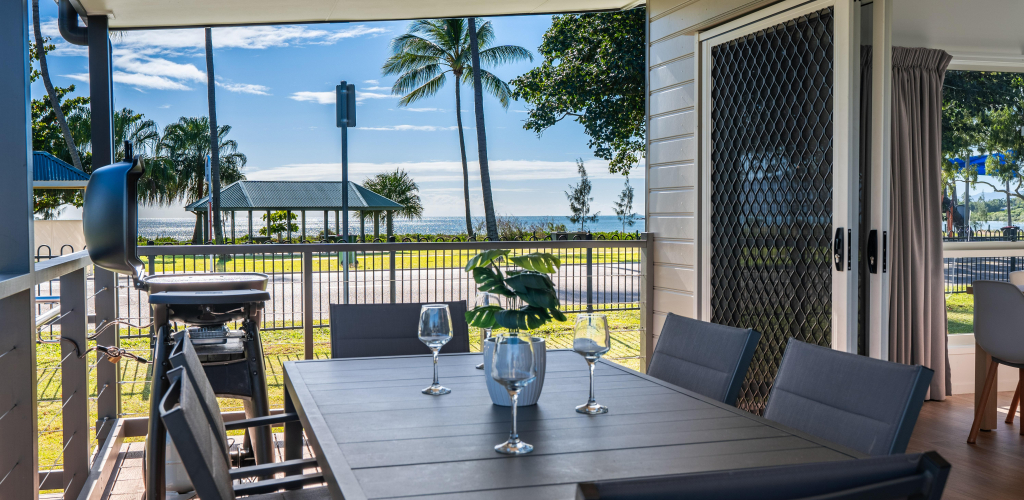 Our Oceanview Deluxe Villa has 3 separate bedrooms sleeping up to 8 people. Two rooms with queen beds and one bunk room sleeping 4 children. Each bedroom has split system A/C. There are 2 toilets, and a shower. The fully equipped kitchen has a cooktop, fridge freezer and microwave. These well appointed cabins have a washer and dryer included, and a large deck with ocean views.