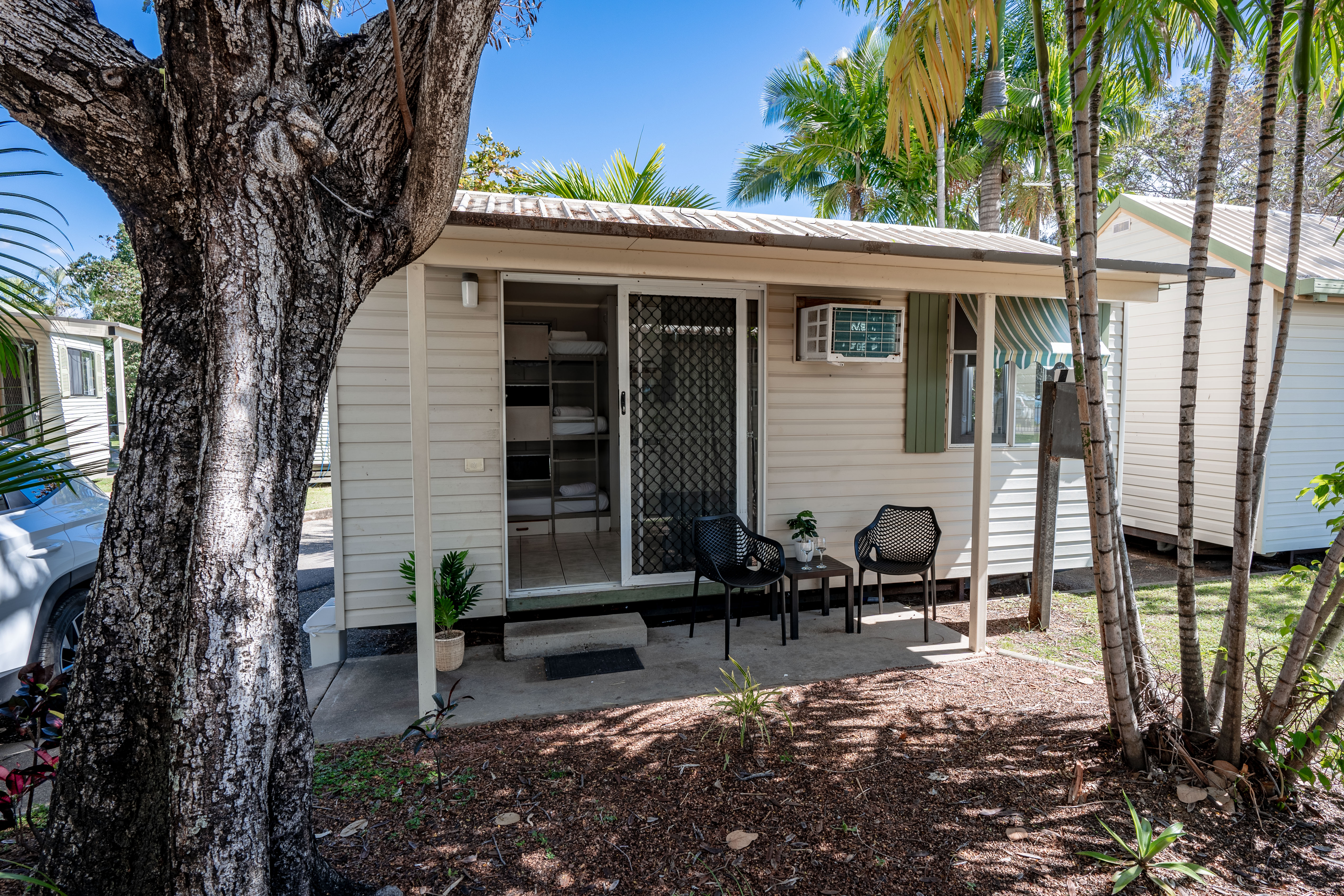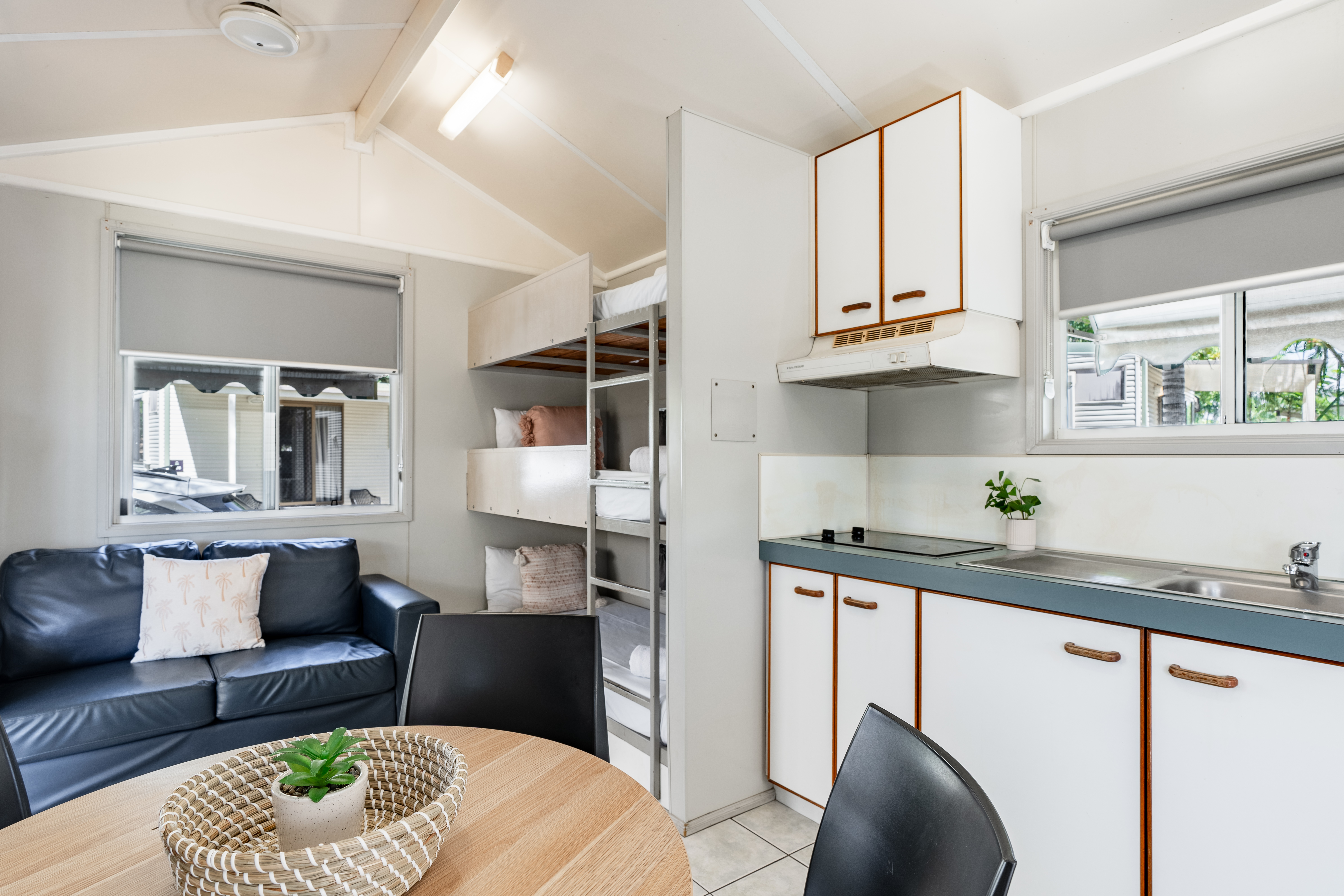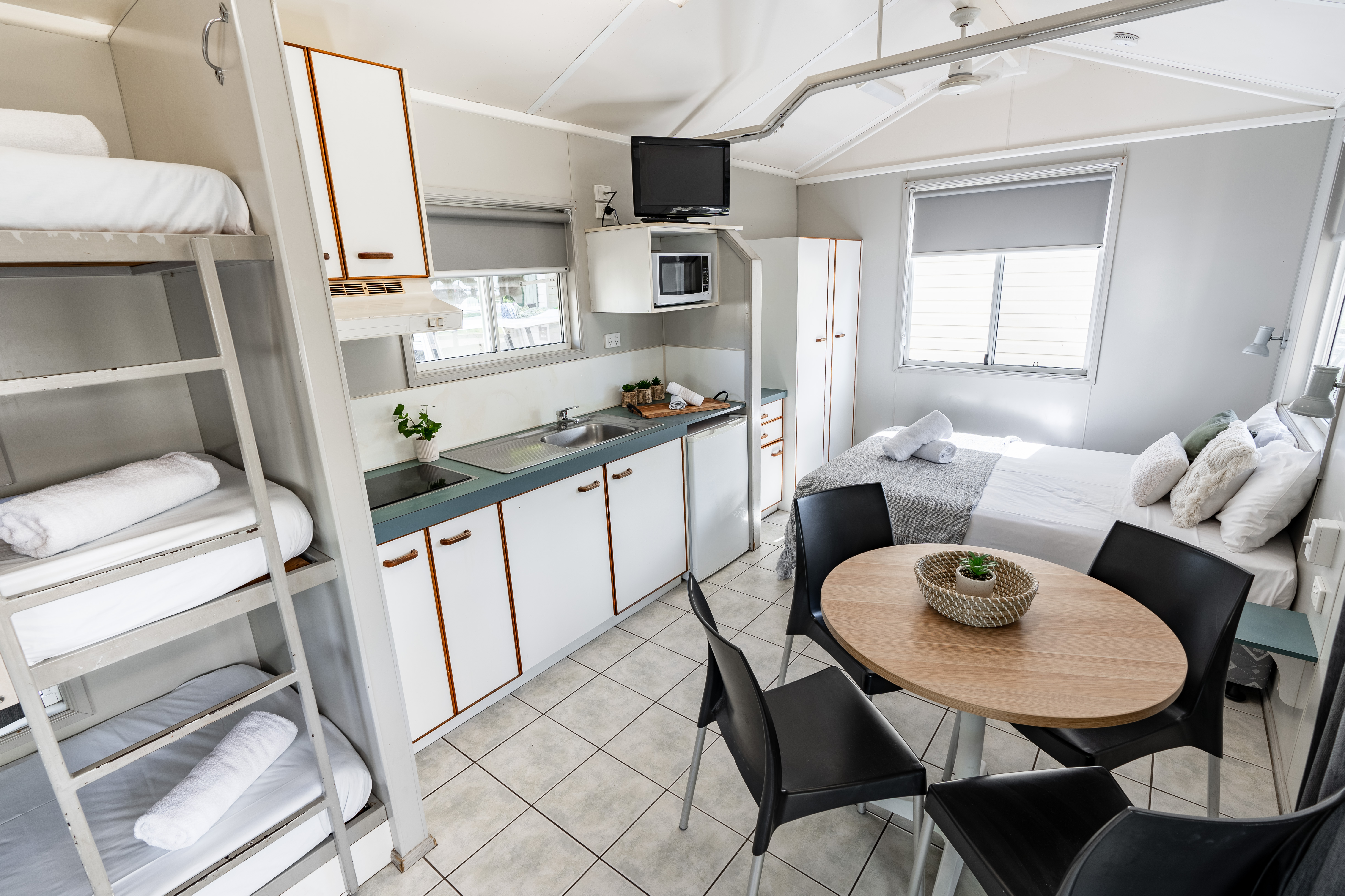 Standard Cabins include: double bed and triple bunk bed (3 single beds). Open plan with main bed and bunk bed. Lounge, air conditioner, ceiling fan, security screen door, flat screen TV. Dining table and chairs. Kitchen includes microwave, bar sized fridge & cook-top, crockery, cutlery & utensils. Iron & ironing board. Small patio with outdoor furniture.