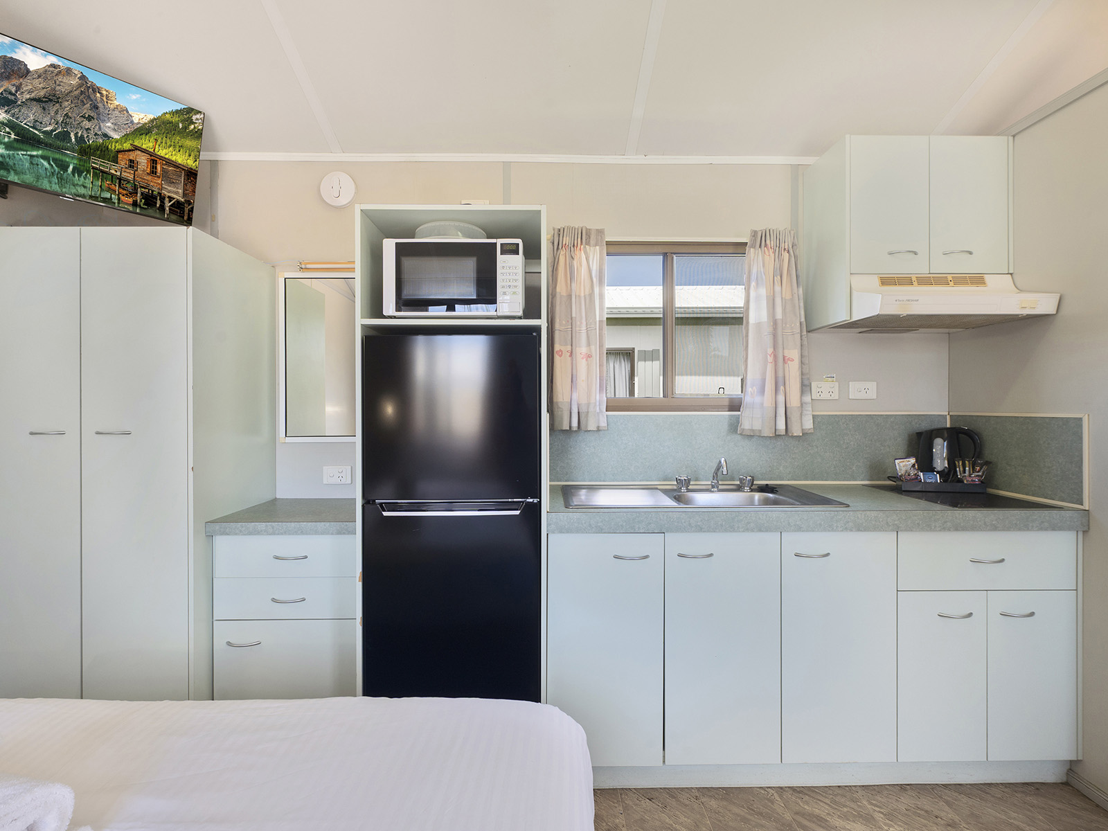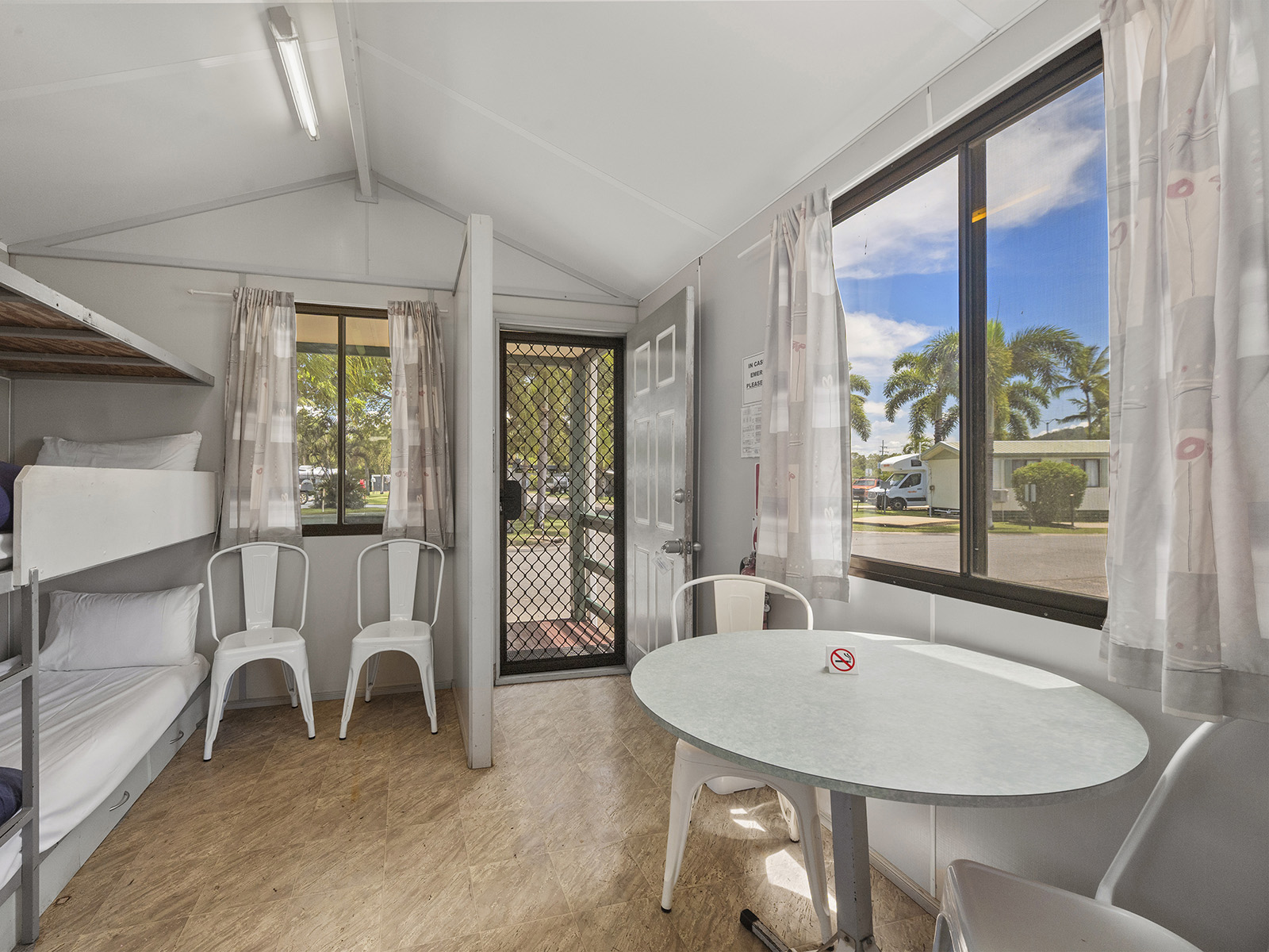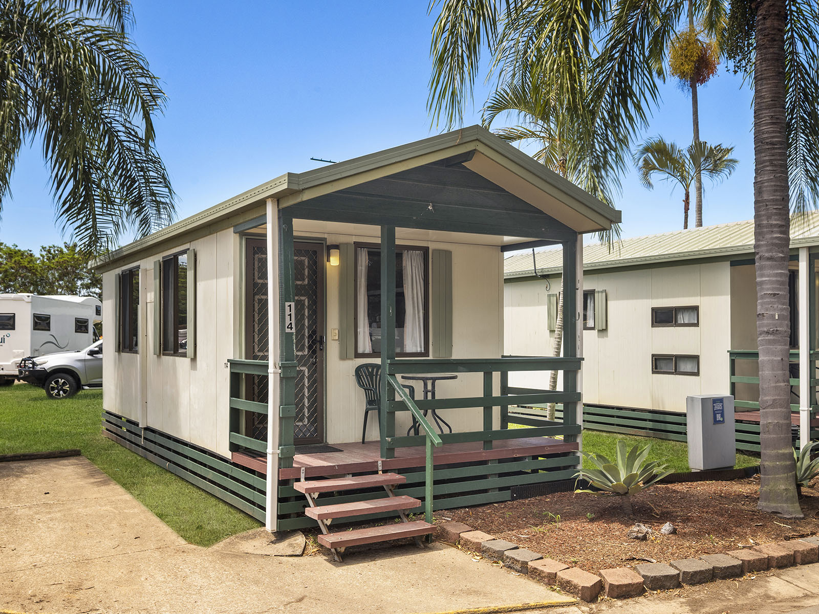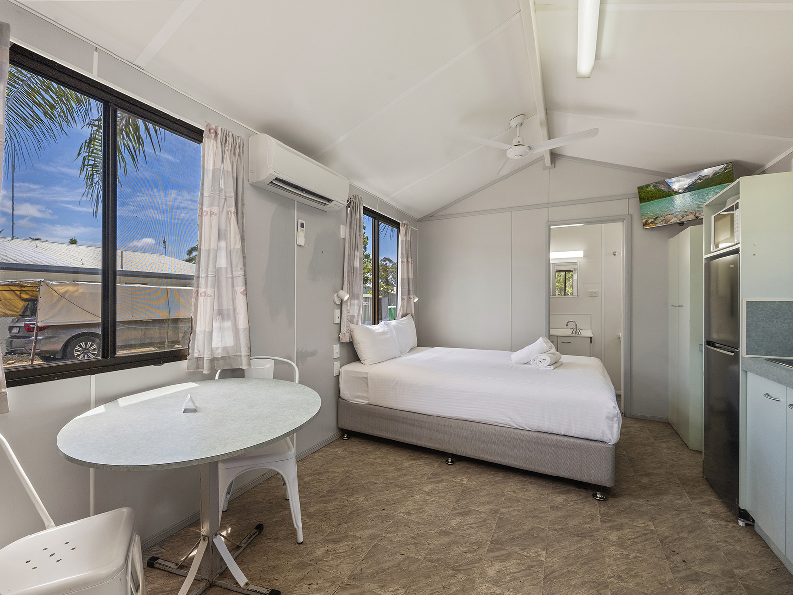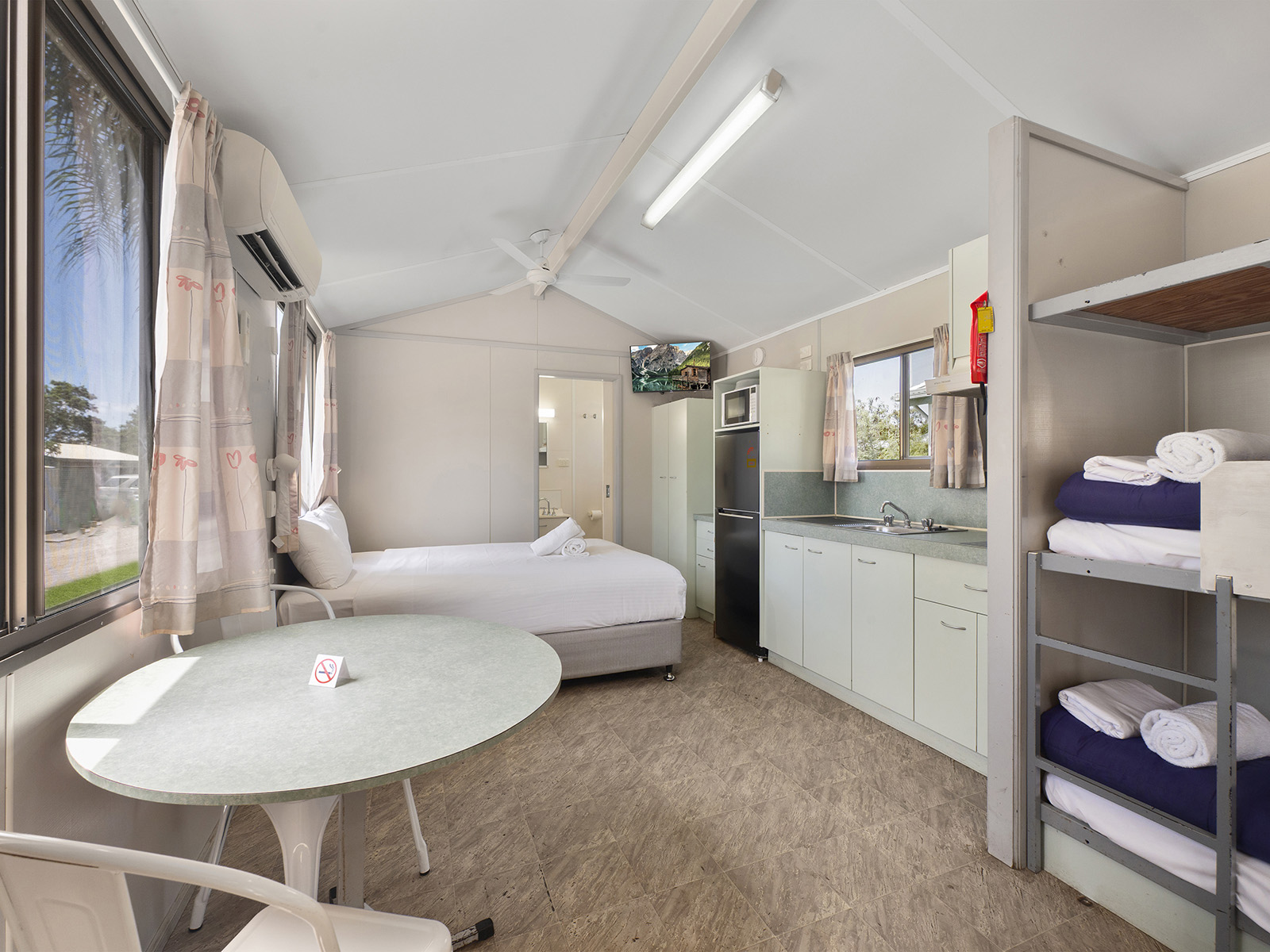 This compact studio sleeps up to four with a double bed and bunk set in an open-plan layout. Includes air conditioning, kitchenette with fridge, microwave and portable double cooktop, and private bathroom. A practical pick for budget-conscious guests wanting comfort and access to park facilities.