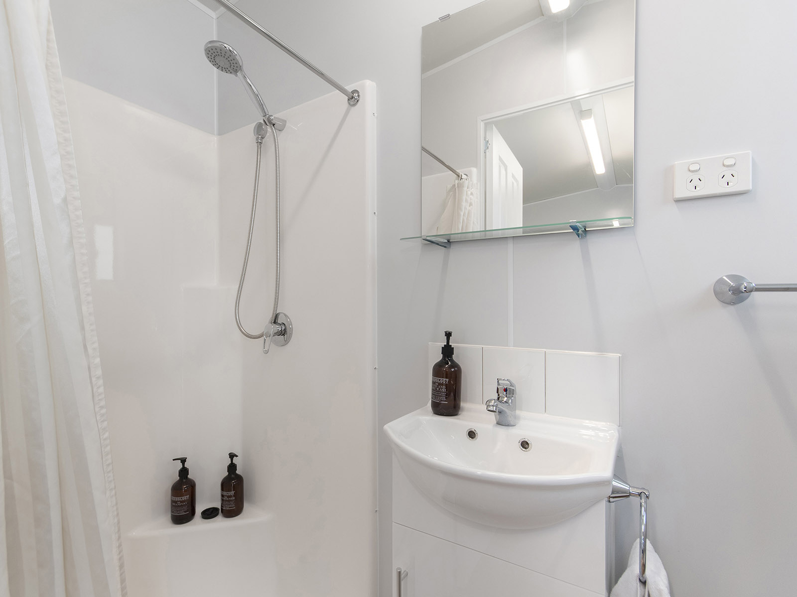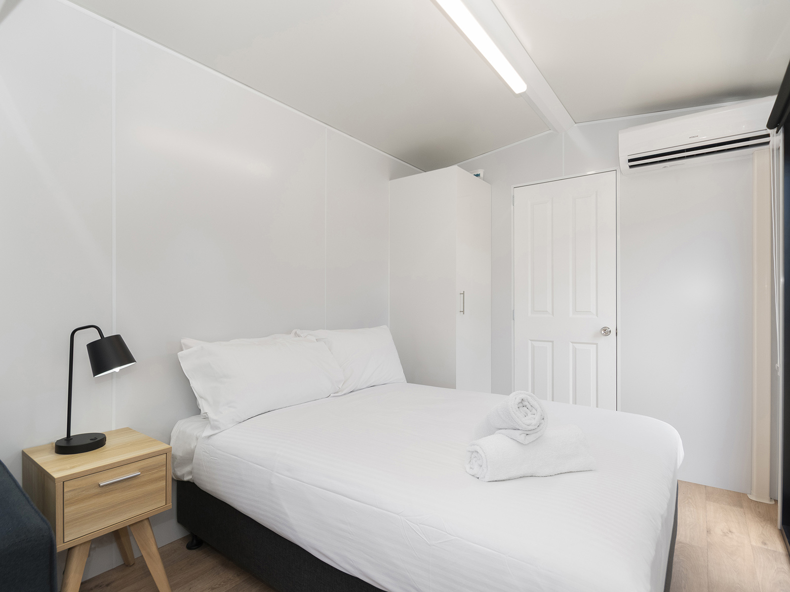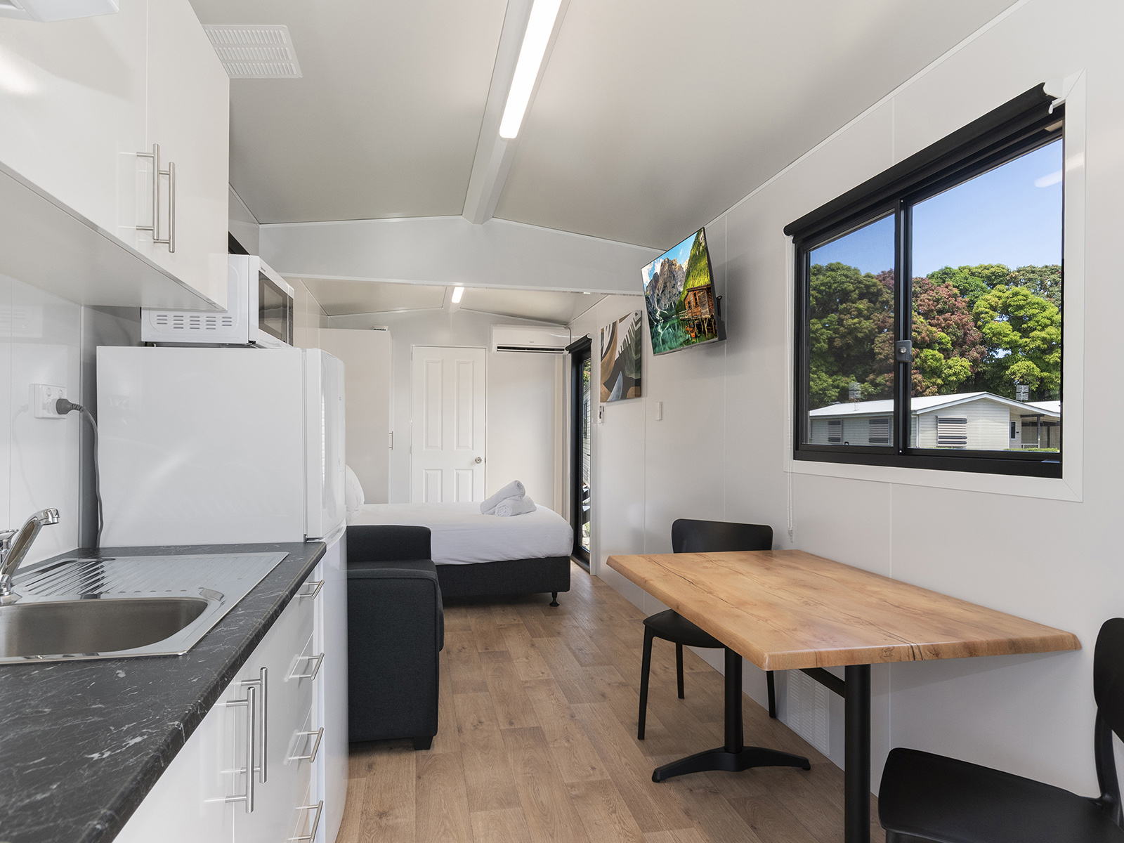 This compact studio sleeps two with a double bed, ensuite bathroom, and kitchenette. Air conditioning and a dining area provide added comfort, and a small verandah allows for outdoor sitting. Best suited to guests seeking simple, self-contained accommodation.