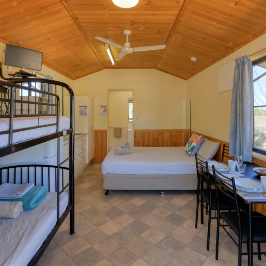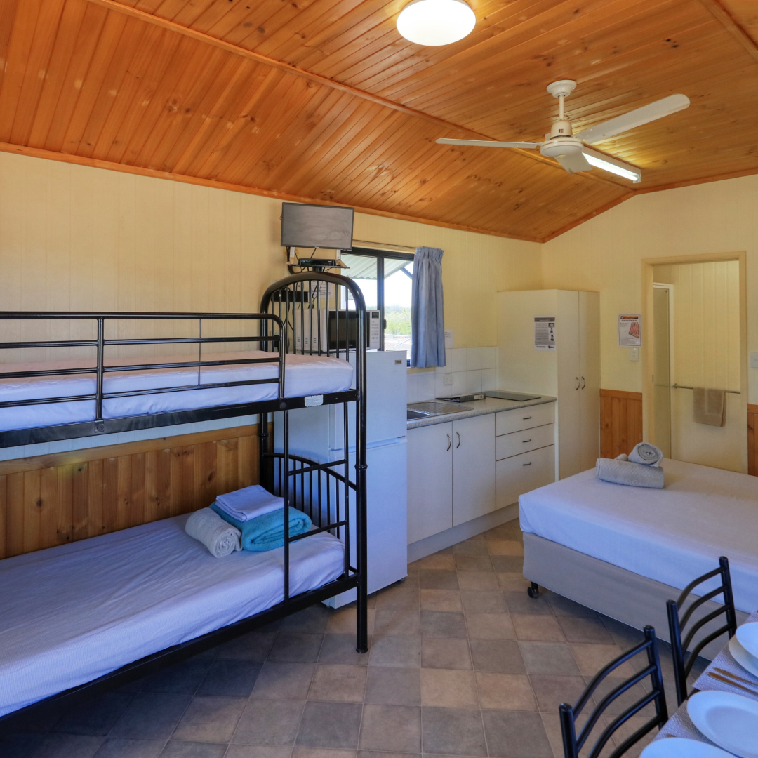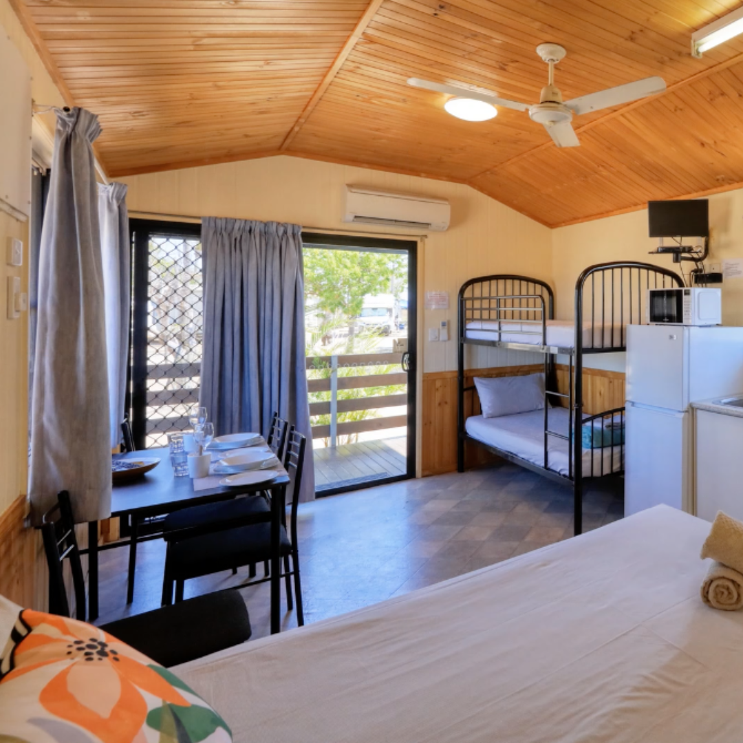 Unwind and relax in our comfortable open plan villas. Sleeping up to 4, there is one queen bed and 1 set of bunks. Linen supplied. Full ensuite. The kitchenette is fully self-contained with hotplates, microwave, fridge/freezer and all cutlery & crockery. Air conditioning and ceiling fan will ensure that you will remain cool while you are being entertained by the TV. Villas have a little veranda with outdoor setting, watch the sunset & wildlife. Villas 1-6 have parking available for boats.
