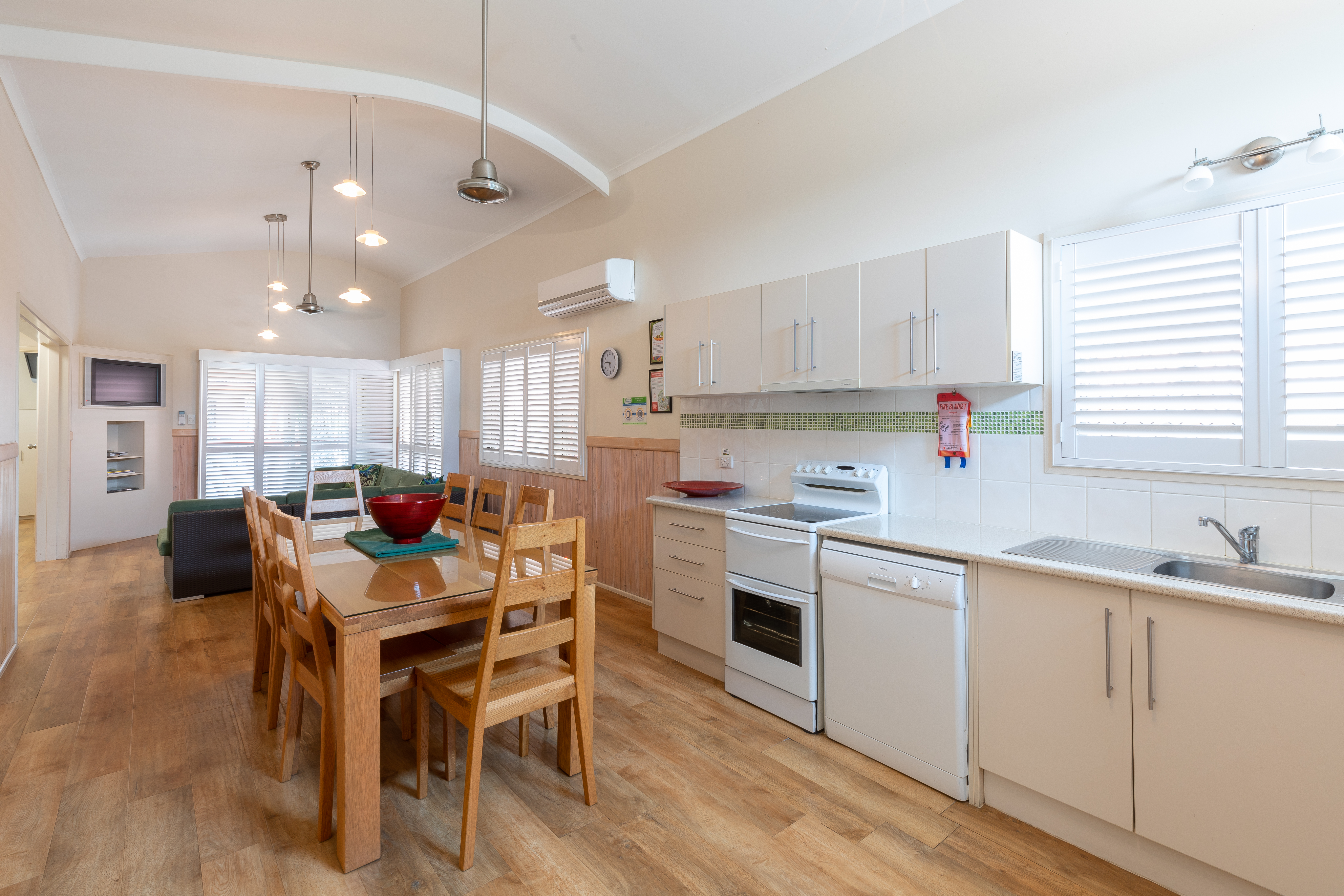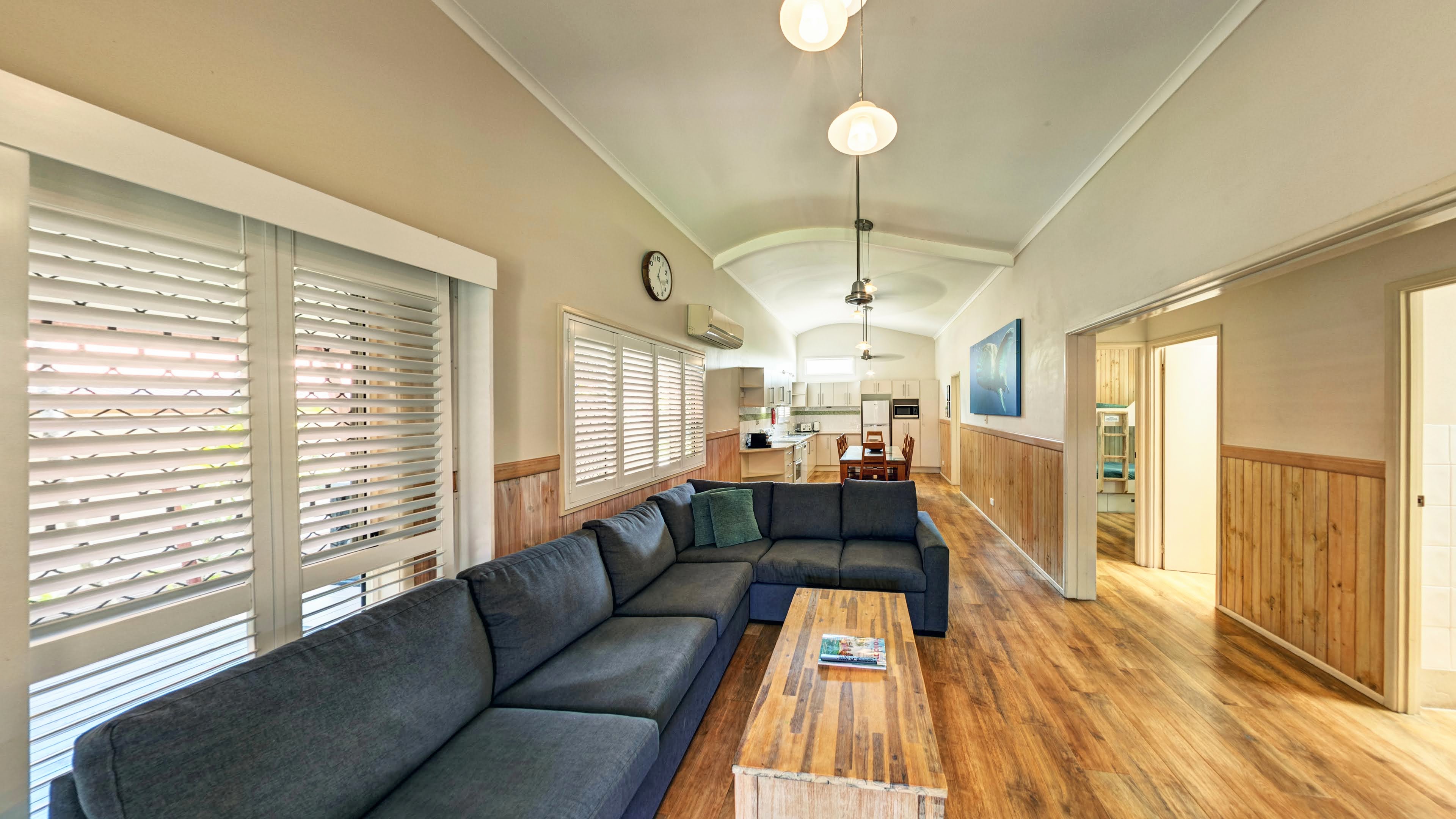 The same great design as our pool view condos, but with a tranquil garden setting that offers a lovely sense of relaxation. These condos share a beautiful grassed area for the kids to play and enjoy while you cook up a storm on your private barbecue. With three bedrooms, two bathrooms and an enormous living area, our condos are ideal for a large family or two families travelling together. The main bedroom has a queen bed with ensuite, the second bedroom has a queen bed, and the third bedroom has four single bunks. The second bathroom features a massive spa and separate toilet. The condo features a full kitchen with an oven and dishwasher, washing machine, dryer, and huge balcony with private barbecue. A minimum two-night stay applies depending upon the season.