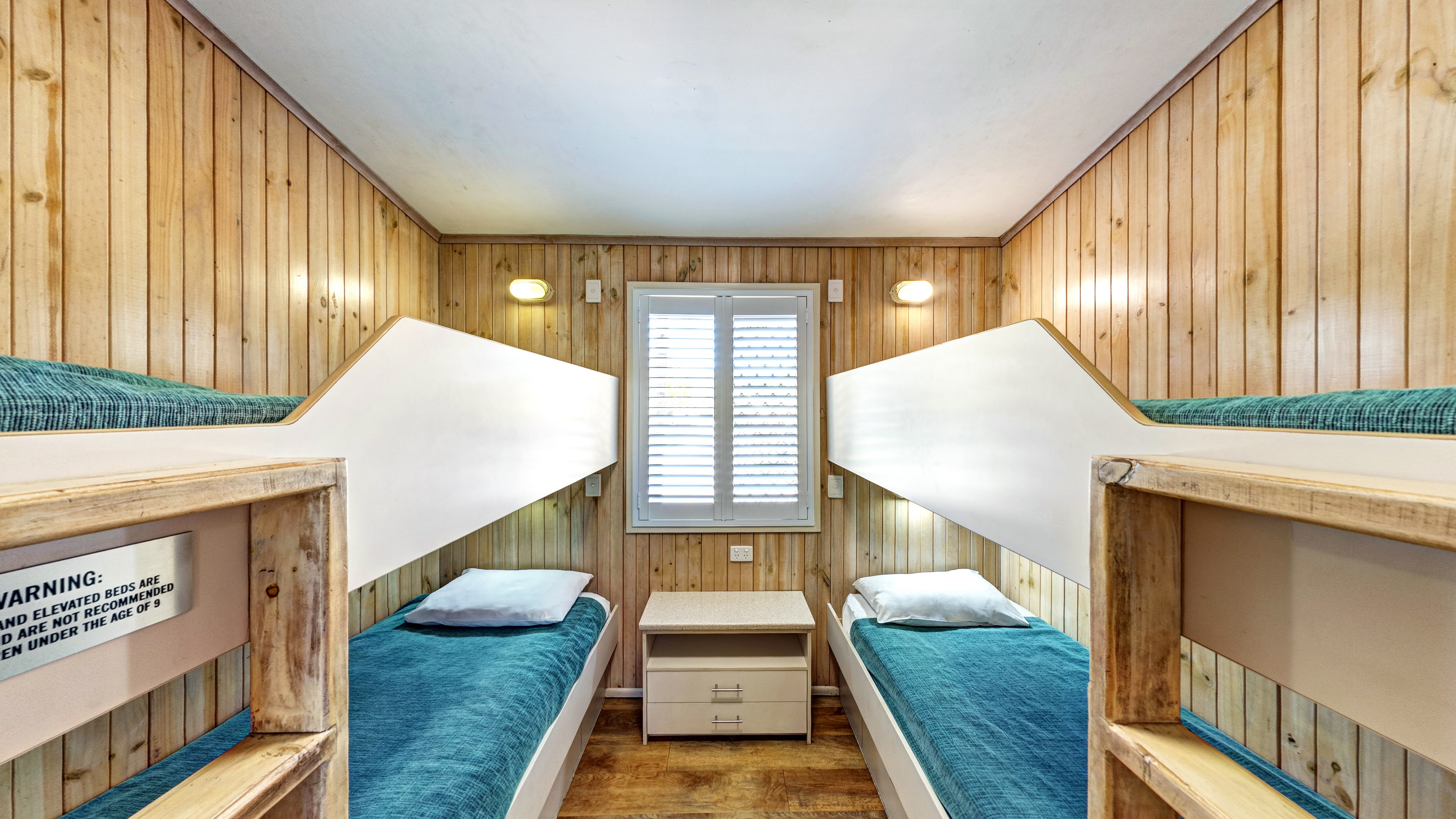 1. Bunk Beds: Please be advised that under Workplace Health and Safety obligations we must comply with the Australian Standard AS/NZS 4220:2003 which states “children under the age of nine years are not permitted to use the top bunk, children must not play on the top bunk". Please take this into consideration when making your booking.