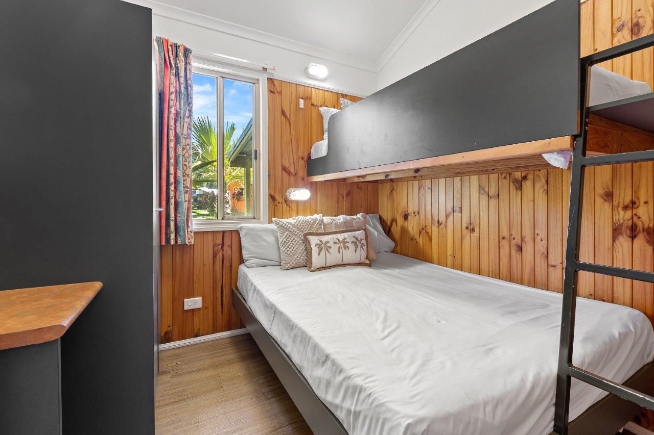 Our Garden Villa has 2 bedrooms. One features a queen bed, while the other offers a Trio bunk bed (double on the bottom and single on top). The cabin includes a well-equipped kitchen with a microwave, rice cooker, and stovetop. Enjoy a separate dining area, a TV in the lounge, and a balcony with outdoor furniture. The bathroom has a separate toilet, and the villa is air-conditioned with fans throughout. It's perfect for families or small groups. Outside, you'll find covered parking. Linen is supplied. Sorry, no pets.