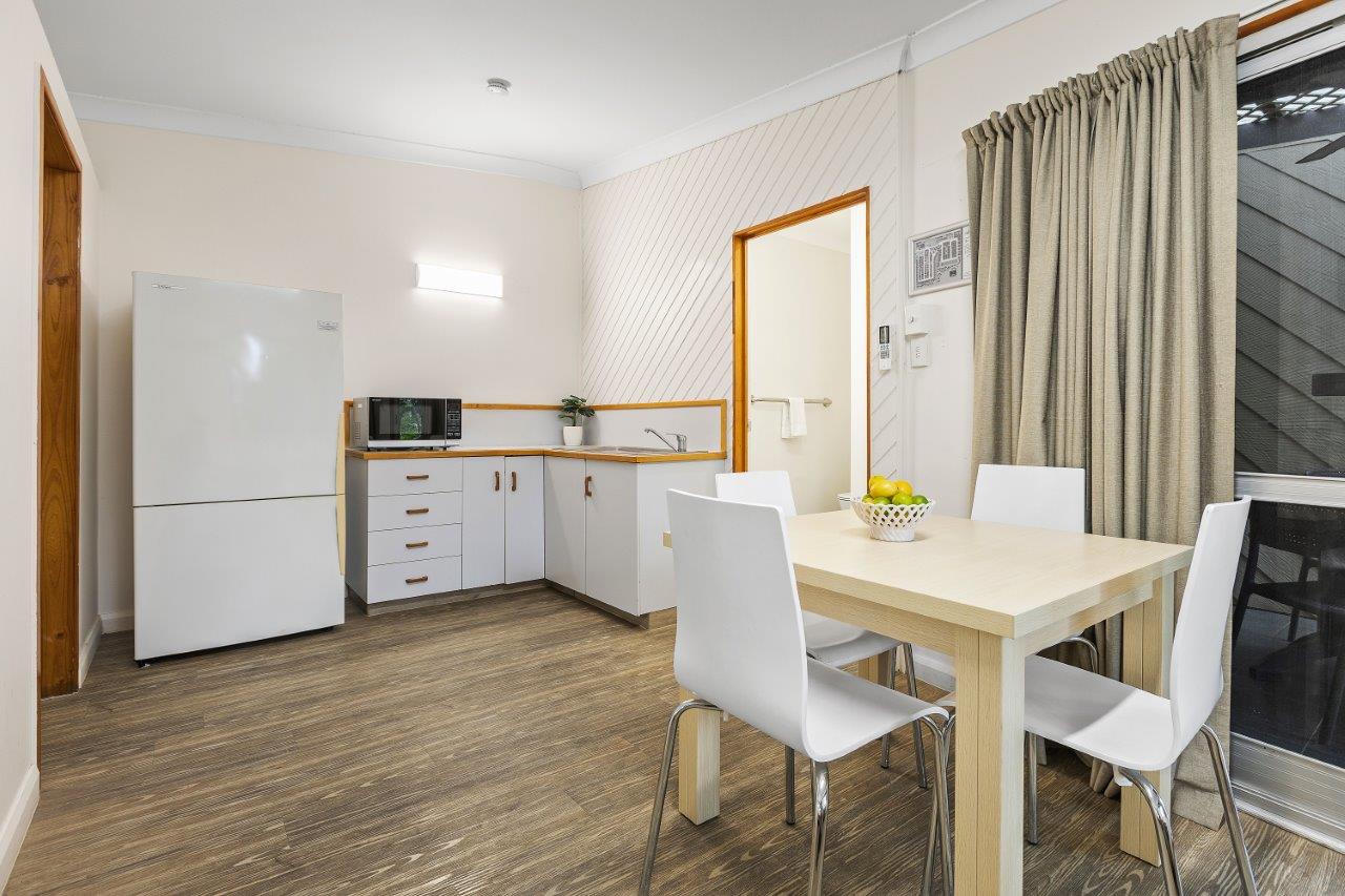 Our Motel Family Room features a spacious open-plan layout with a queen bed and a dividing wall with two bunks. The living area includes a well-equipped kitchenette with a microwave, toaster, and kettle. Relax on the sofa while enjoying the TV, or step outside to the patio with outdoor furniture. The room also has a bathroom and toilet, and it's air-conditioned for your comfort. Parking is nearby, and we provide linen. Sorry, no pets allowed.
