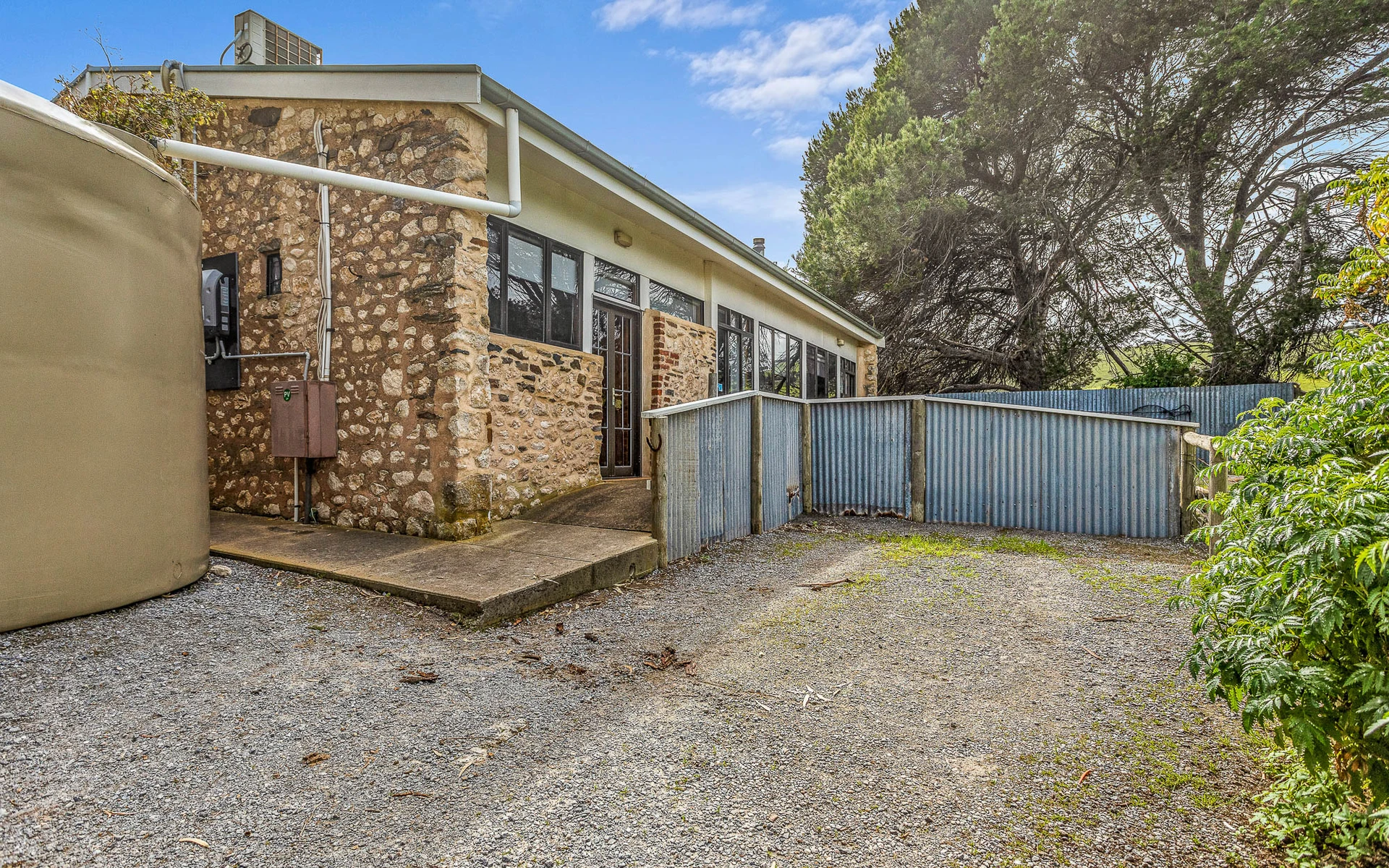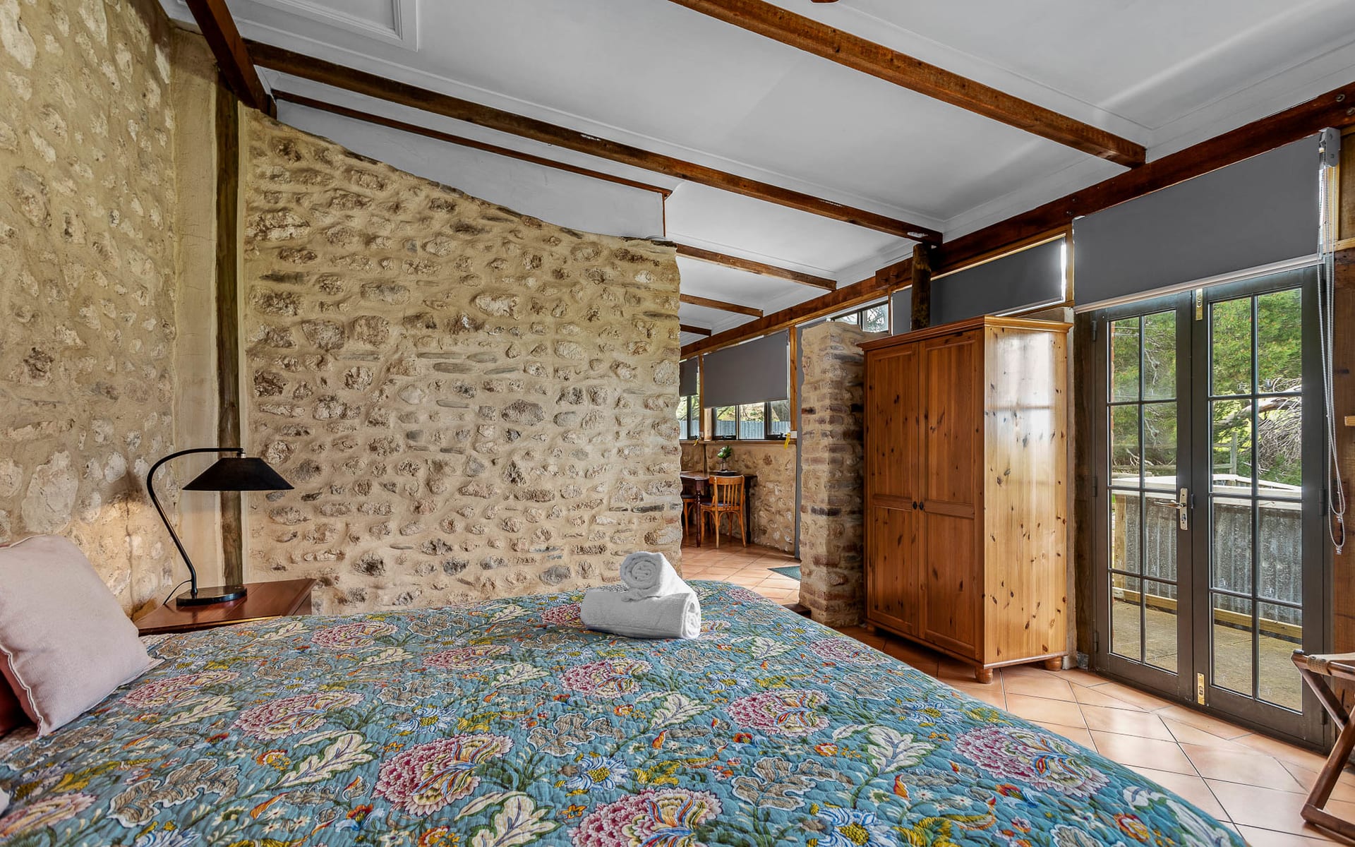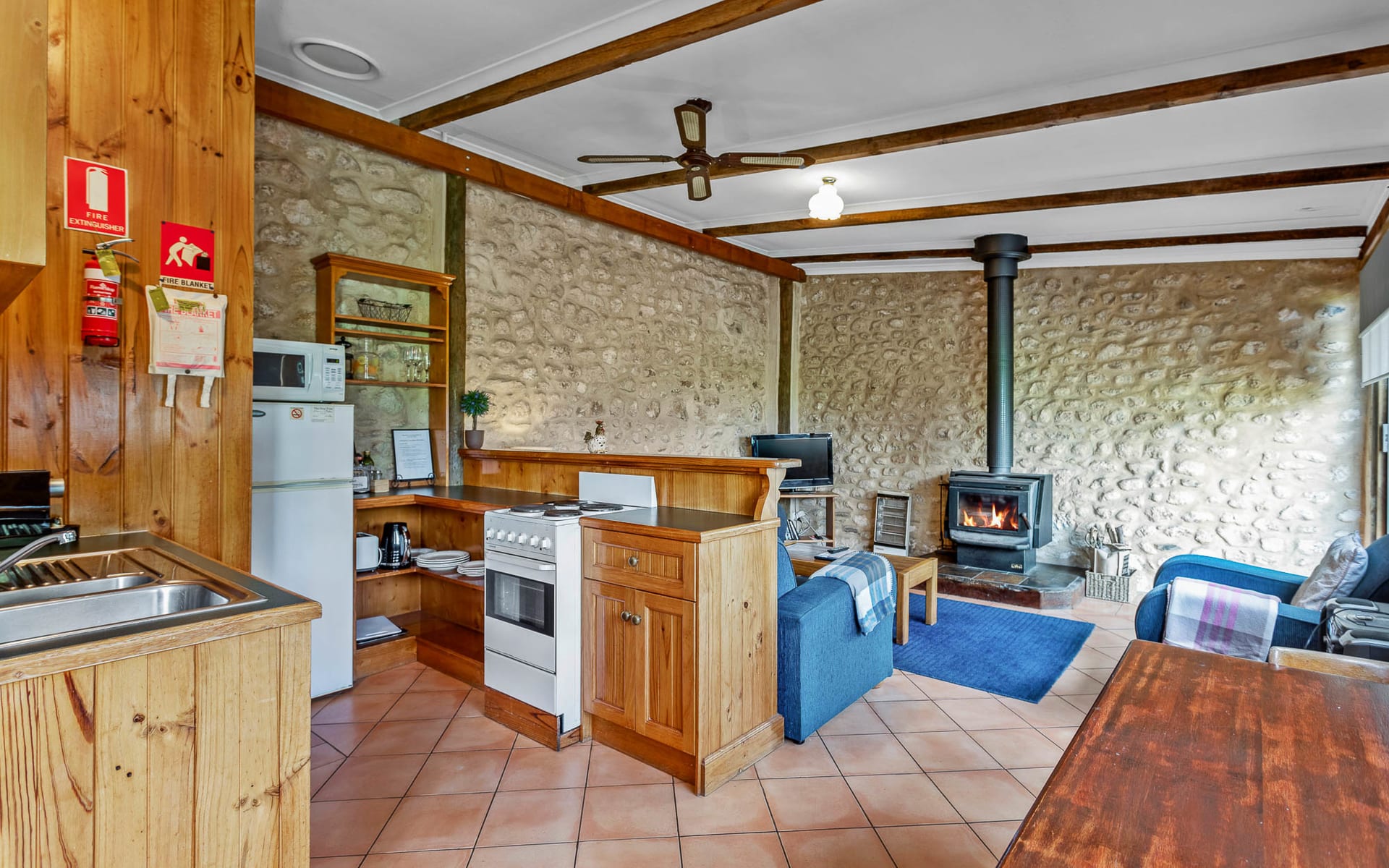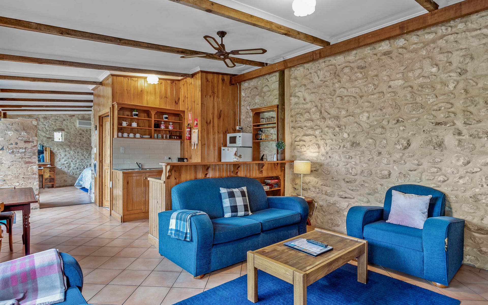 Special things happen in stables and cow sheds, and our Stables Cottage is the most unique cottage we have on the property, renovated from the original stable it has a special calm attached to it. Designed as a getaway for couples it features a king size bed in step-down bedroom that showcases the original stonework and window slots. With views from the verandah across the farmland towards Kangaroo Island from its rear courtyard you can be in your own little world. With a pleasant private bathroom and neat kitchen that overlooks the cosy lounge featuring a combustion wood fire and RC/AC, it offers a restful tranquillity in its simple and private layout.